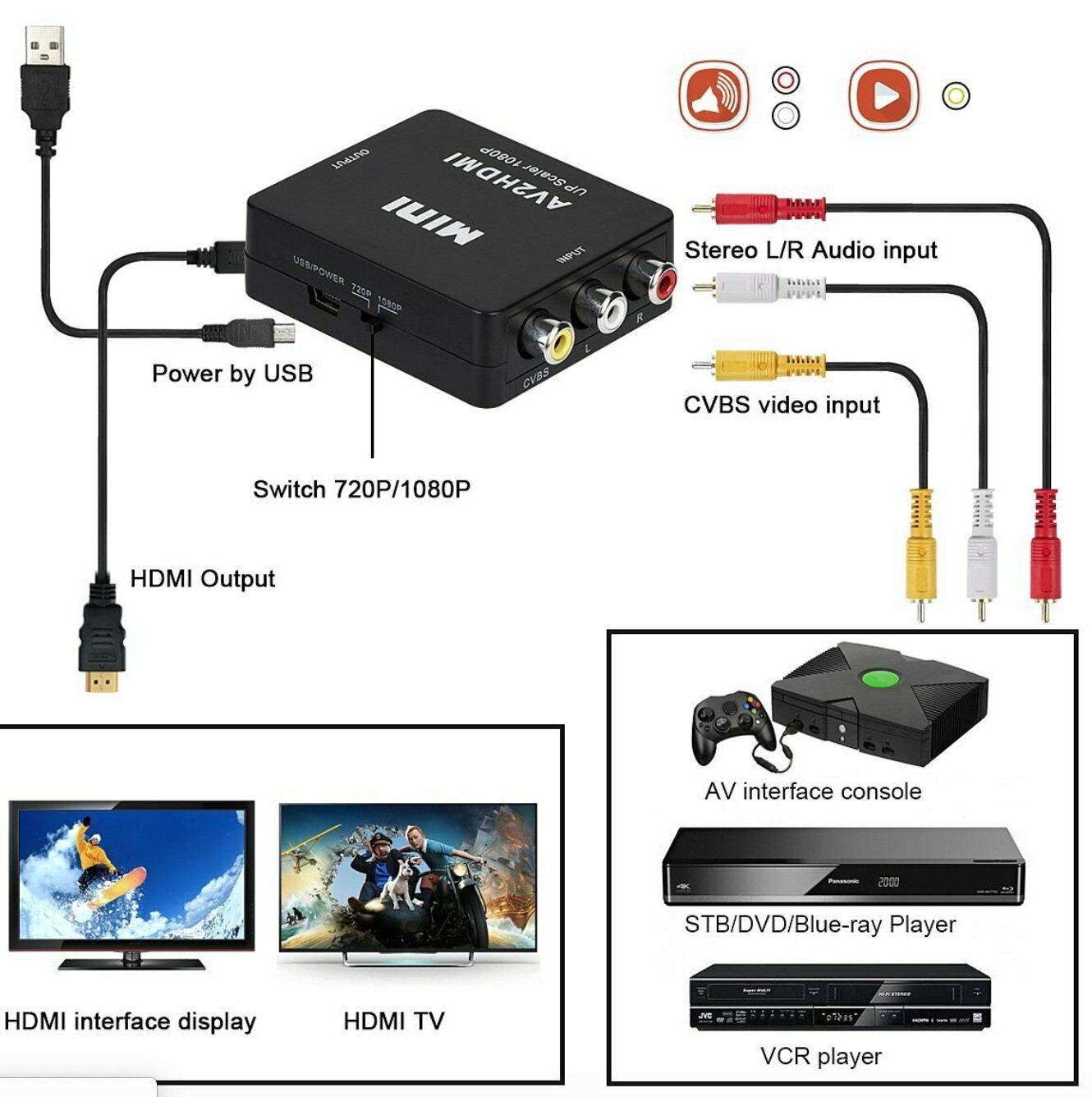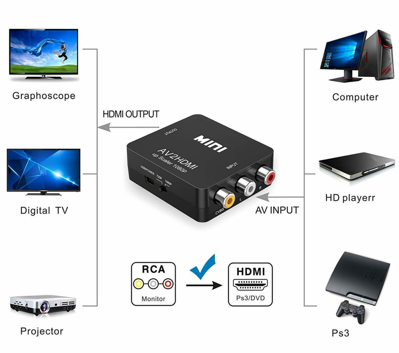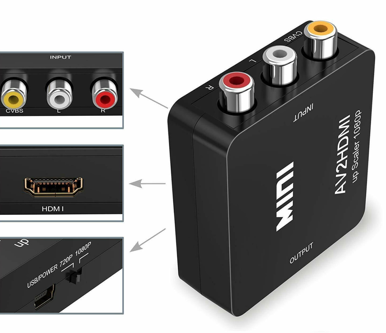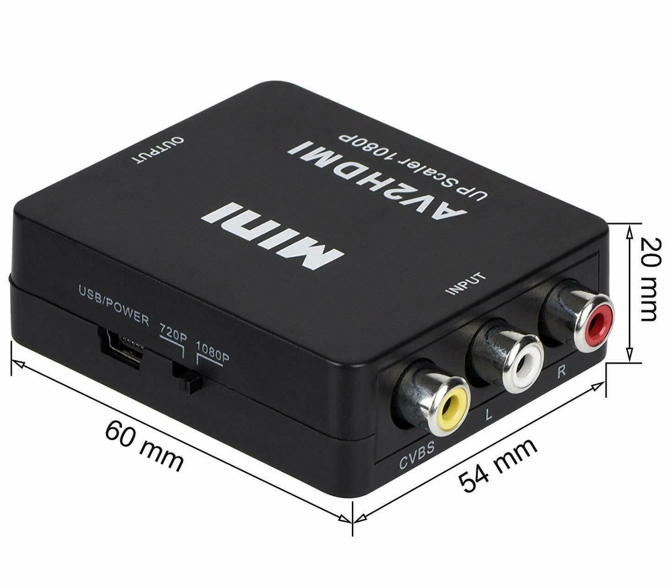 Converts analog composite input to HDMI 1080p (60HZ) output,displayed on 1080p (60HZ) HDTV/Moniter