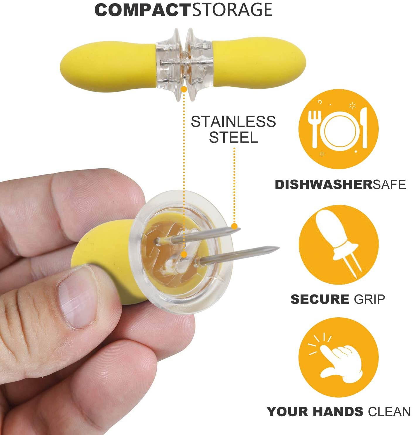 The corn holder keeps fingers safely away from hot corn with soft grip. Two-pronged corn skewers firmly attach to each end of corn ears for clean comfortable eating. Pins are made of stainless steel