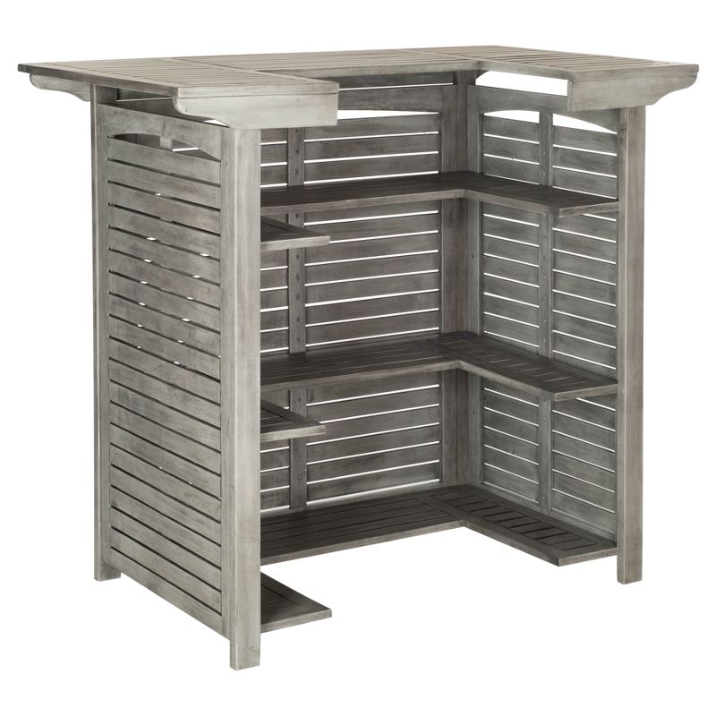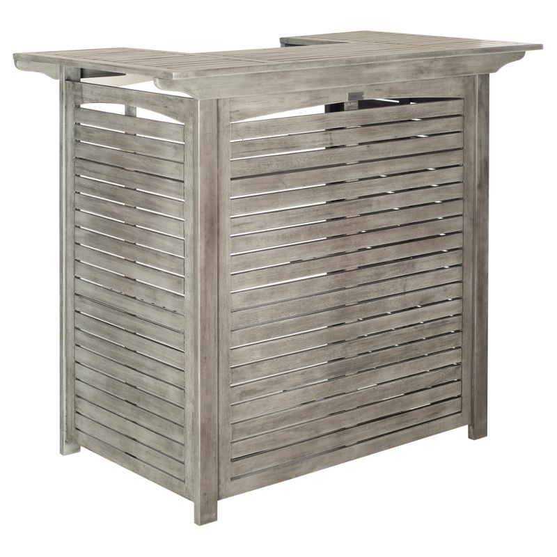 The center of attention at any outdoor party, the Monterey bar table is designed for entertaining in style. Made from eco-friendly acacia wood in a gray washed finish, its contemporary slatted construction insures quick drainage for enduring beauty. The back construction features three shelves for easy convenience for your next outdoor party. The Rectangle Monterey Bar Table fits well for all decor styles and can be used indoors and outdoors. This item does require assembly and is advised to be covered when not in use outdoors.