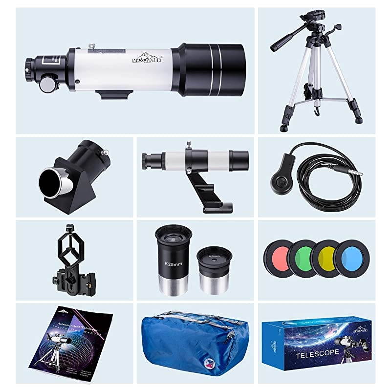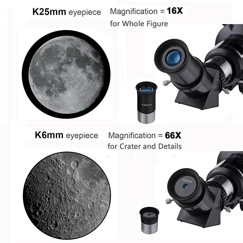 *****[Two Eyepieces] K6mm: 66x, K25mm: 16x. With lightweight aluminum alloy tripod, available for different observation targets and distance. *****[Gift Package] Accompanied with durable tripod, phone adapter, wired shutter control, moon filters. Fulfil the usage and convenience of telescope astronomy. *****[Worldwide ] 100%