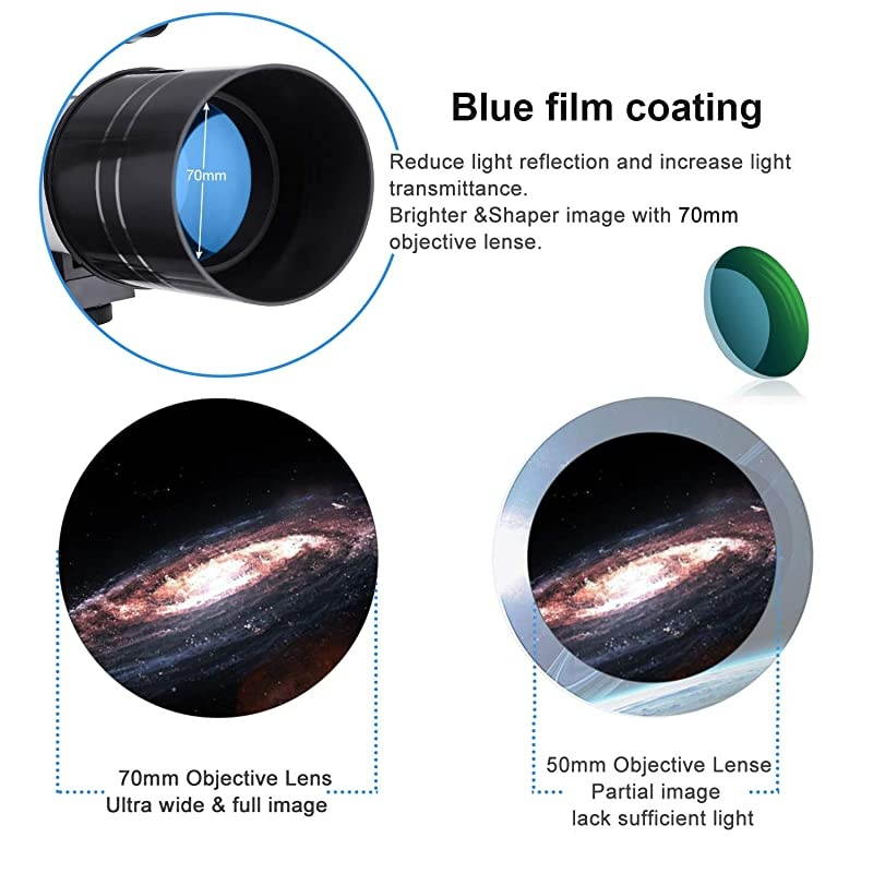***** **********Best Quality Guranteed. *****[CLEAR View] 70mm large-diameter, blue film coating, 98. 9% transmittance, suitable for astronomy and geography observation. *****[SIMPLE Setup] Ergonomically designed hand wheels; beginners and children can also set up easily.