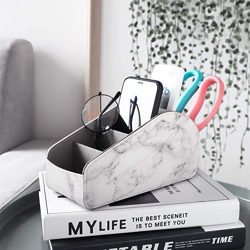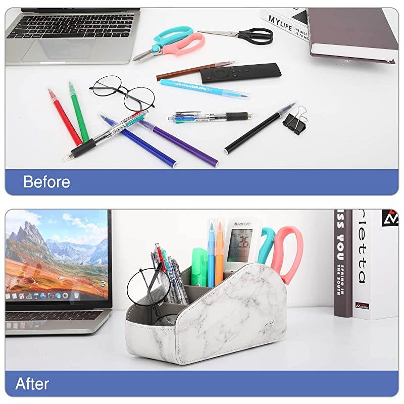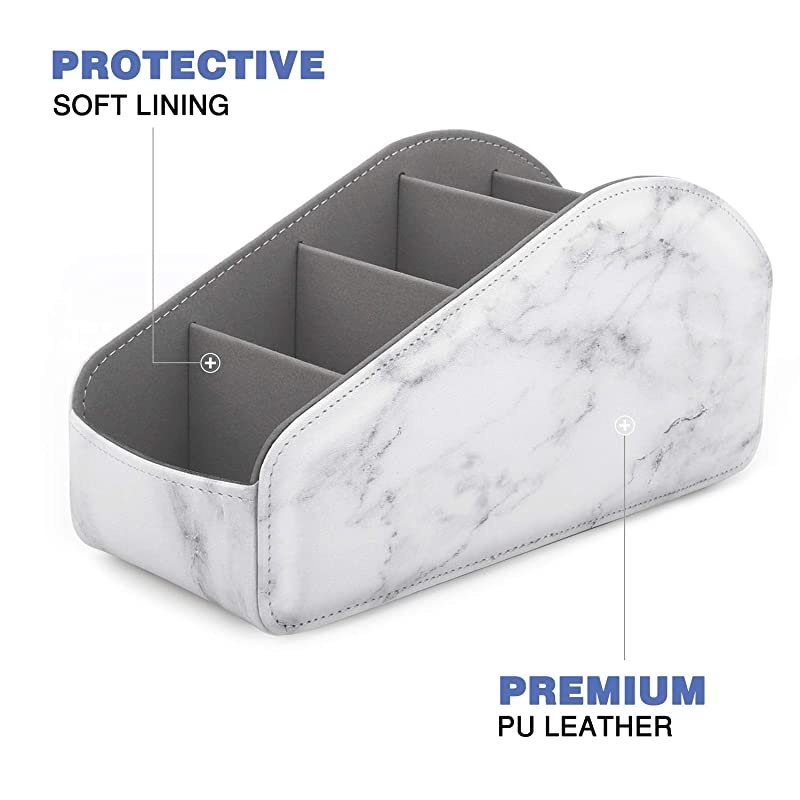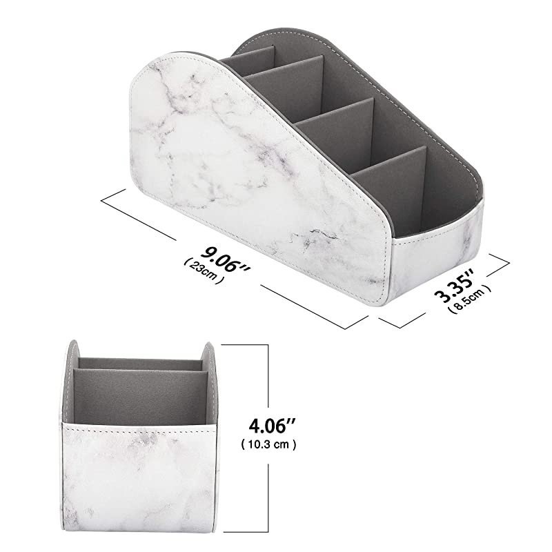 ***** **********Best Quality Guranteed. *****Get Organized - 5 divided compartments to organize your office supplies, pen, pencil, scissors, remote control, cell phone and cosmetics or other small sundries. This organizer helps to keep your desk tidy and makes it easy to reach all your needed remotes or office supplies. *****Premium Quality - Constructed with the high-density board, covered with durable PU leather exterior and soft microfiber lining interior for lasting performance. Wear-resistant and durable, soft and comfortable, safe and environmentally friendly. *****Perfect Size - 9.06 (L) x 3.35 (W) x 4.06 (H) inches.