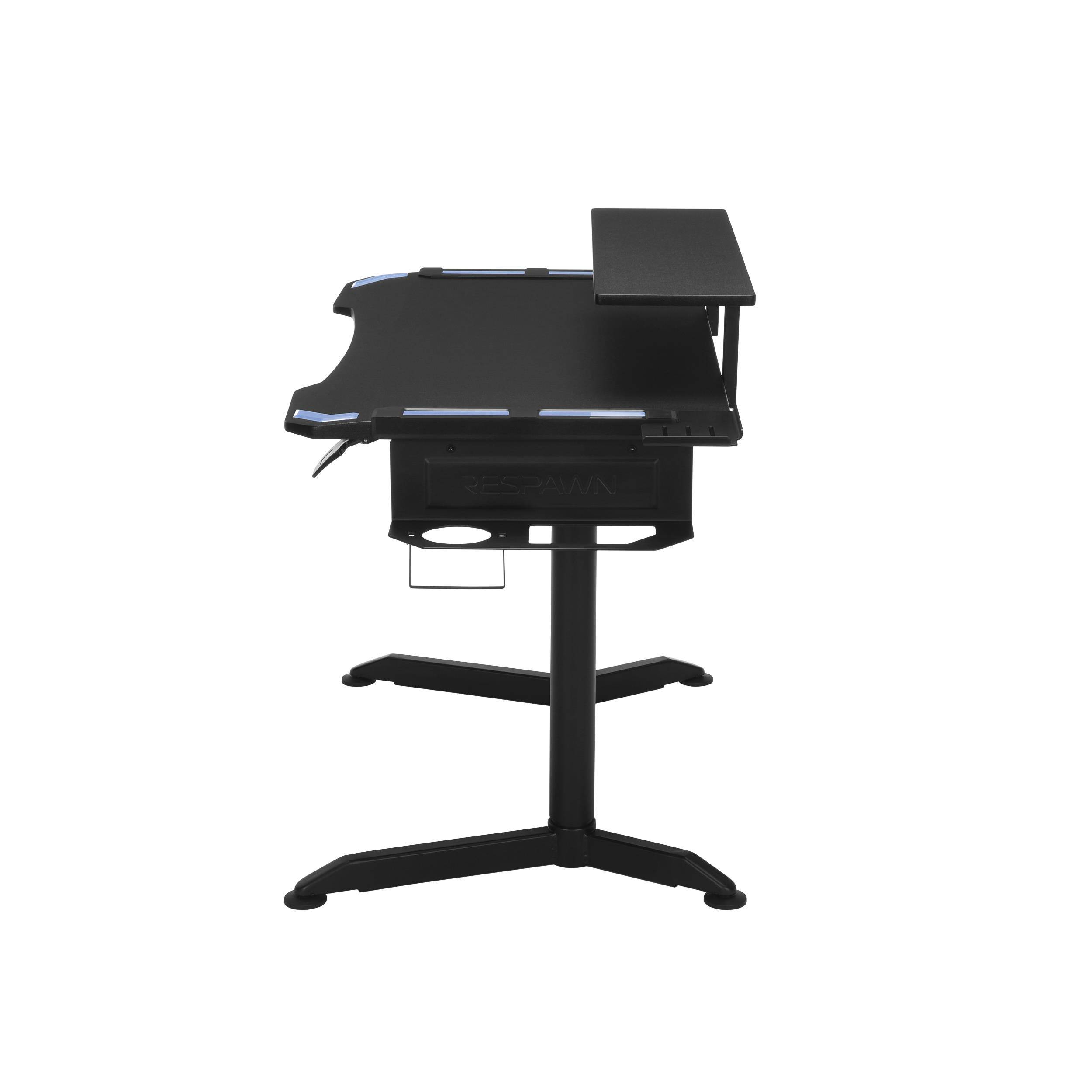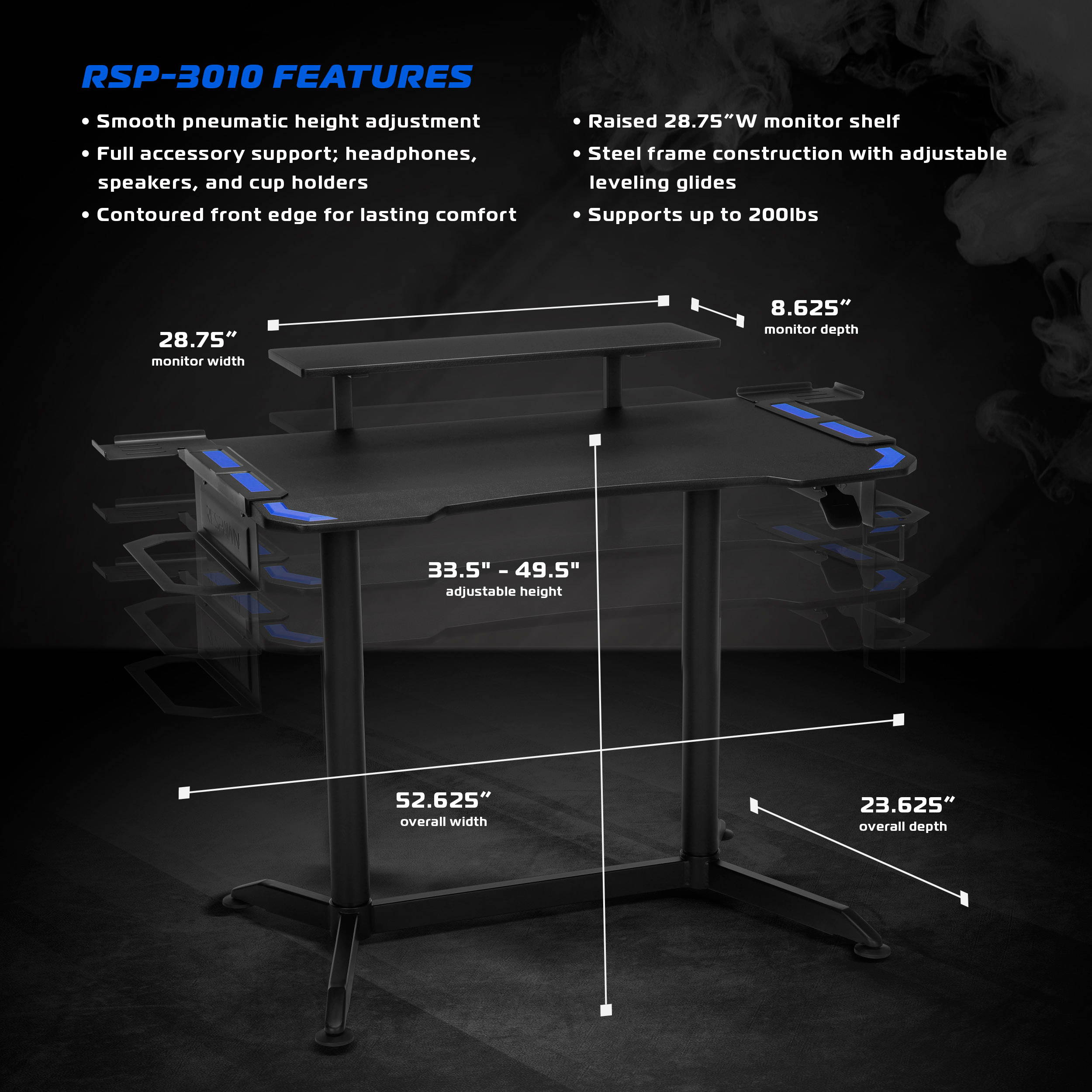 Take your game to new heights with the RESPAWN® 3010 Gaming Computer Desk, in Blue, with pneumatic height adjustment. This ergonomic desk allows you to go from sitting to standing with the touch of a lever. Controlled by pneumatics, the desk height starts at 28.125" and can rise up to 43.875", providing super smooth movement. The ergonomic features also include a beveled front edge for a comfortable place for your arms to rest and a back-mounted monitor shelf positioned at eye level to prevent head and neck strain. Accessories like headphones, speakers, and drinks all have their own place, at the sides of table, to provide the maximum usable desk space. An award-nominated brand, RESPAWN is committed to your satisfaction and covers this desk with our RESPAWN Limited Warranty. Easily turn your battlestation into the envy of your friends with the RSP-3010.