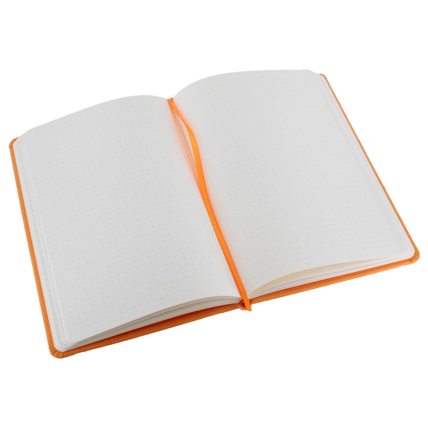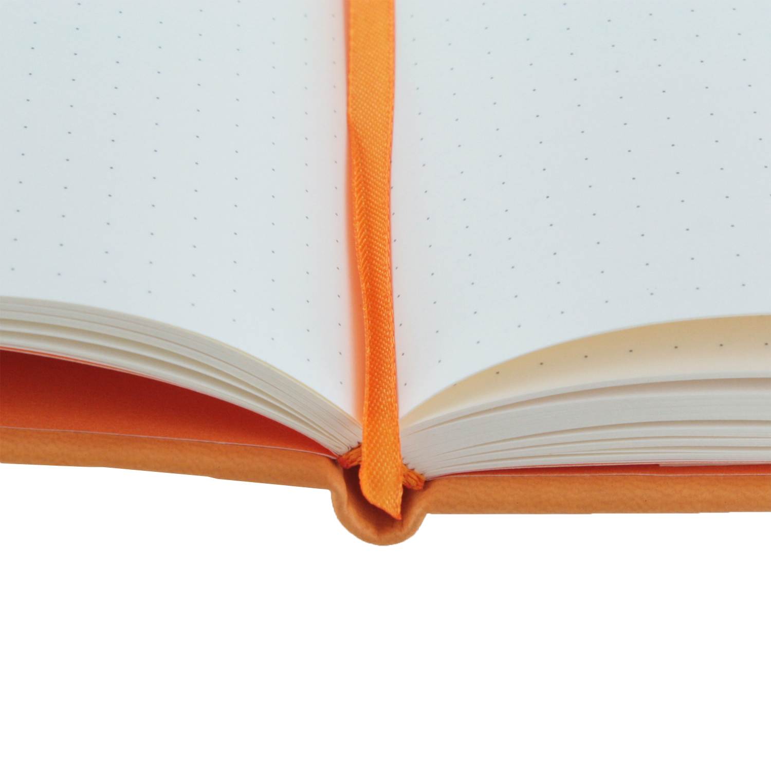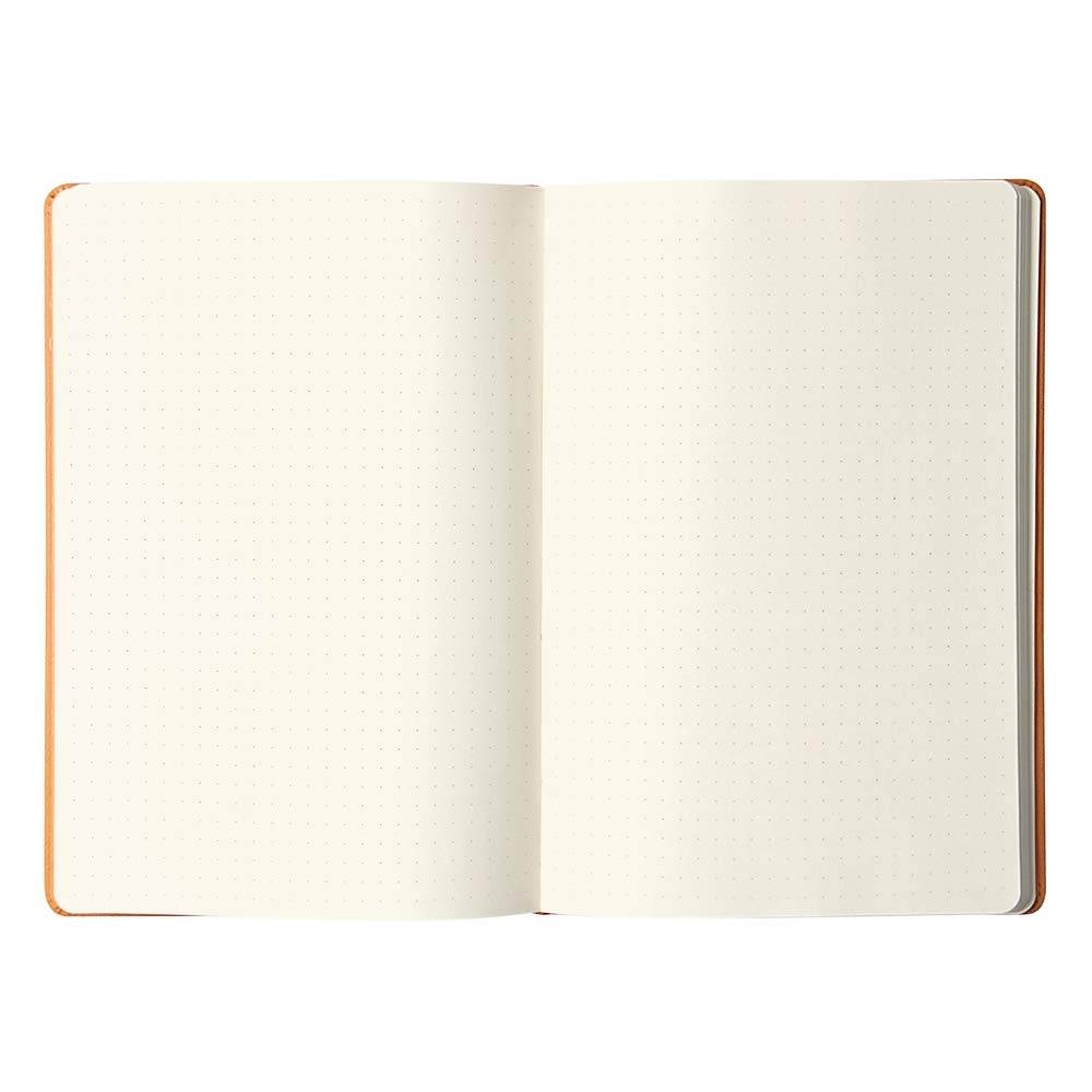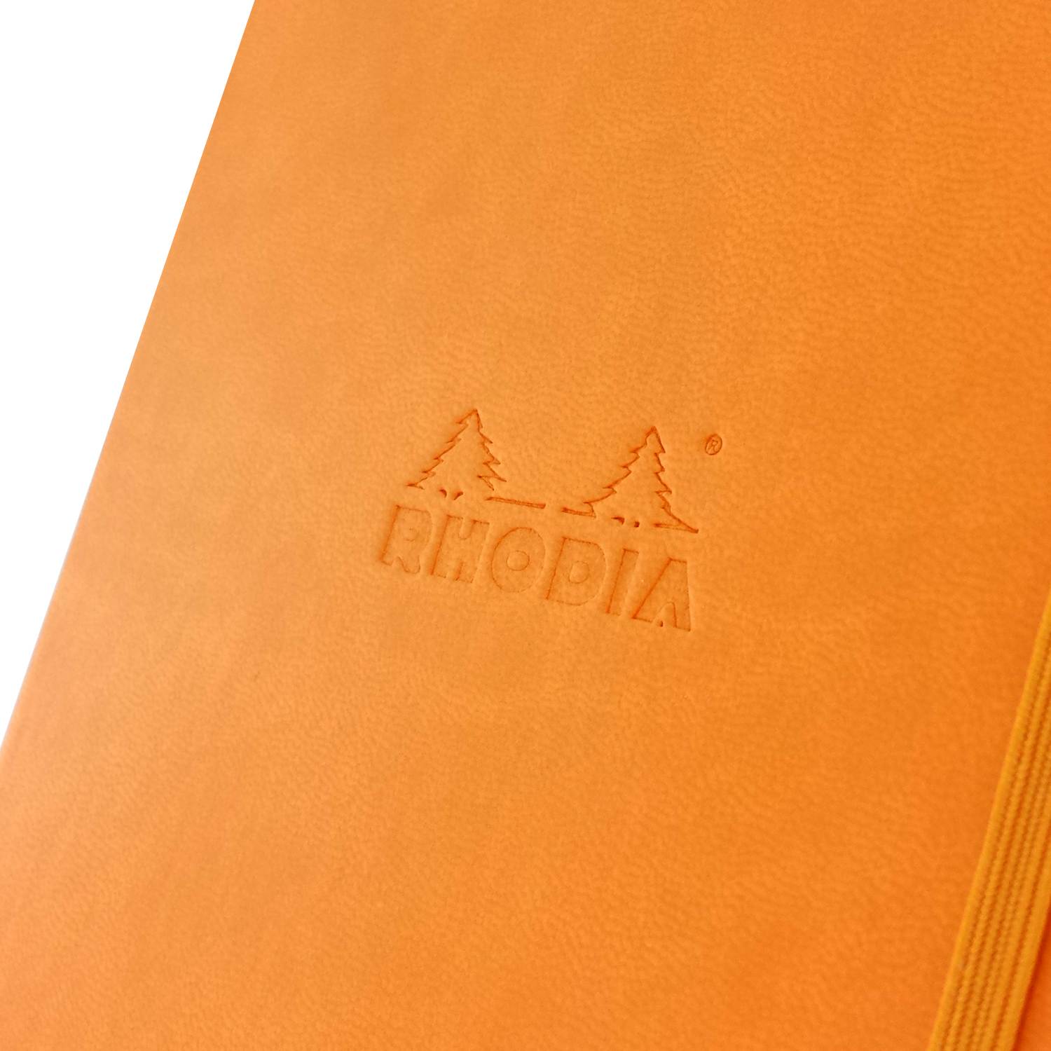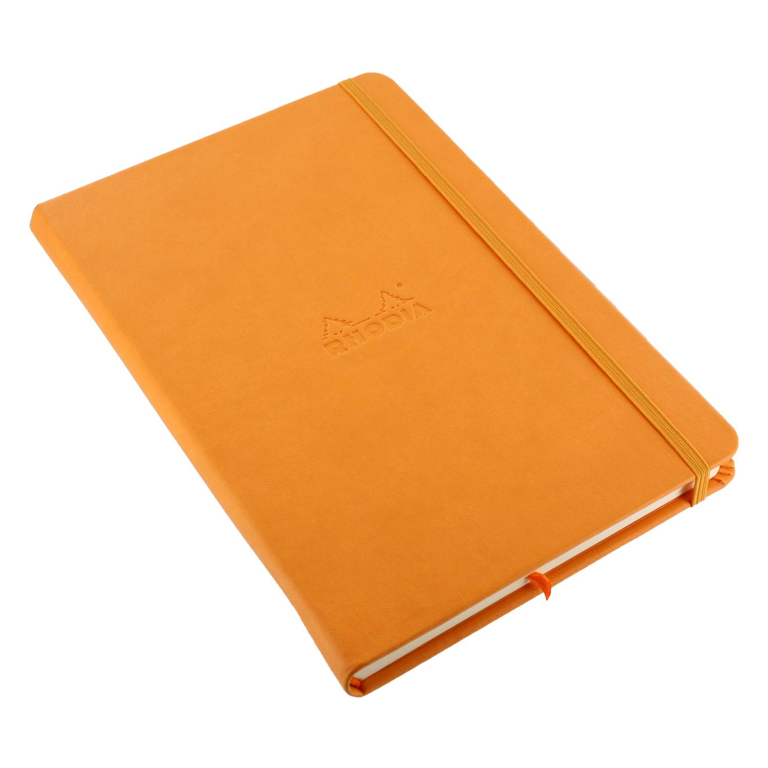 The Rhodia Webnotebook has a modern design with an embossed, Italian leatherette cover and 96 sheets of ivory paper inside. Also features an inner expandable pocket, elastic closure, and ribbon marker in corresponding cover color. Measures 5.5x8.25 inches and has dot grid. Orange cover