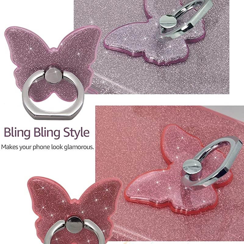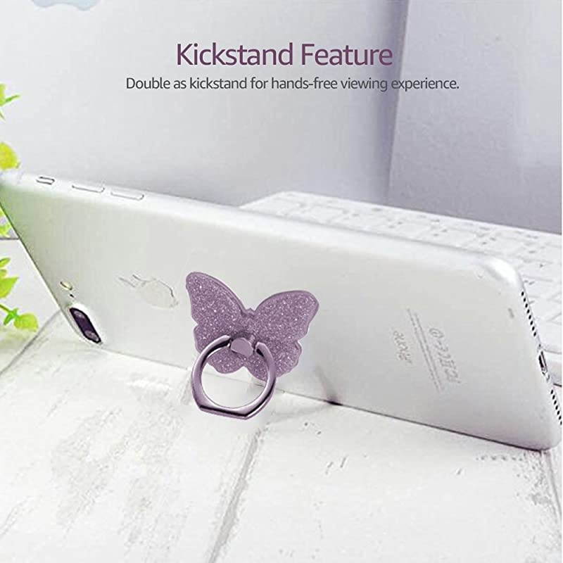 Color: Butterfly, Purple+Pink Glitter 360 Degree Rotation Phone Stand Holder Grip Kickstand Universal Smartphone Ring Creative Design *Stylish design, lovely heart shape, the perfect blend of your phone, tilt, wrap, prop, collapse, grip, repeat, will bring you wonderful experience. High Quality Materials *Top-rated TPU and stainless steel. Flexible TPU have good ductility, avoid breaking it when fall down, stainless steel is sturdy and hold the ring firmly, help it become a long-term good stand. Ergonomic Profile *Simple but ergonomic, elegant radian design makes it look good with fluid movement of the ring itself. * ring is lightweight and stylish. The inner silicone cushioned inside of the ring will bring you a comfortable grip, and make it easy to hold your phone. Applicable for Various Devices *Our ring holder can be used for various models, like iPhone, iPad, Samsung galaxy, Google Pixel, and so on. Convenient and Stylish * ring holder makes you feel comfortable and secure holding your phone when you wonder around the street or doing something else. Installation Instructions 1.