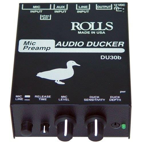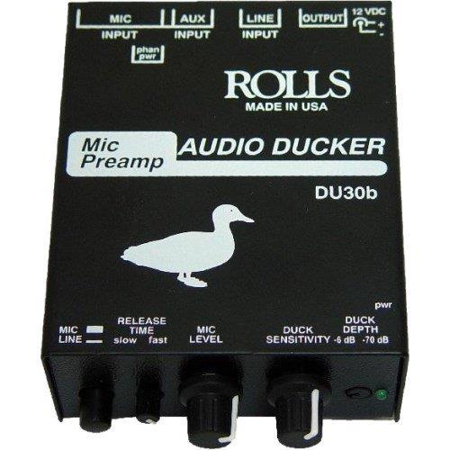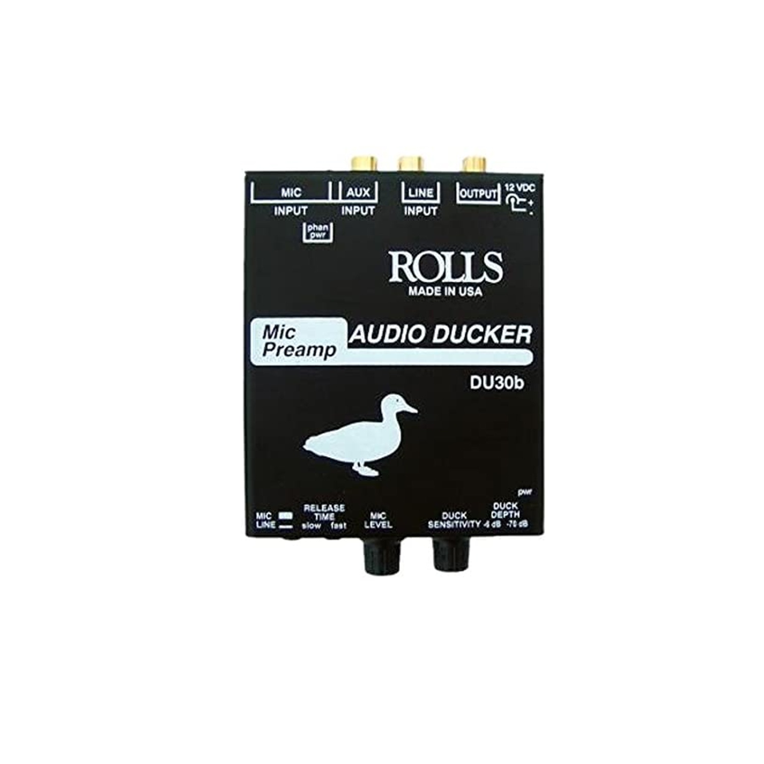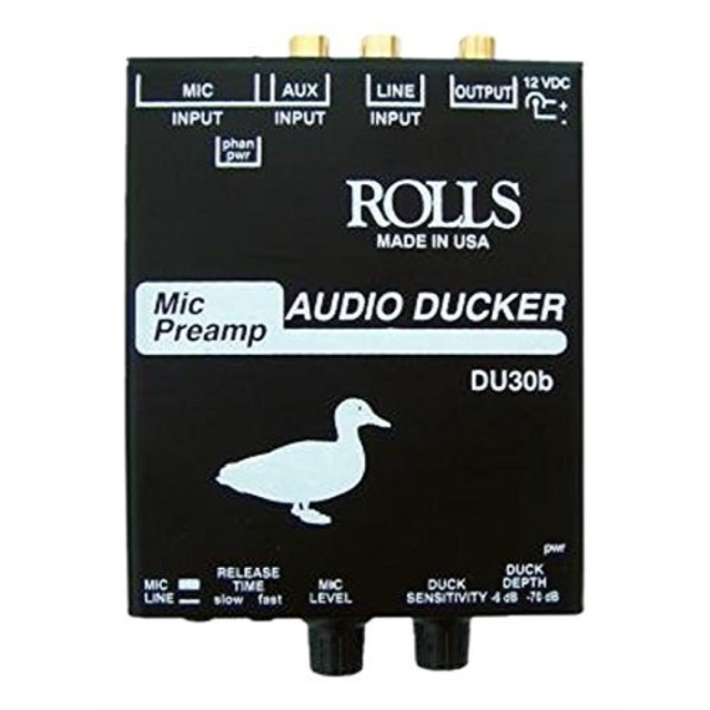 The easy to use Rolls DU30B Audio Ducker with Microphone Preamp is designed for a small club, restaurant, or store where voice paging is required to be heard over background music. The unit inputs the music source via a pair of RCA inputs, while the microphone is connected via an XLR input that can supply +12V phantom power.