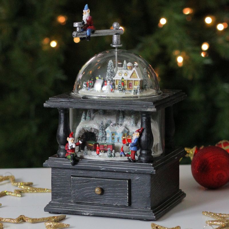 It's time to jump for joy as the season of goodwill is here! Add this charming holiday decorative piece, delineating a cheery Northpole winter scene with elves, Santa's cottage in the woods, and a tiny locomotive on train tracks. With an in-built musical function, enchantment is never a question with this impressive accent.