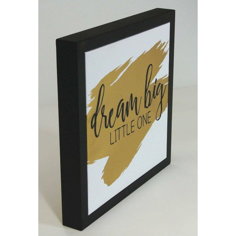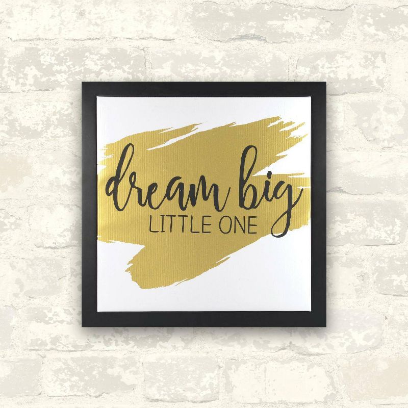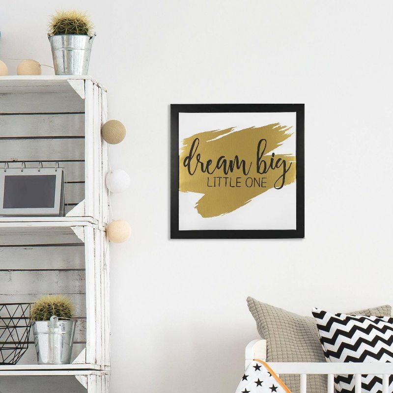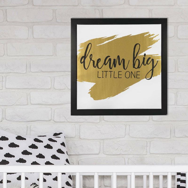 Inspire even the tiniest of tots with the Dream Big Little One Framed Canvas by Linden Ave. Little ones have big dreams, and the sky’s the limit, when a back cursive and print combination states “Dream Big Little One” across an artist’s brushstrokes rendered in gold print on a matte white canvas wrap float within a black surround. Start early; dream big and dream often.