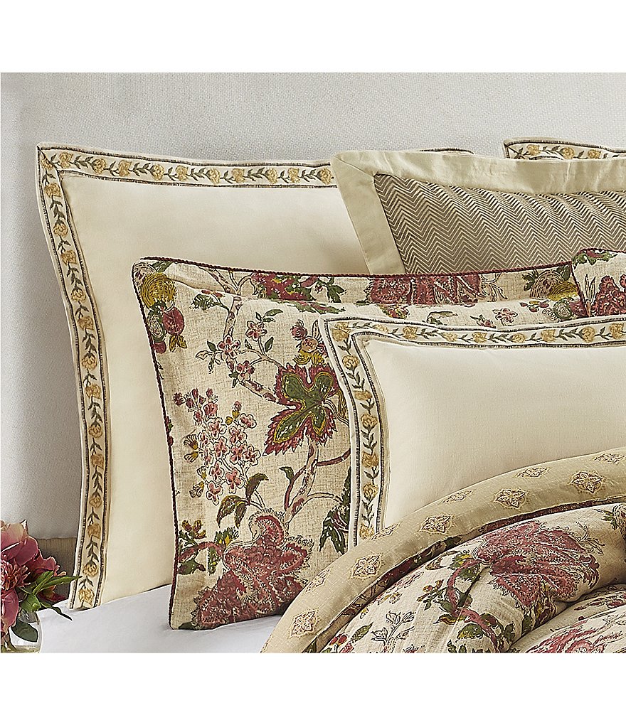 - An allover distressed vintage floral in the center with a floral board in tones of raspberry, red, olive green, taupe and a touch of honey gold on a cream ground