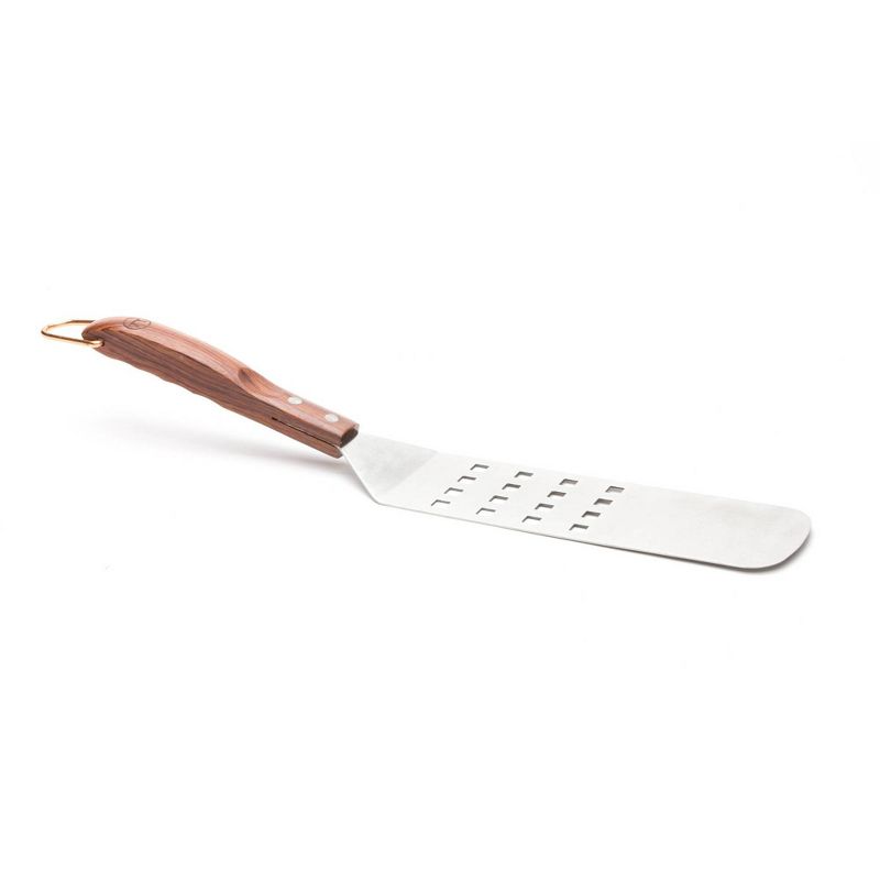 The accustomed griller will be primed to barbecue with this practical and dependable flex griddle spatula. The flex performance precisely handles even the most delicate, hard to flip foods. The ergonomic rosewood handle provides optimal comfort and control while the stainless-steel construction harnesses impeccable durability.