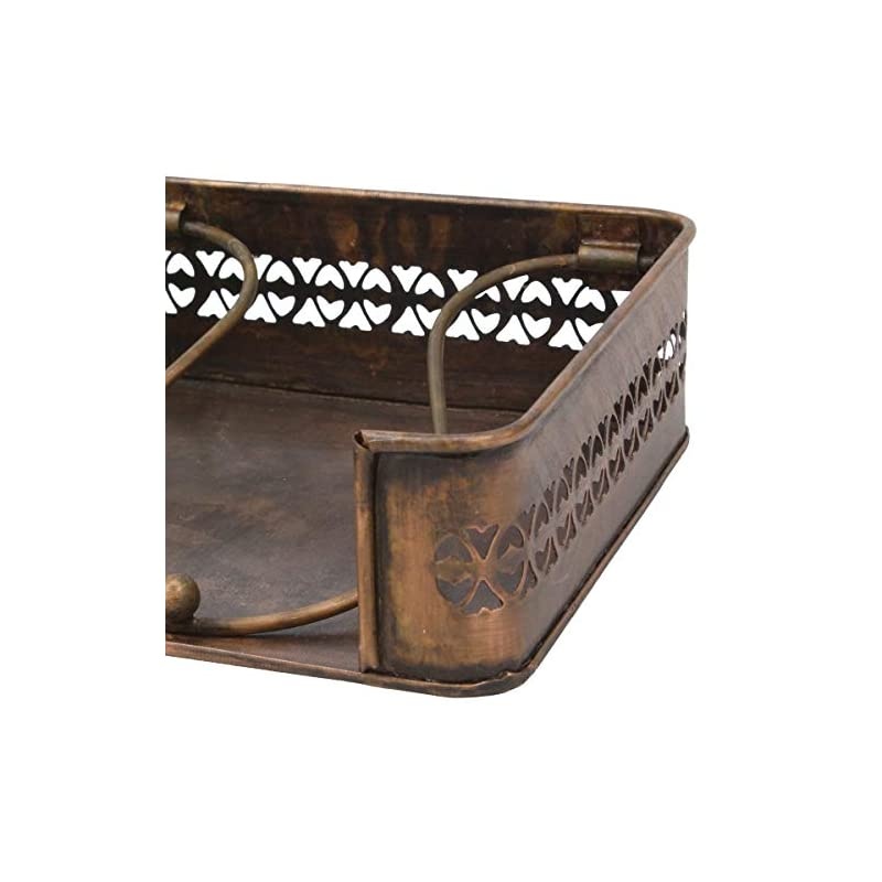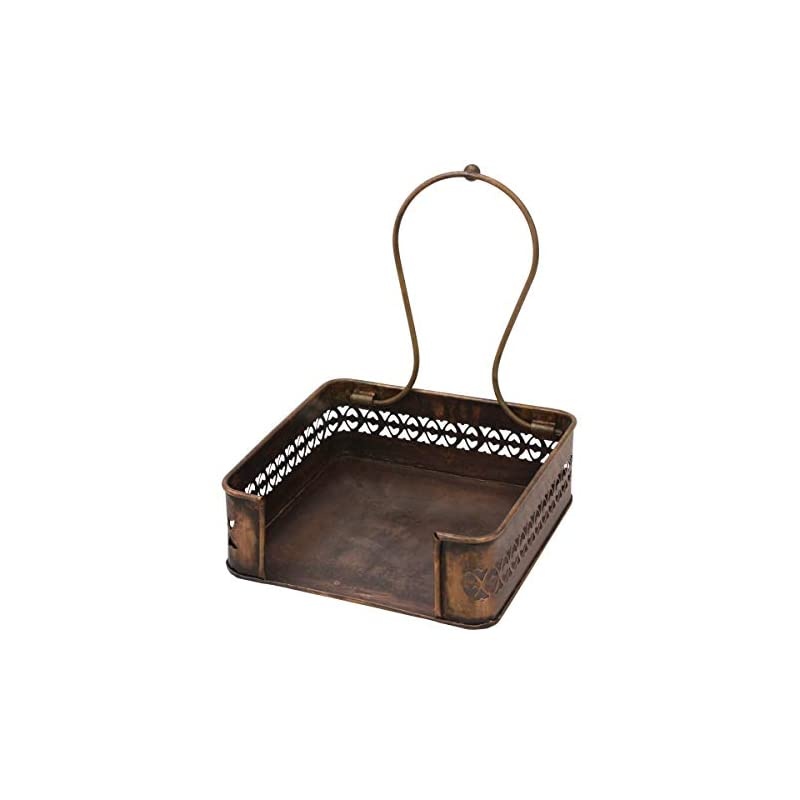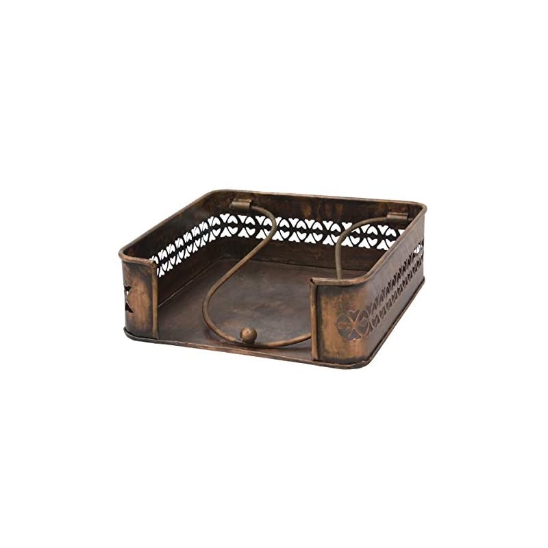 Color: Copper Add a piece to your home decor that is stylish and functional With a rustic Copper metal napkin holder. This unique napkin dispenser features an industrial Distressed Copper metal finish with decorative cutout trim and a swivel handle to keep your napkins or tissues in place. Napkin holder measures 7. 1 inches by 7. 1 inches and can be displayed Horizontally. Holder can easily fit dinner or cocktail napkins, Bath tissues, Coasters, and small memos. Display your napkin holder on the kitchen counter or dining table or use it as a tissue dispenser for your vanity or bathroom. This unique napkin holder works great alone or you can mix and match it with other rustic collection pieces to complete your industrial or farmhouse home decor. Buy a napkin holder for yourself or give one as a gift for weddings, Christmas, birthdays, or housewarming parties.