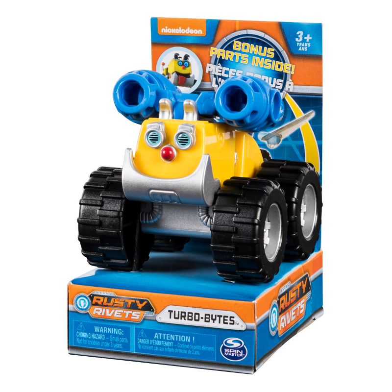 Bring home the fun and excitement of Rusty Rivets with Rusty Racers! Collect them all and recreate your favorite adventures from the show! In this Racer, Turbo-Bytes is raring to go! Complete with working wheels and bonus parts, he's ready to be combined and designed! Snap on the bonus parts and zip through Sparkton Hills with the Turbo-Bytes Racer!
