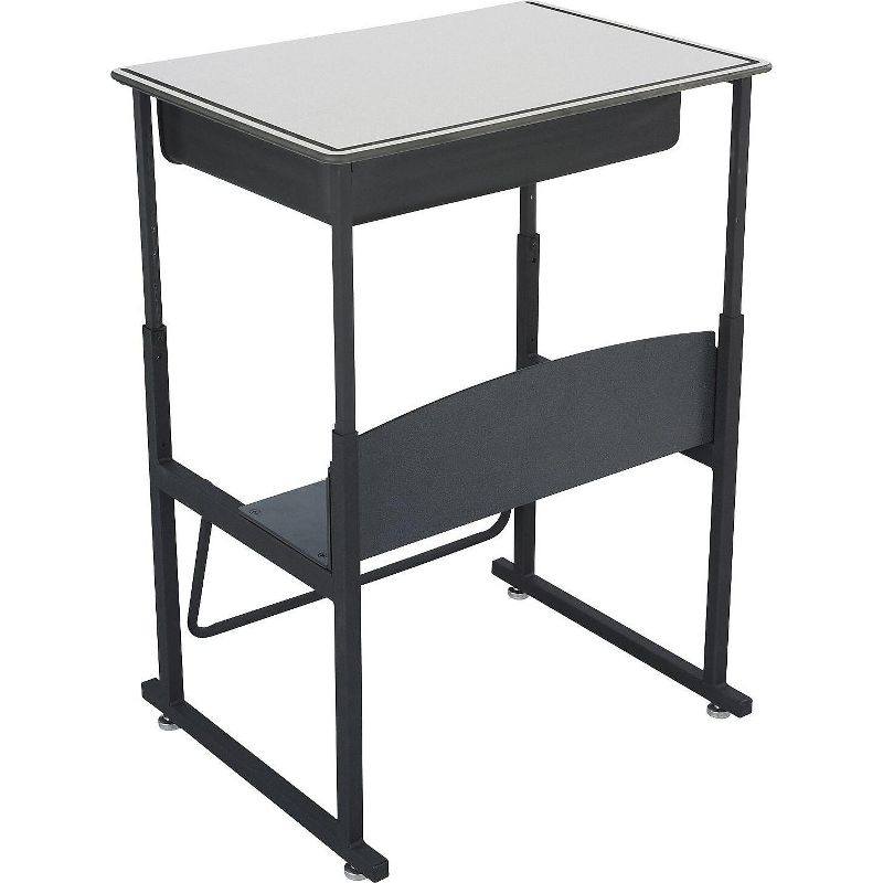 Phenolic (laminated plastic) desktops are durable and chemical, fire and impact resistant. 26" - 42"H x 28"W x 20"D. Steel frame with black powder coat finish for durability, gray premium top. Desk adjusts from 26" to 42" high; adjustable in 1 1/4" increments. Desk designed for students in grades 3-12. Lower shelf provides additional storage for supplies and books. Patented Swinging Pendulum Footrest Bar allows natural movement while standing at desk. Patent nos. 8061278 and 8291833. Phenolic (laminated plastic) desktops are durable and chemical, fire and impact resistant. 26" - 42"H x 28"W x 20"D. Steel frame with black powder coat finish for durability, gray premium top. Desk adjusts from 26" to 42" high; adjustable in 1 1/4" increments. Desk designed for students in grades 3-12. Lower shelf provides additional storage for supplies and books. Patented Swinging Pendulum Footrest Bar allows natural movement while standing at desk. Patent nos. 8061278 and 8291833. Sold as 1 Each.