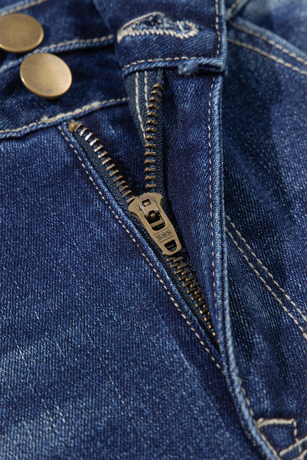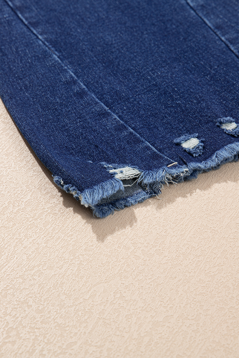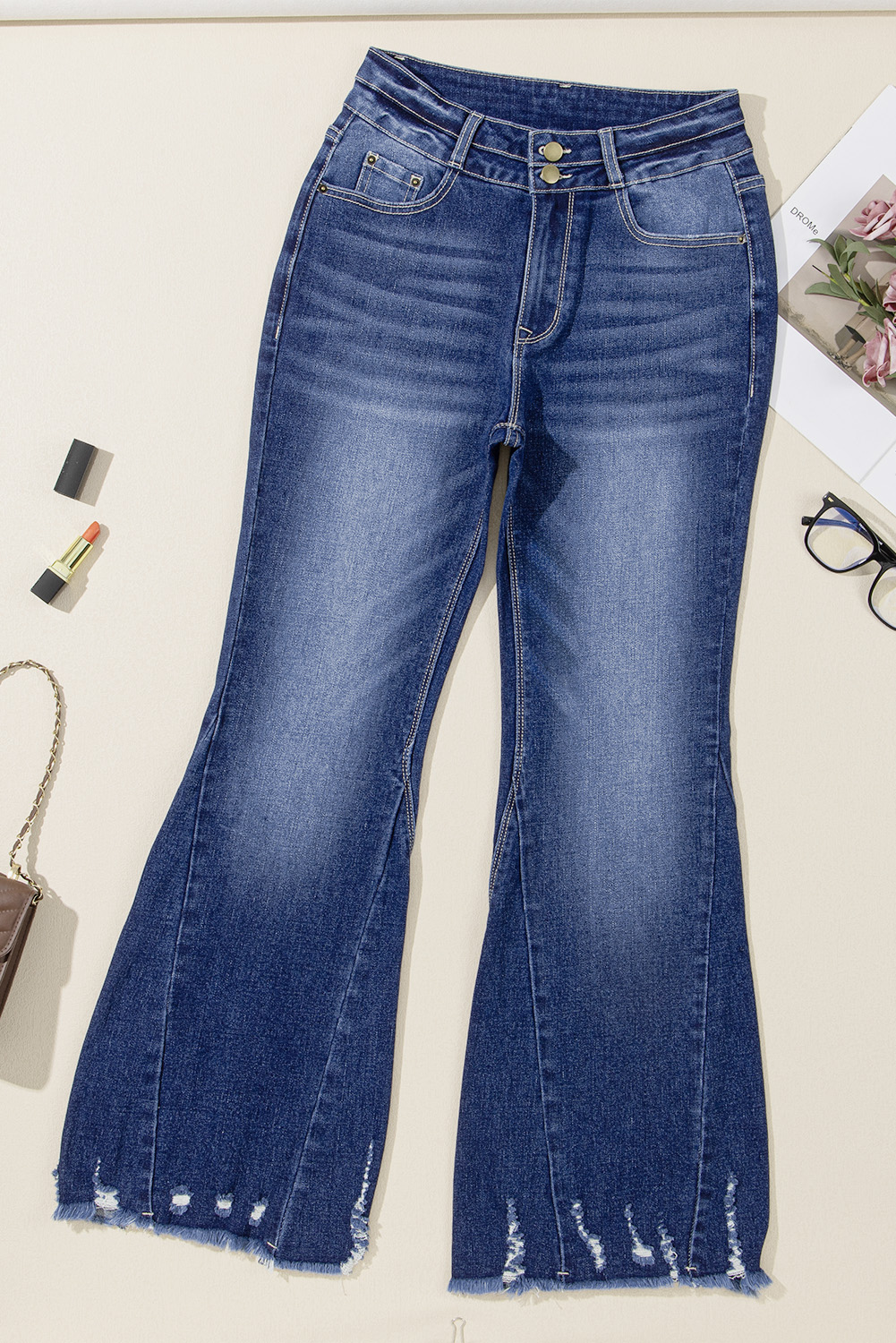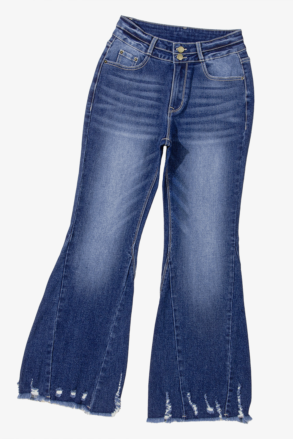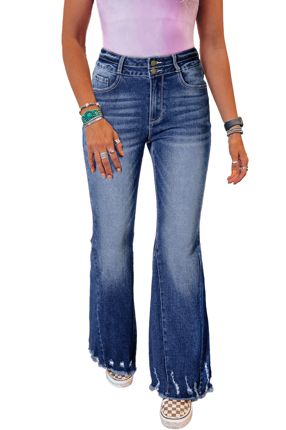 • Elevate your denim game with our Sail Blue High Rise Dual Button Distressed Raw Hem Flared Jeans, perfect for a casual yet stylish look.