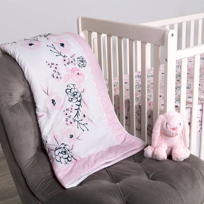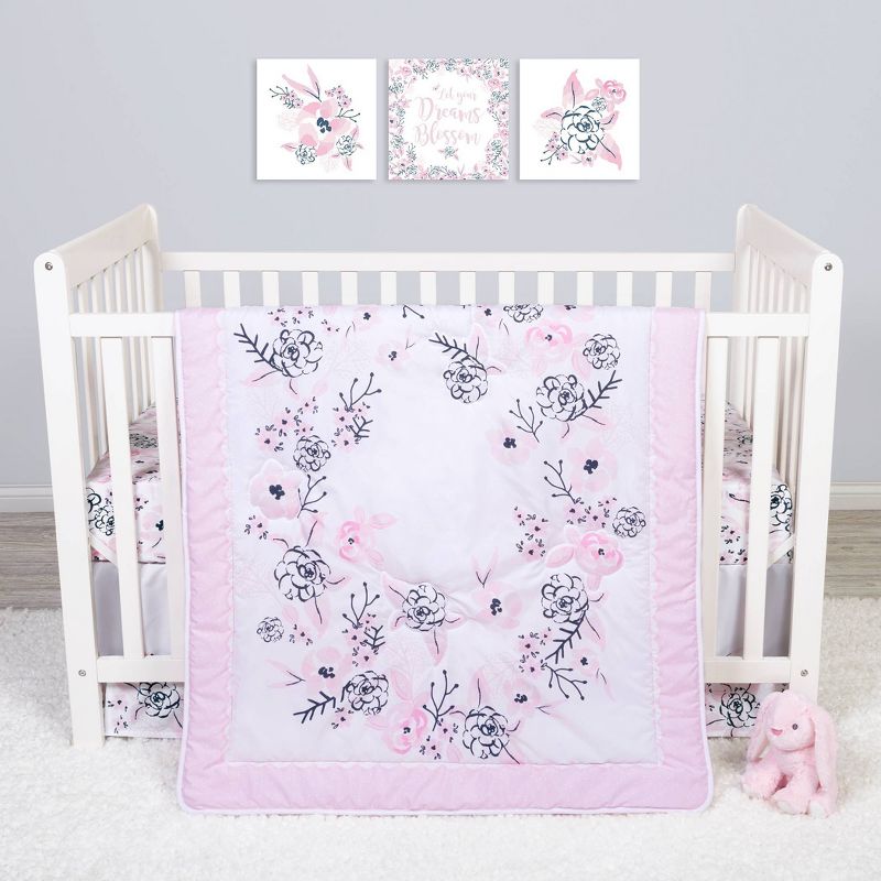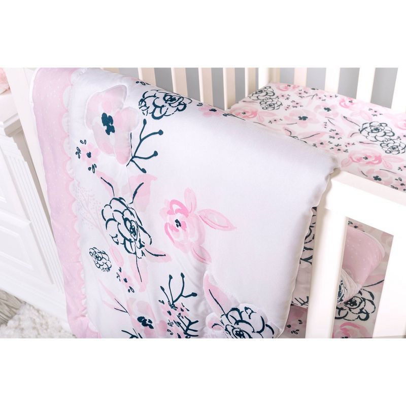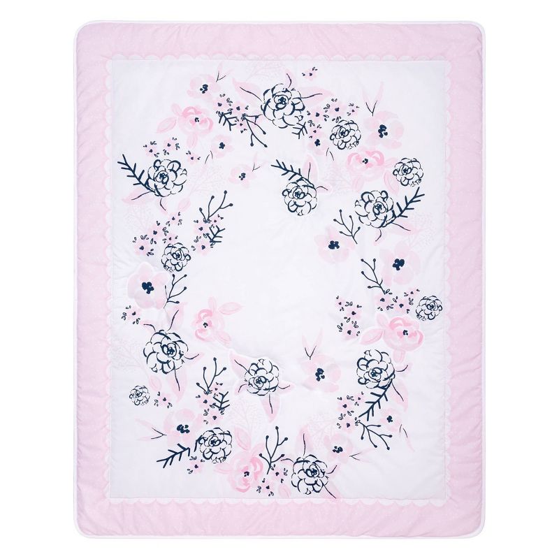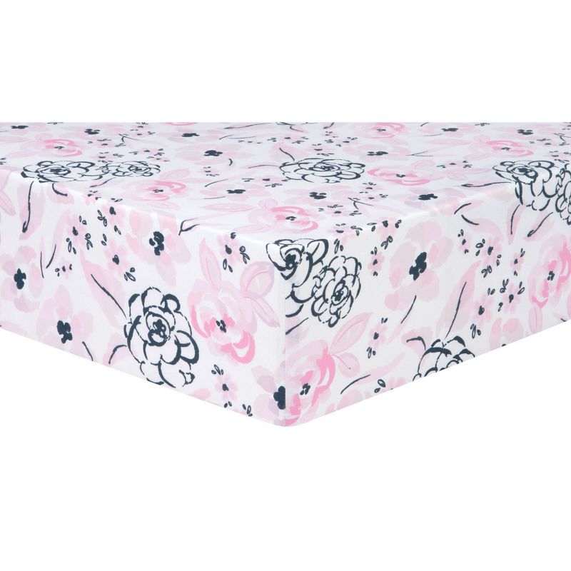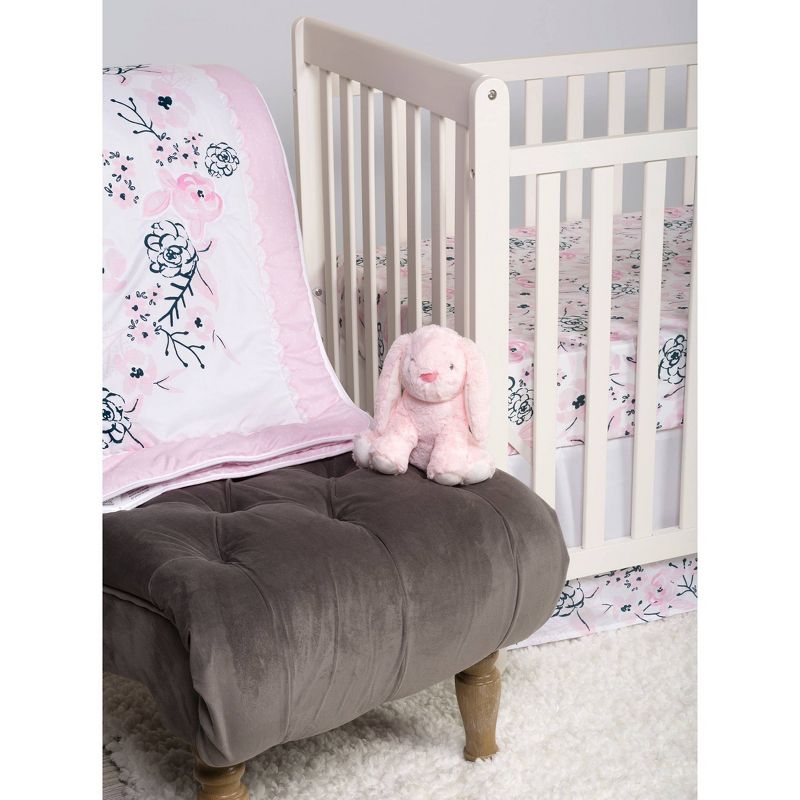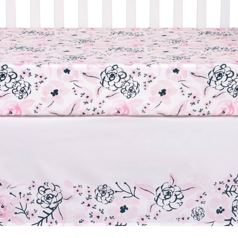 Add a touch of elegance to your little one’s nursery with the Simply Floral collection by Sammy and Lou. The watercolor floral ring makes for the perfect photo opportunity to track all of your baby’s adorable milestones. The navy and soft tonal pink color palette is perfect for any little girl! Please adhere to JPMA's Safe Infant Bedding Practices. Crib Skirt fits standard crib mattress 28 in x 52 in with 14-inch drop and features a mini floral print.