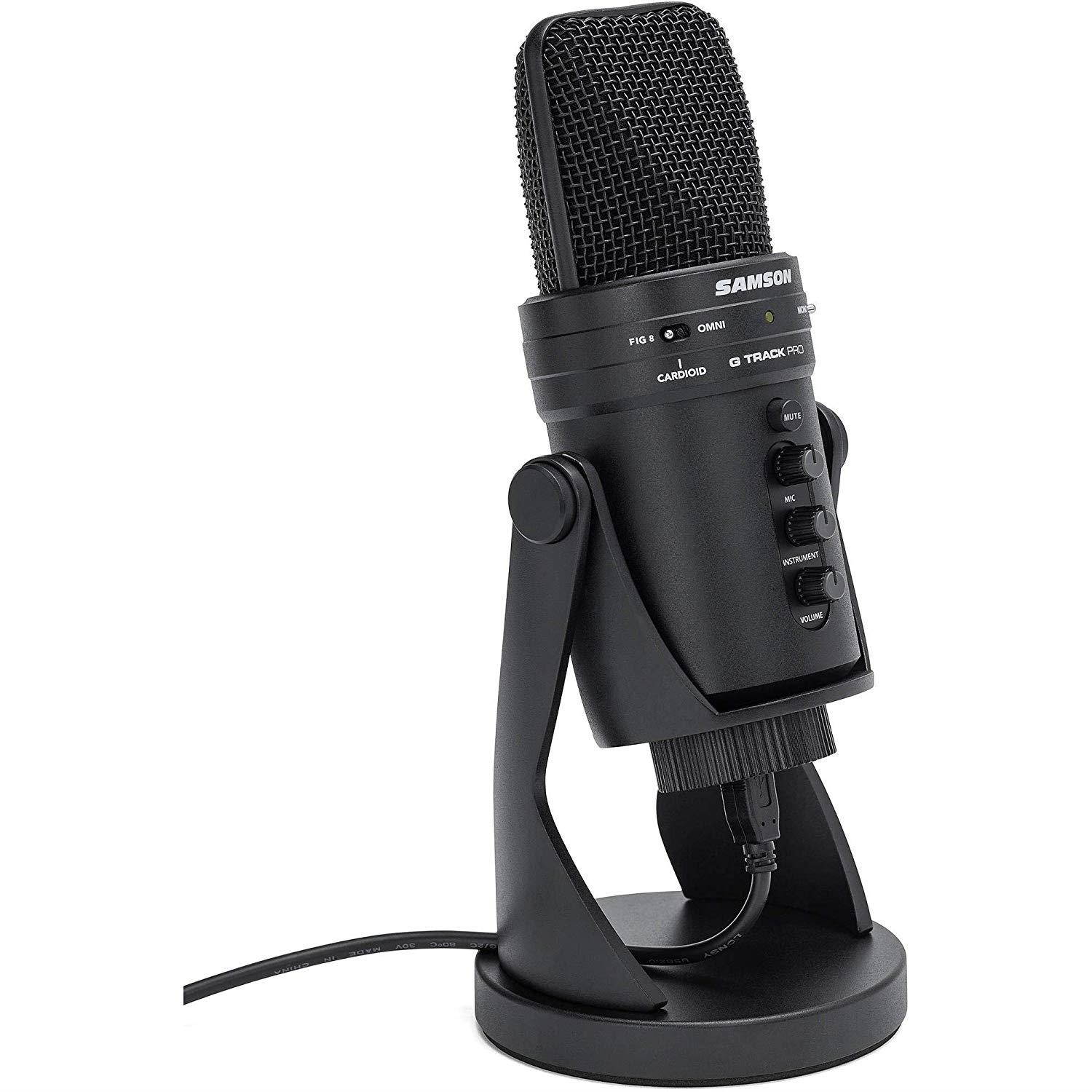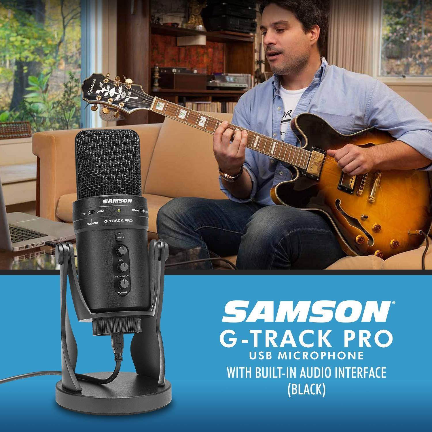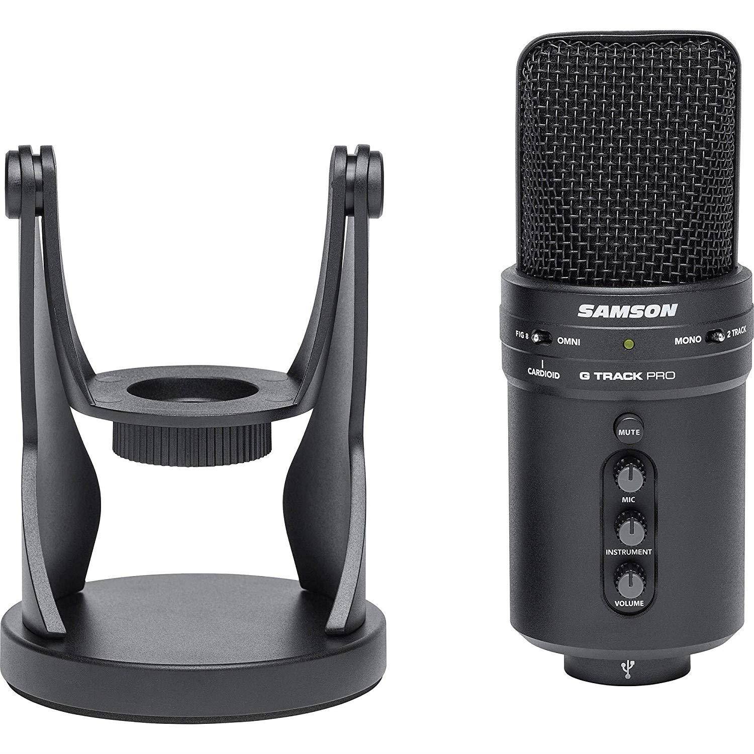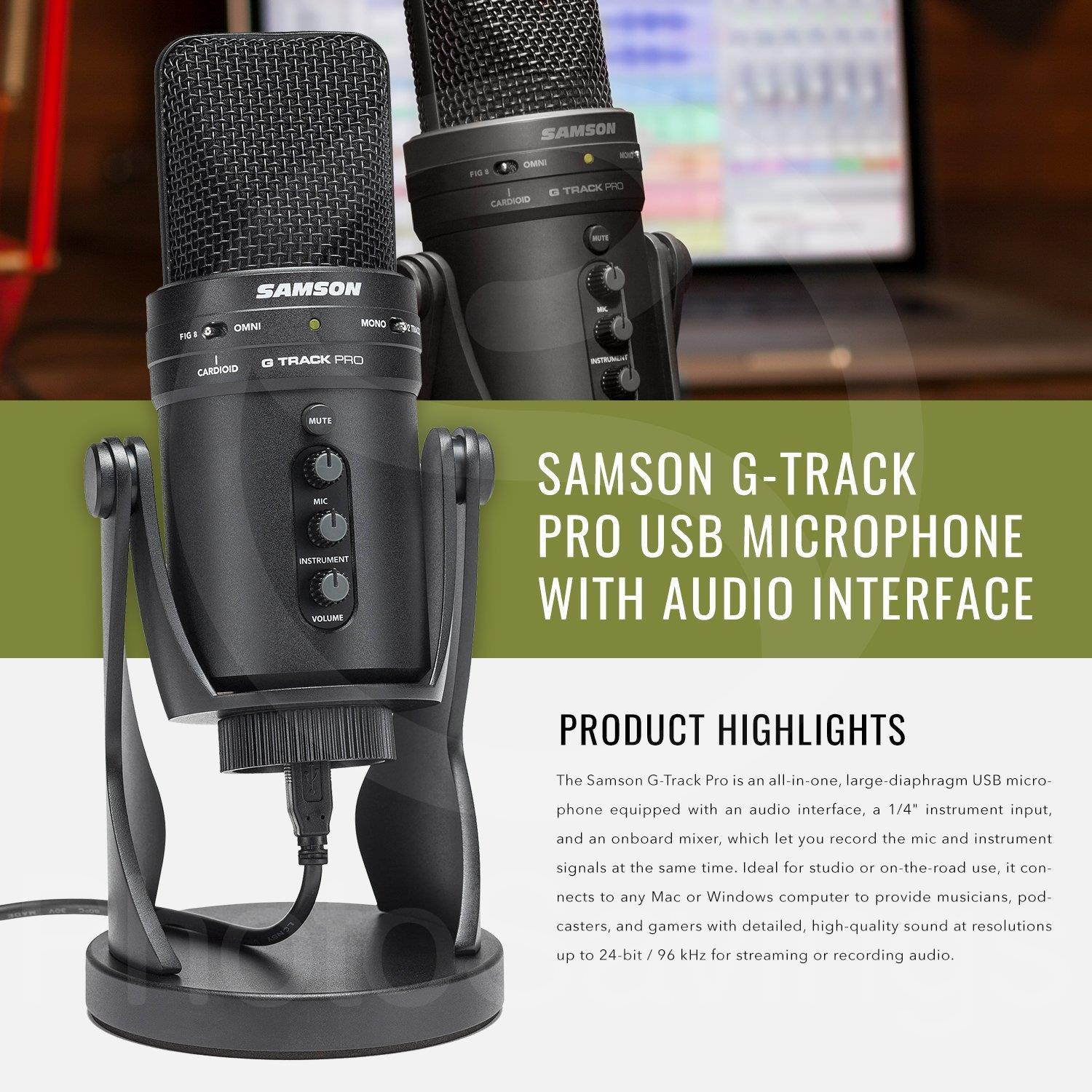 All-In-One - Ready to launch your personal podcast? That doesn't mean you need to empty your pockets or get an advanced degree in engineering. This simple and easy-to-use Samson G-Track Pro USB Microphone with Audio Interface gives you crystal-clear 24-bit/96 kHz studio-grade voice and instrument reproduction, ideal for podcasting, gaming, streaming, and recording music. What's more, the dual 1 condenser capsules boasts a 3-position switch so you could choose between cardioid (unidirectional), figure-8 (bidirectional), and omnidirectional polar patterns. A Mini Studio - Equipped with a built-in audio interface, a 1/4 instrument input, and an onboard mixer, you can record vocals/instruments simultaneously on the same or separate tracks. Additional connections include 1/4 mono instrument input for connecting a guitar, bass, or line-level device and 1/8 stereo headphone output with level control. Plug 'N Play - This USB powered interface connects to any Mac or Windows devices with no driver installation required. Constructed out of sturdy die-cast zinc construction and a heavy-gauge mesh grille with an integrated desktop base, the G-Track Pro takes you from street to studio. With quality studio monitors, studio headphones, a helpful pop filter, headphone case, and headphone hanger, your home studio is all but completed. Just plug, play and podcast. Professionally.