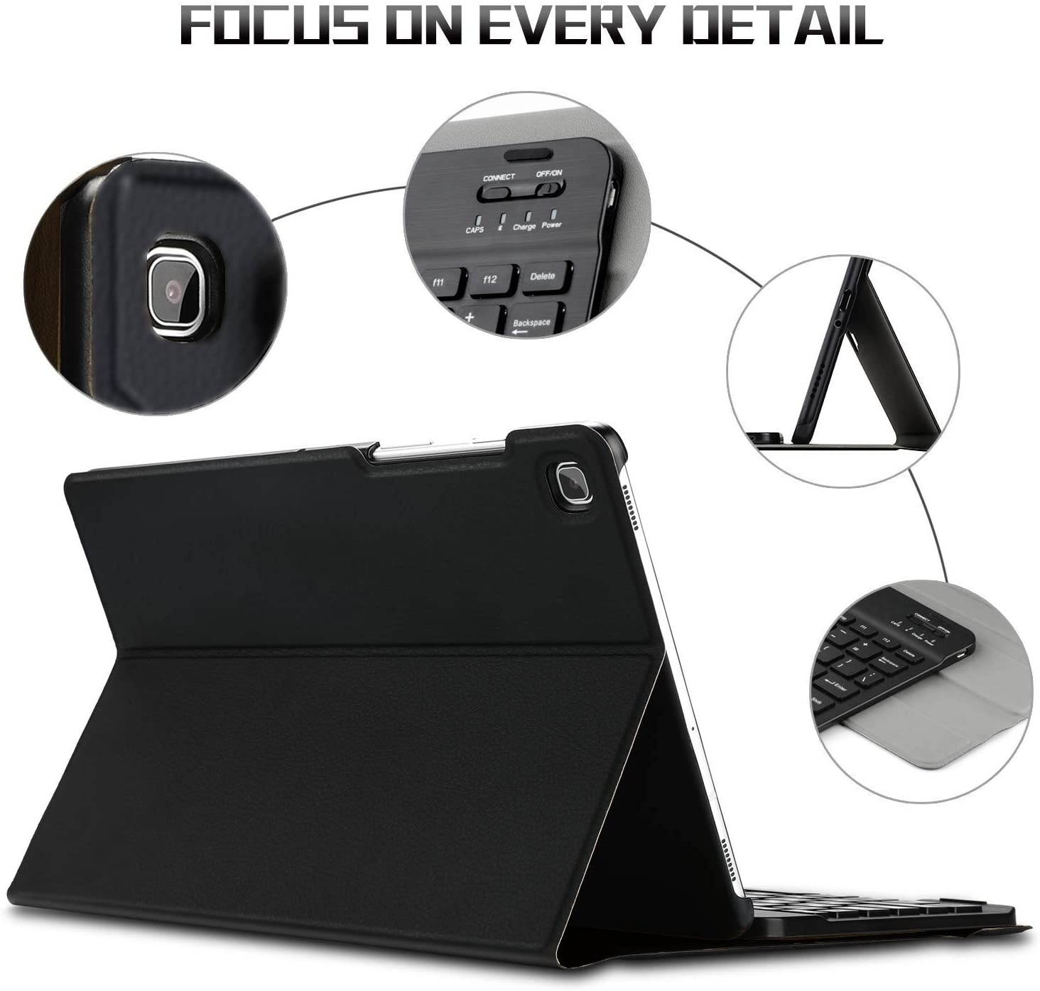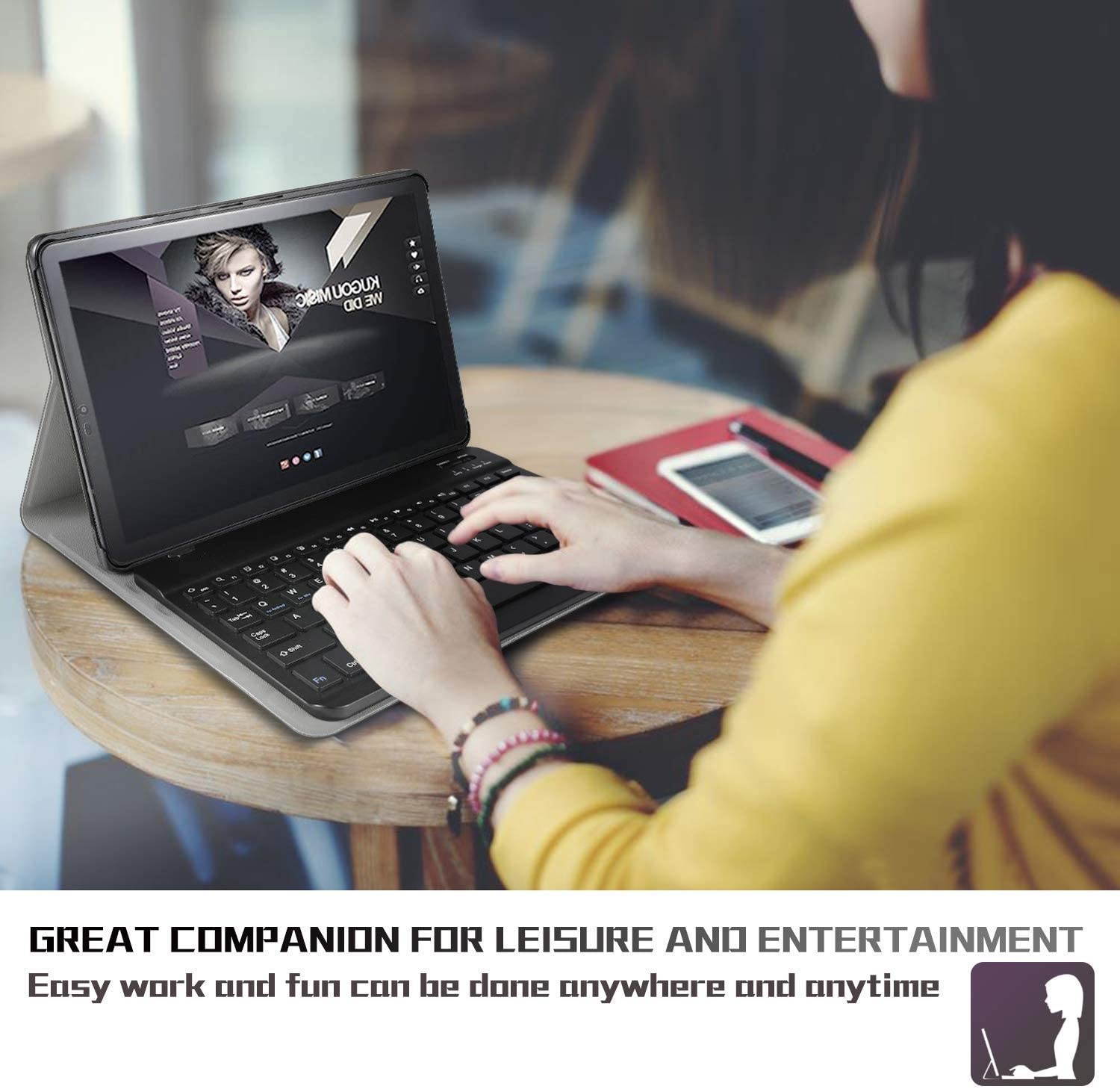 [Avoid Returns] This case is compatible with 2019 version tablet - Samsung Galaxy Tab S5e 10.5 SM-720/T725. It will not work for Samsung Galaxy Tab A 10.5 or any other model device. Magnetically detachable ultra slim 7mm and light weight bluetooth keyboard ranges 10M. Integrates seamlessly with your Tab S5e 10.5 2019 and other Bluetooth enabled Android device. Smart slim design case adds maximum protection with minimal bulk. Adjustable stand securely holds your Tab S5e 10.5 2019 in landscape mode. Durable PU leather cover with anti-slip rubber-lined interior. Premium polycarbonate shell locks your tablet in place and absorbs drops and bumps.
