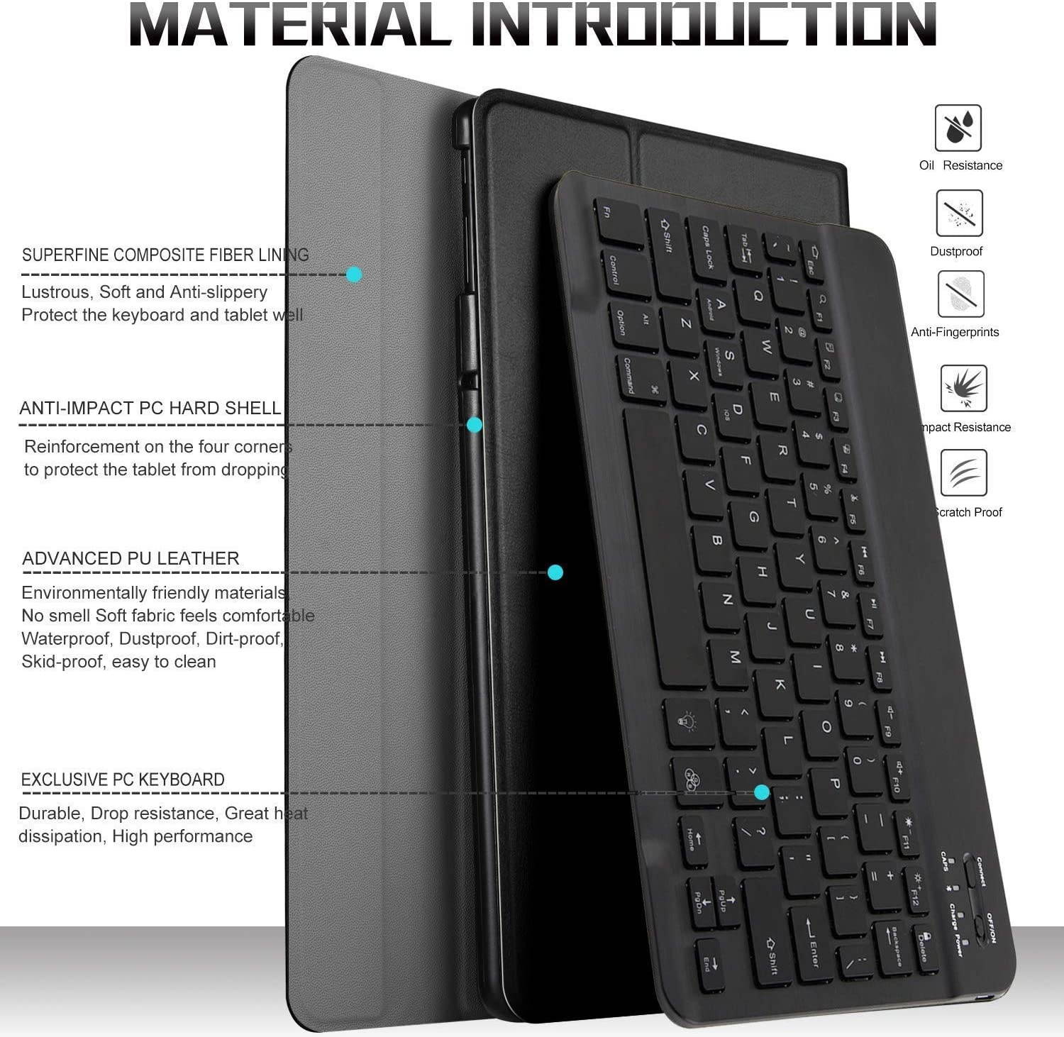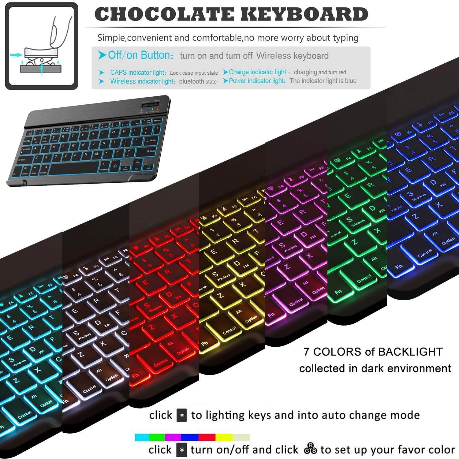 Real "hard" laptop style keyboard with high end ABS material. Not cheap silicone keyboard as other cases in market. A spring mechanism underneath each key ensures a tactile response with every stroke, helping you to type faster and with less error than on a touchscreen. 2 Mode of backlight display (Scroll through RGB colors or just constant RGB color) ) and 7 vibrant colors make typing fun and easy in the dark or the light, and its island style keys are quiet and comfortable. The SUNYOUNG Folio comes in black, rosegold and gold colors; multiple choices give you the freedom to choose what you like.