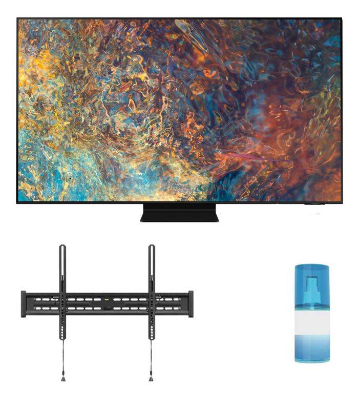 Samsung QN65QN90AA Neo QLED 4K Smart TV - Neo Quantum Processor 4K - HDR 10+ Certified - Quantum Matrix Contrast - 3840 x 2160 Resolution - Motion Rate 120 - Ultra Viewing Angle - Contrast Enhancer - Auto Motion Plus - LED Clear Motion - Dolby Digital Plus - Dolby 5.1 Decoder - Object Tracking Sound - Q-Symphony - Dialog Enhancement - 60W Sound Output - 4.2. 2 Channel Speakers - Woofer - Multiroom Link - Bluetooth Audio - Tizen Smart Service Operating System - Web Browser - Voice Activated Assistant - 400 x 300 VESA Spec - TV to Mobile Mirroring - Mobile to TV Mirroring - Auto Game Mode - Game Motion Plus - Super Ultra Wide Game View - Wifi - Bluetooth - Adaptive Picture - Active Voice Amplifier - Adaptive Sound Plus - AI Upscale - Brightness/Color Detection - Office 365 Cloud Service - English, Spanish, and French OSD Language - 4 HDMI - 2 USB ( 2.0 ) - 1 Digital Audio Out (Optical) - 1 Ex-Link (RS-232C) - Ethernet - HDMI A / Return Channel Support - eARC - HDMI Quick Switch - 4 Bezel-Less - Solid Slim - Bending Plate Stand (Sand Black) - Eco Sensor - Solar Cell Remote - ( 56.9"W x 11.2"D x 35.2"H ) - (Titan Black) with a Walts TV Tilt Mount for TV's 43"-90" - Tilt Mount - Vesa Compatibility (100X100 - 700X400) - 43-90 TV Compatibility - Viewing Angle 3-12 Degrees - Includes All Necessary Hardware - 175 lb Capacity - Post Install Leveling - Full Back Plate - Three Way Tensioner - Padlock-able for Security - (34"W x 4"D x 7"H) - (Black) and Walts HDTV Screen Cleaner - 200ml Liquid Spray - 6.8 oz Screen Cleaner - Includes 200 x 200 Polar Fleece Cloth (9"W x 3"D x 5"H)