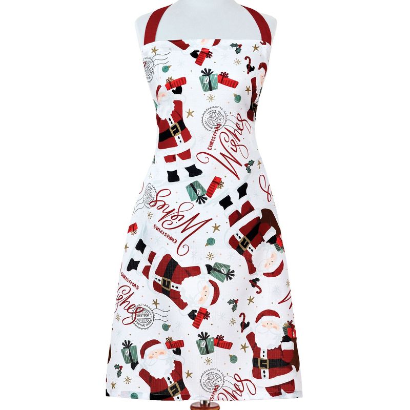 This fashionable apron features an adorable holiday print with Santa Claus, presents, candy canes, and holly. Excellent for special occasions, events, parties, and everyday holiday décor use. Polyester can be easily ironed to release stubborn creases and make apron wrinkle free. Apron features adjustable fit around the neck and waist. Apron measures 24x32. Coordinate to all the items in our Santa Christmas Wishes collection including tablecloths, kitchen tiers and valance set, placemats, kitchen towels, and more. 100% polyester. Easy care, machine washable.
