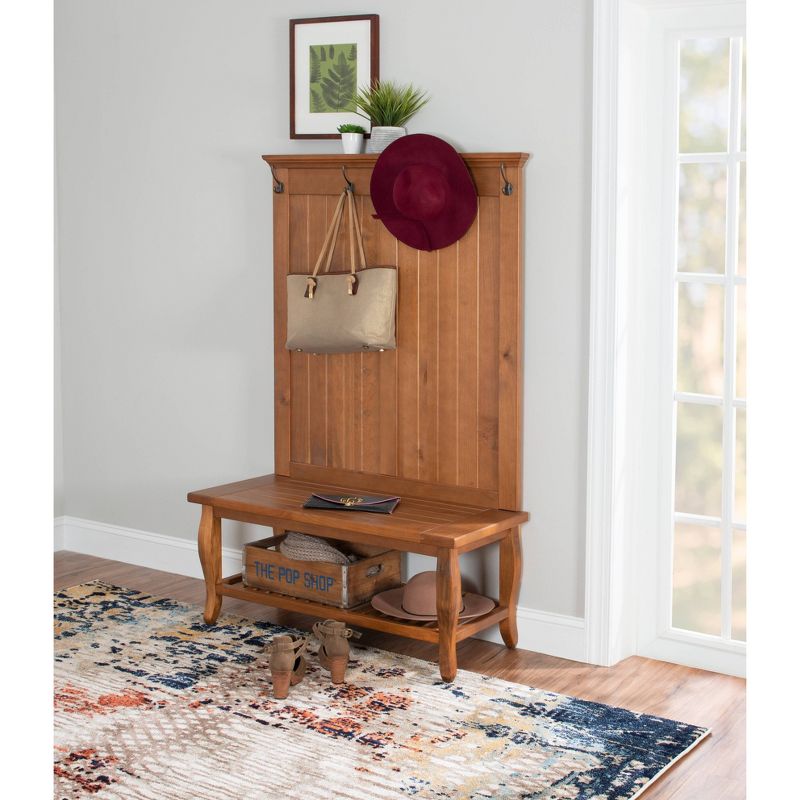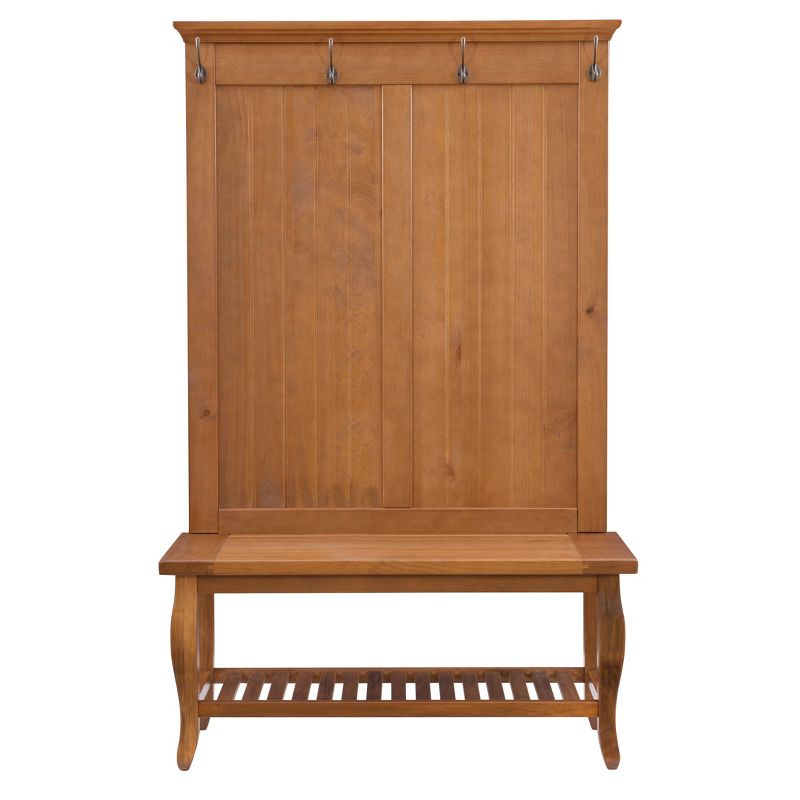Add efficient and traditional style storage to your hall or mud room with this Santa Fe Hall Tree. With its Antique Pine finish the hall tree adds warmth to your space. Organize your space by utilizing the four attached hooks on the Santa Fe Hall Tree. The open and spacious top and bottom shelves are ideal for storage. The shelves are versatile and can also be used to house accessories or storage bins. This piece will be sure to enhance the functionality of your space.