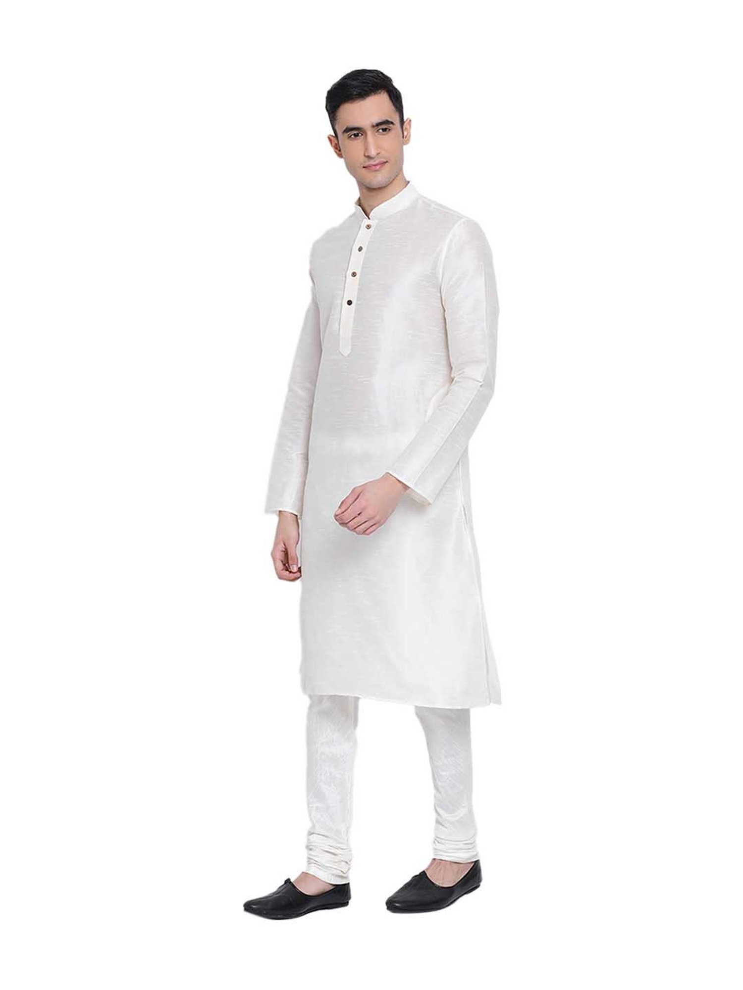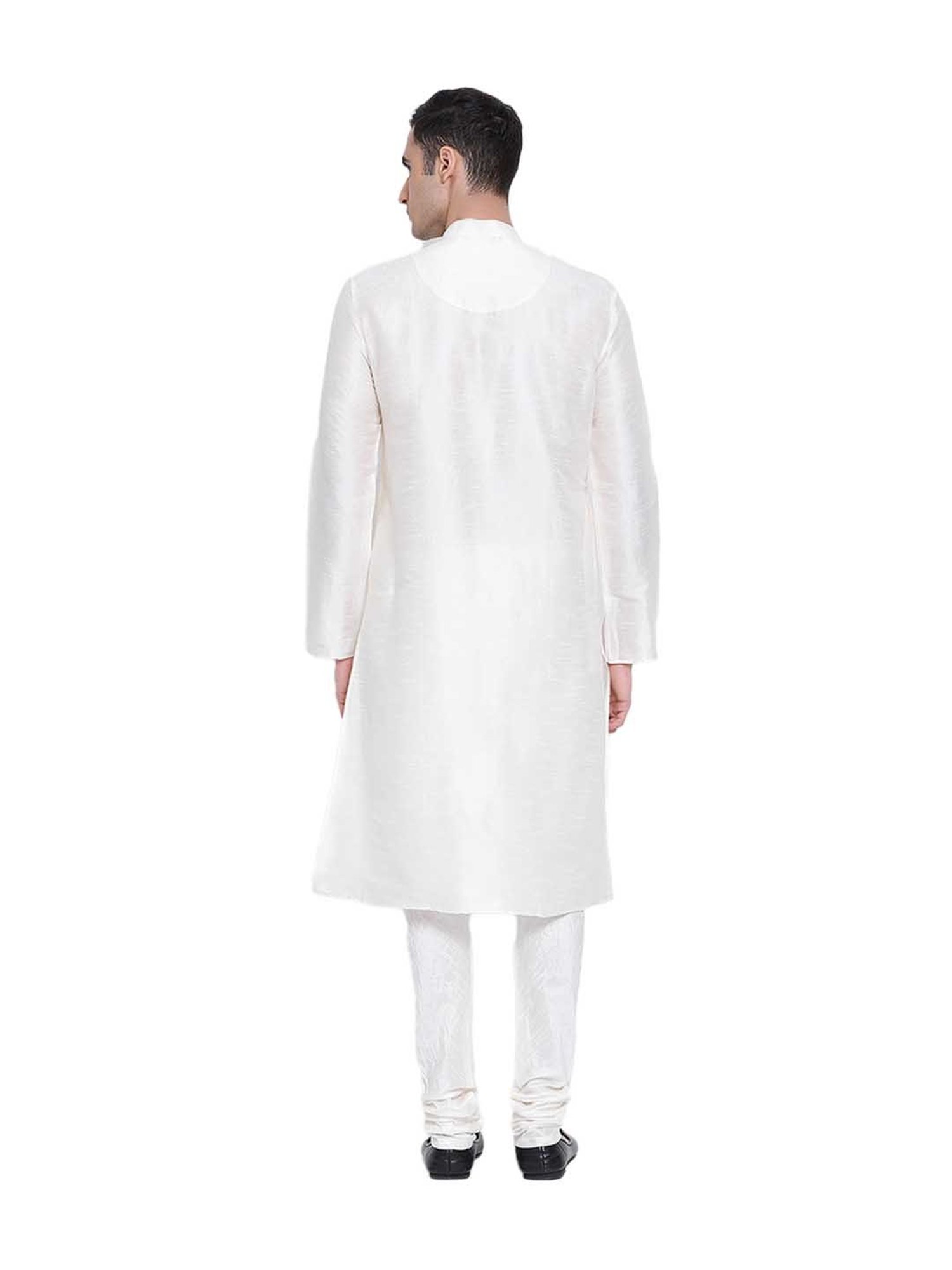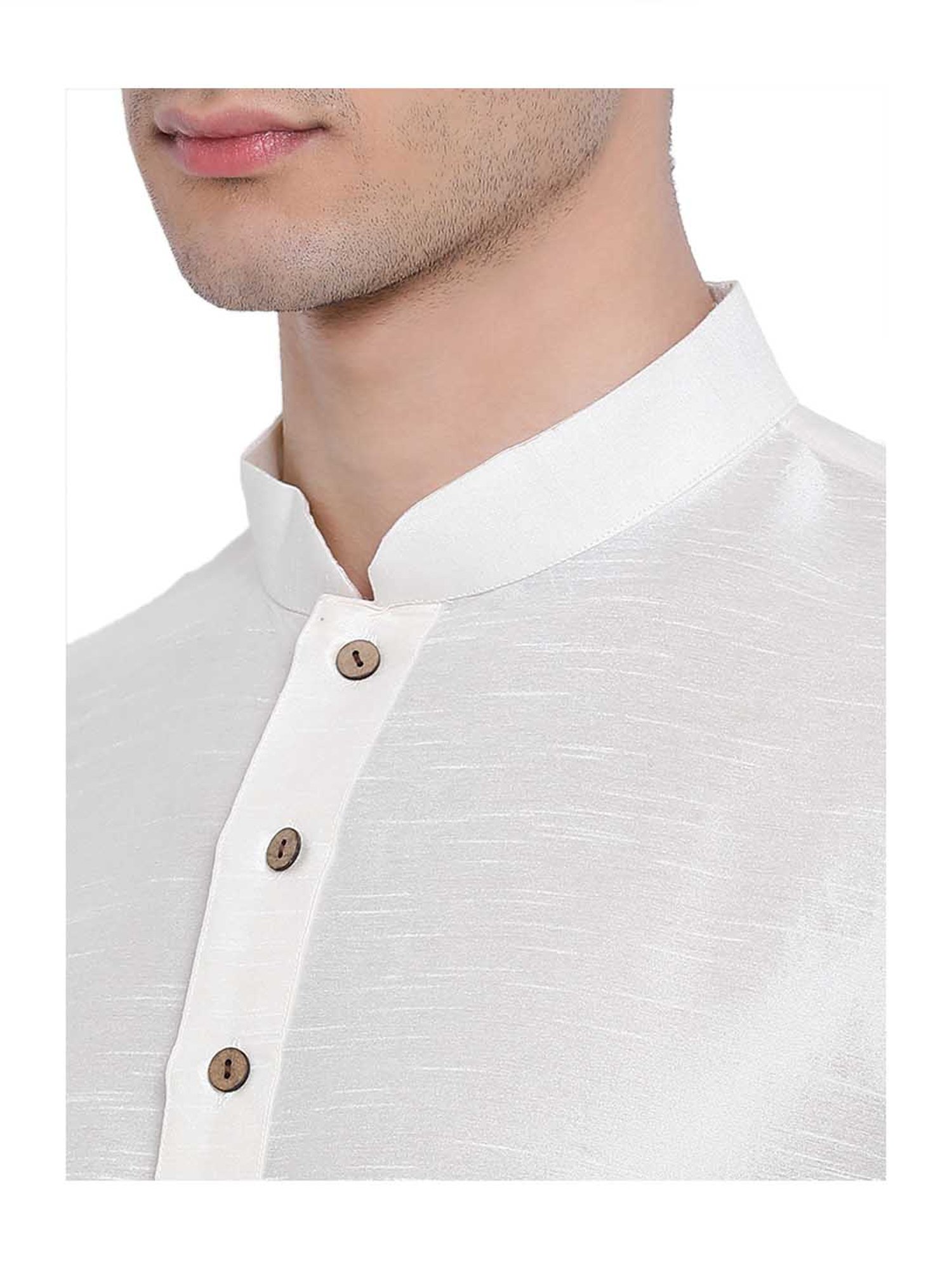 Flaunt your festive zeal by wearing this cream set from Sanwara. Crafted from art silk fabric, this solid set features a full sleeves kurta with a mandarin collar and pyjama pants. Pair this regular fit set with a Nehru jacket and juttis.