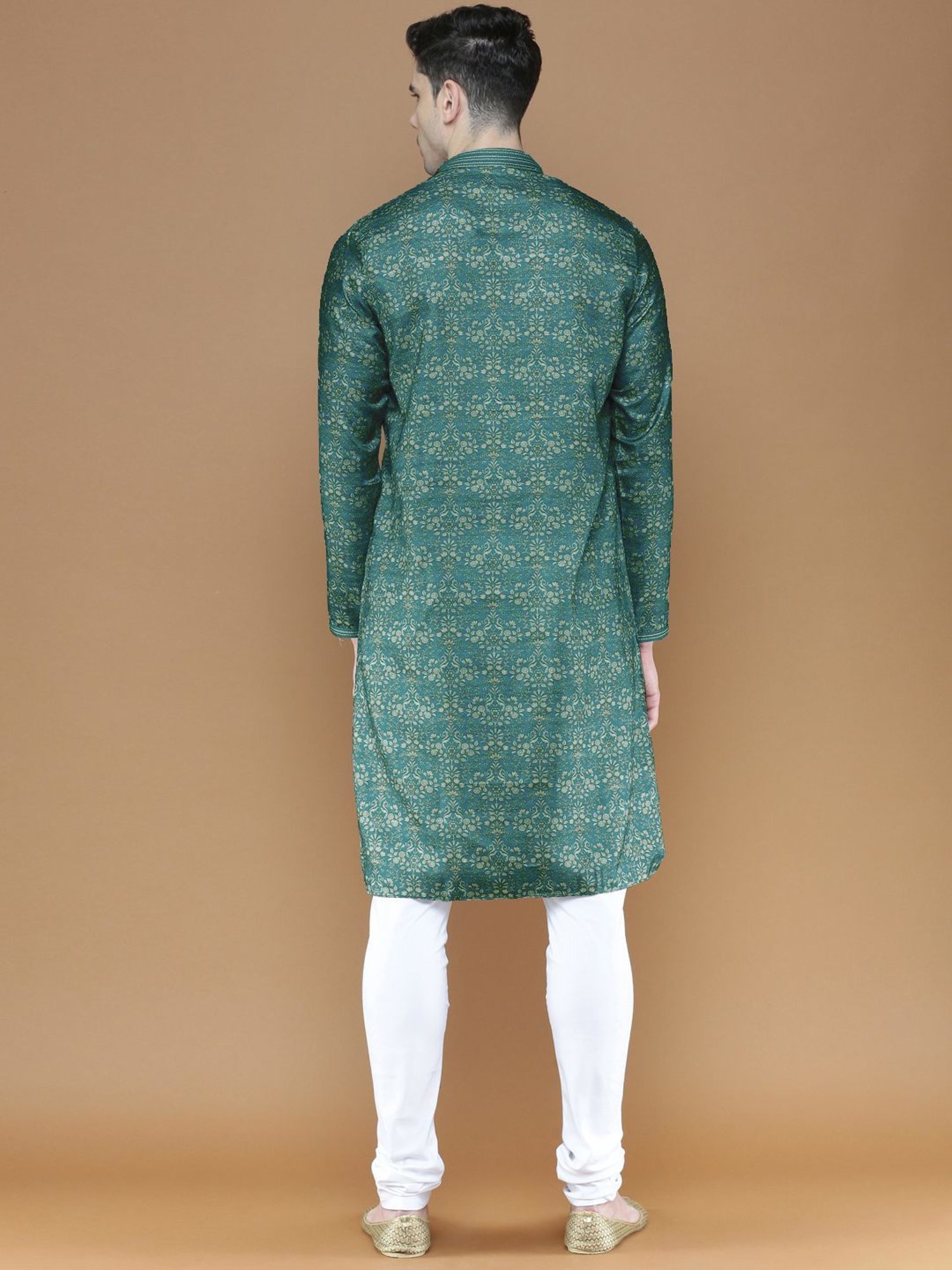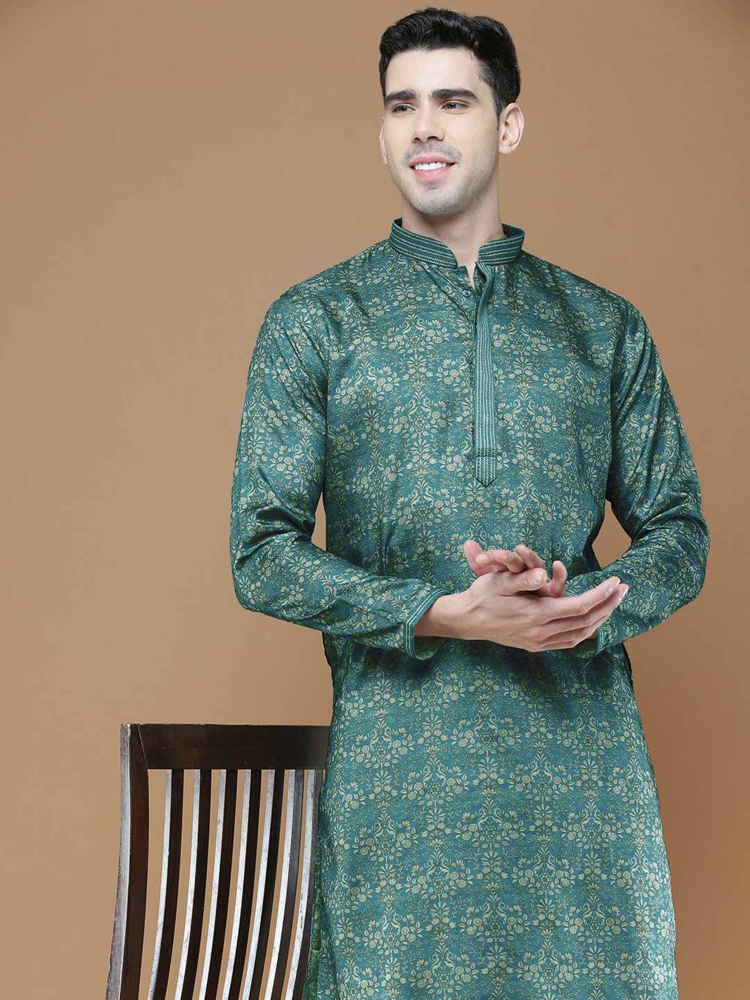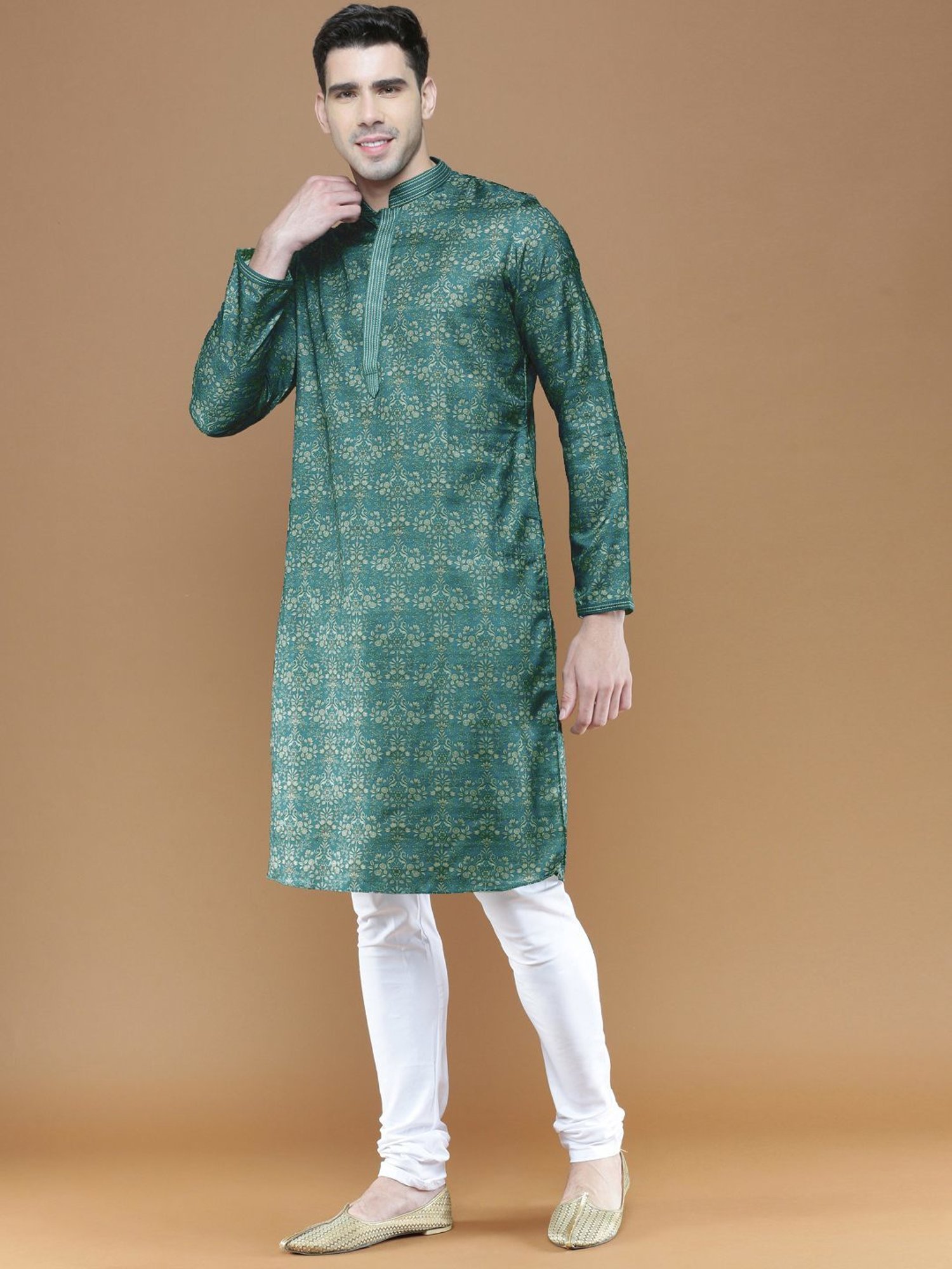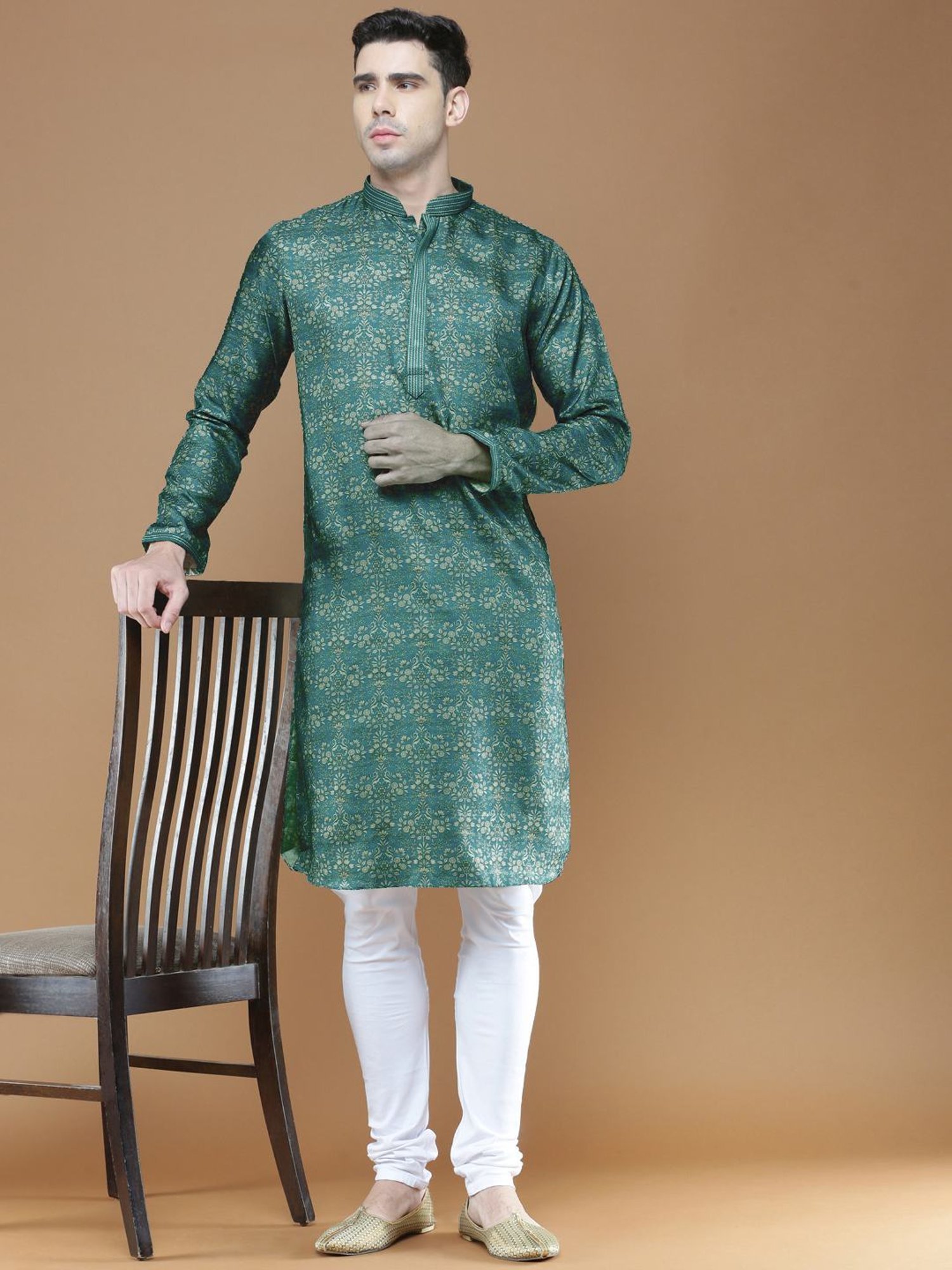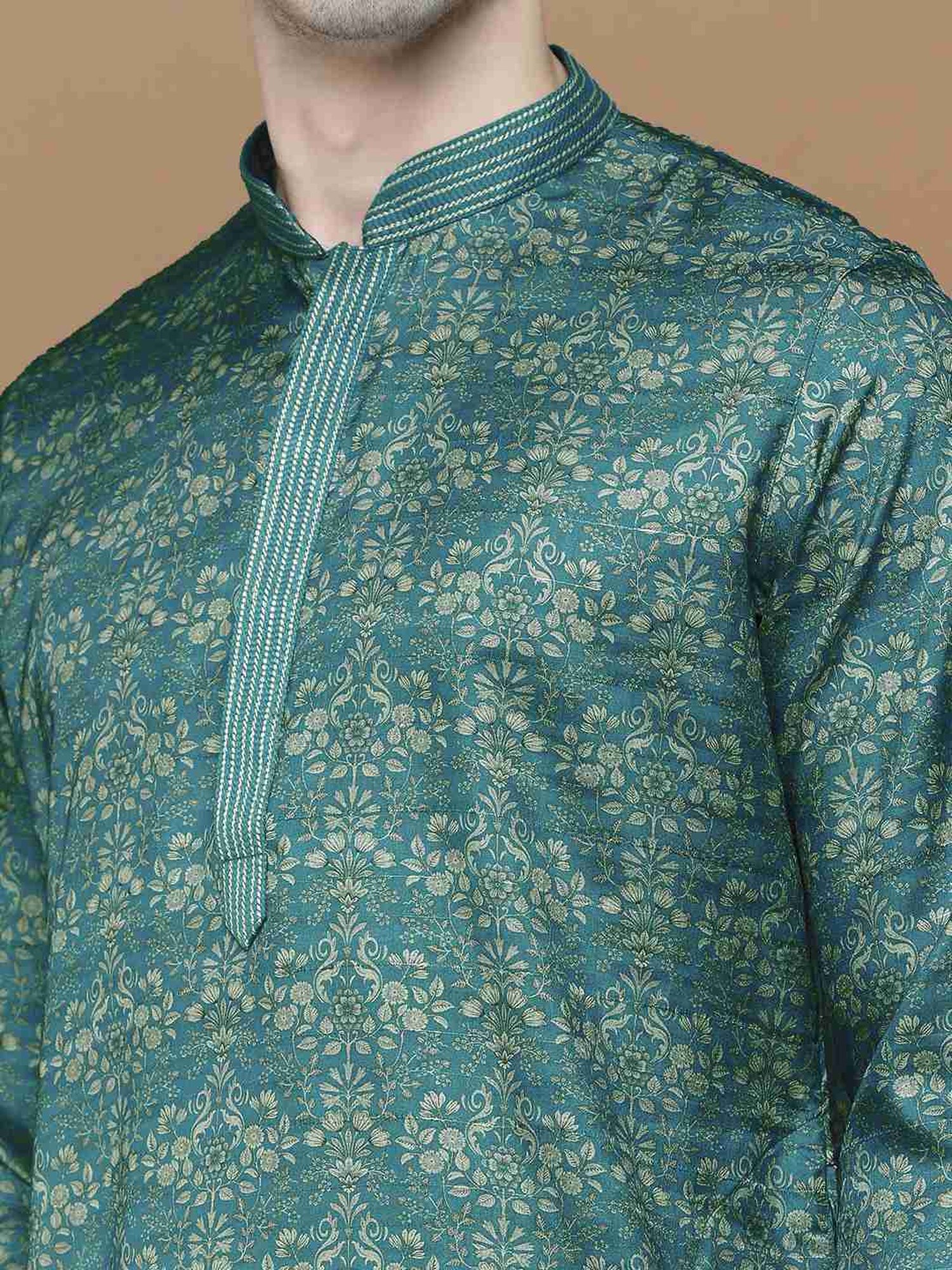 Revamp your charming look with this exclusive firozi regular fit kurta bottom set from Sanwara. Tailored to sartorial perfection from premium quality fabric, it assures a soft and soothing touch against the skin. The mandarin collar augments its design. Exuding full sleeves, it is sure to fetch you compliments from all. The printed pattern makes it a captivating choice.