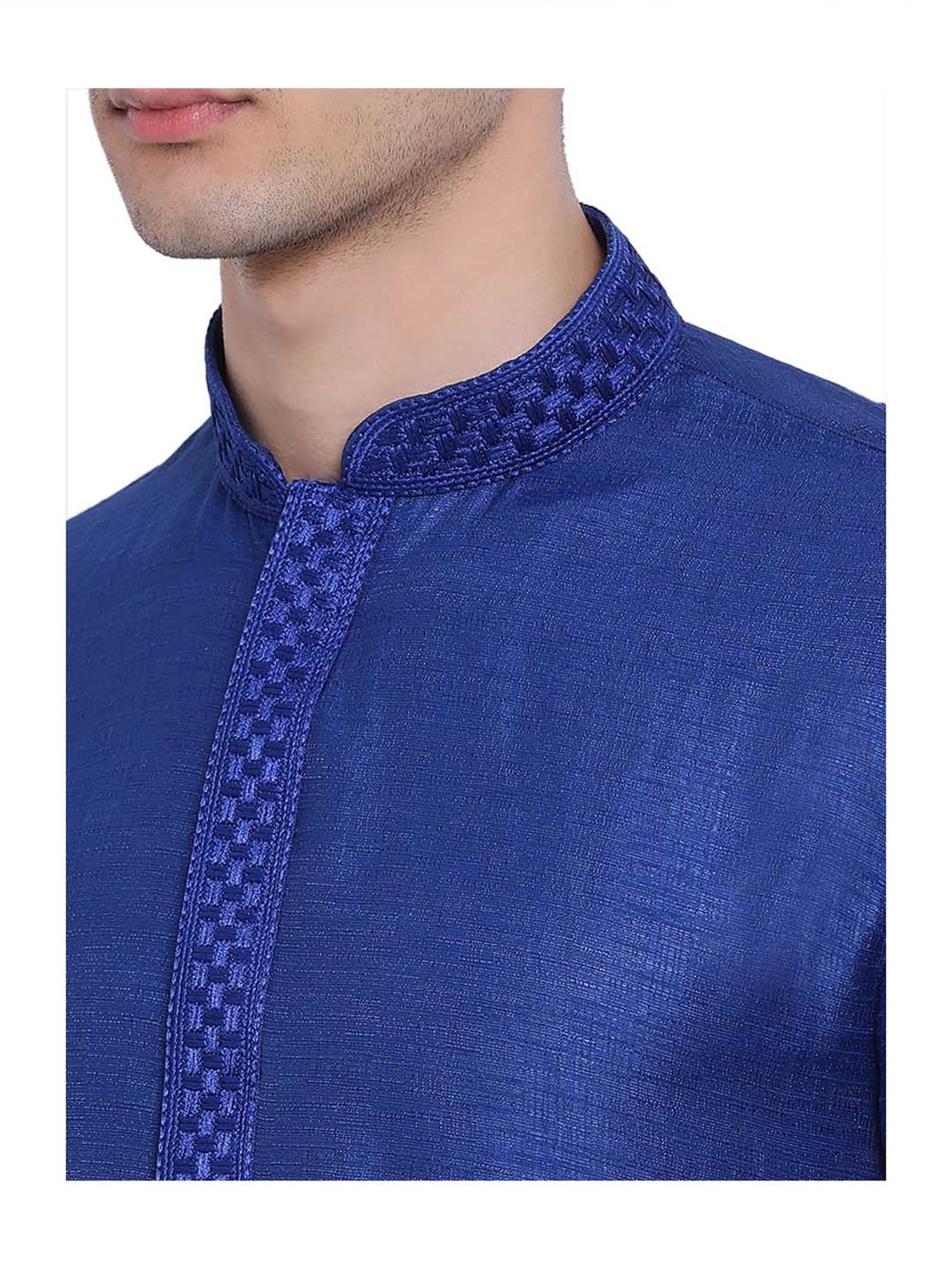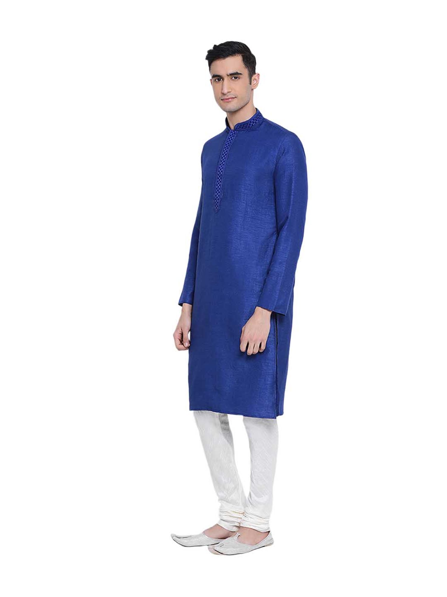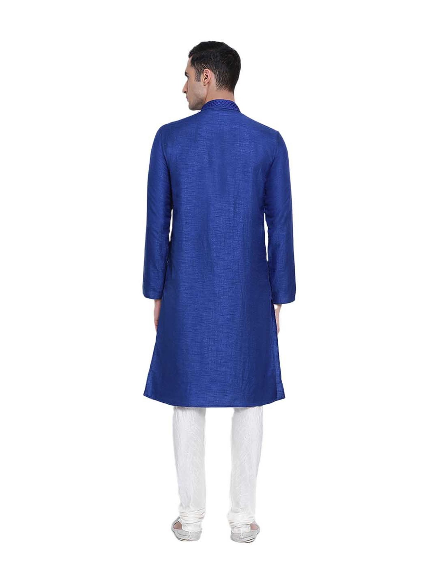 Lend an immaculate appeal to your festive look with this ink blue set from Sanwara. Made from art silk, this solid set features a full sleeves kurta with a mandarin collar and pyjama pants. Team this regular fit set with a Nehru jacket and mojaris.