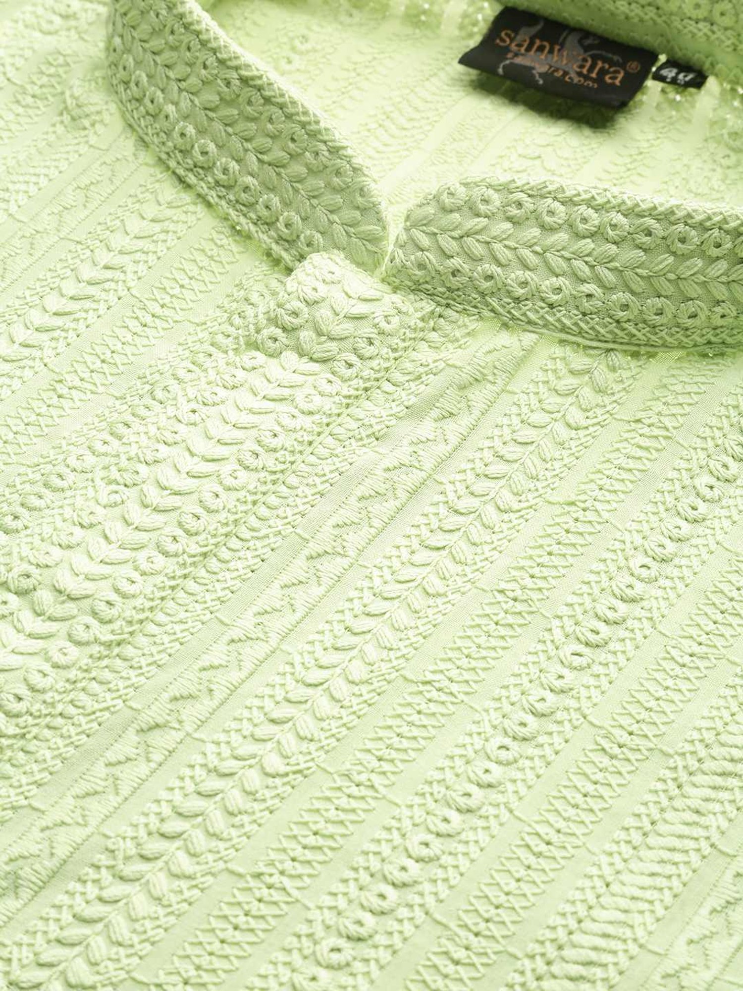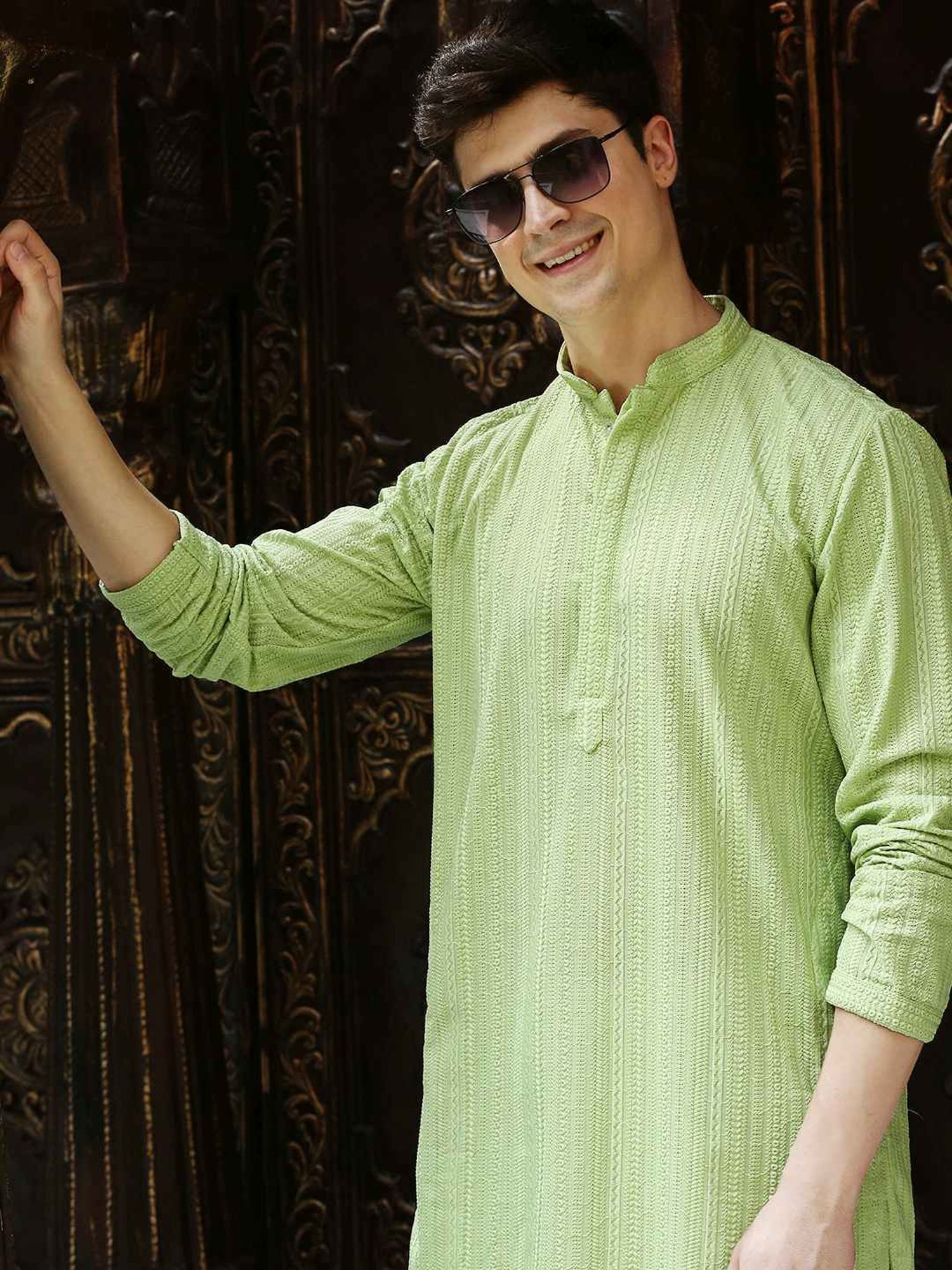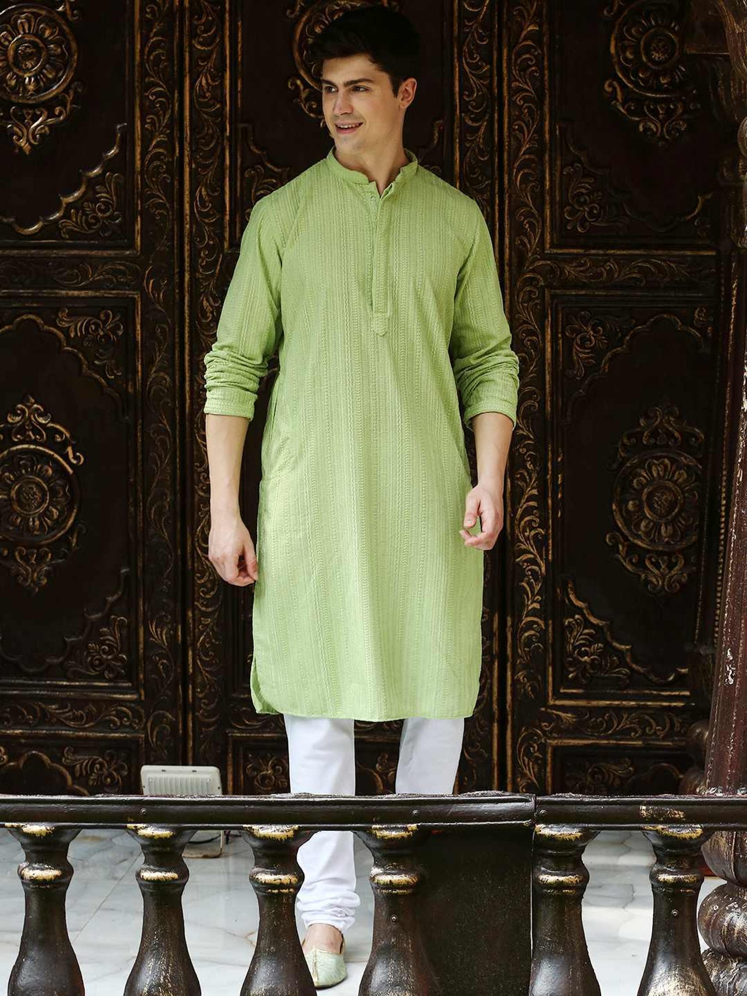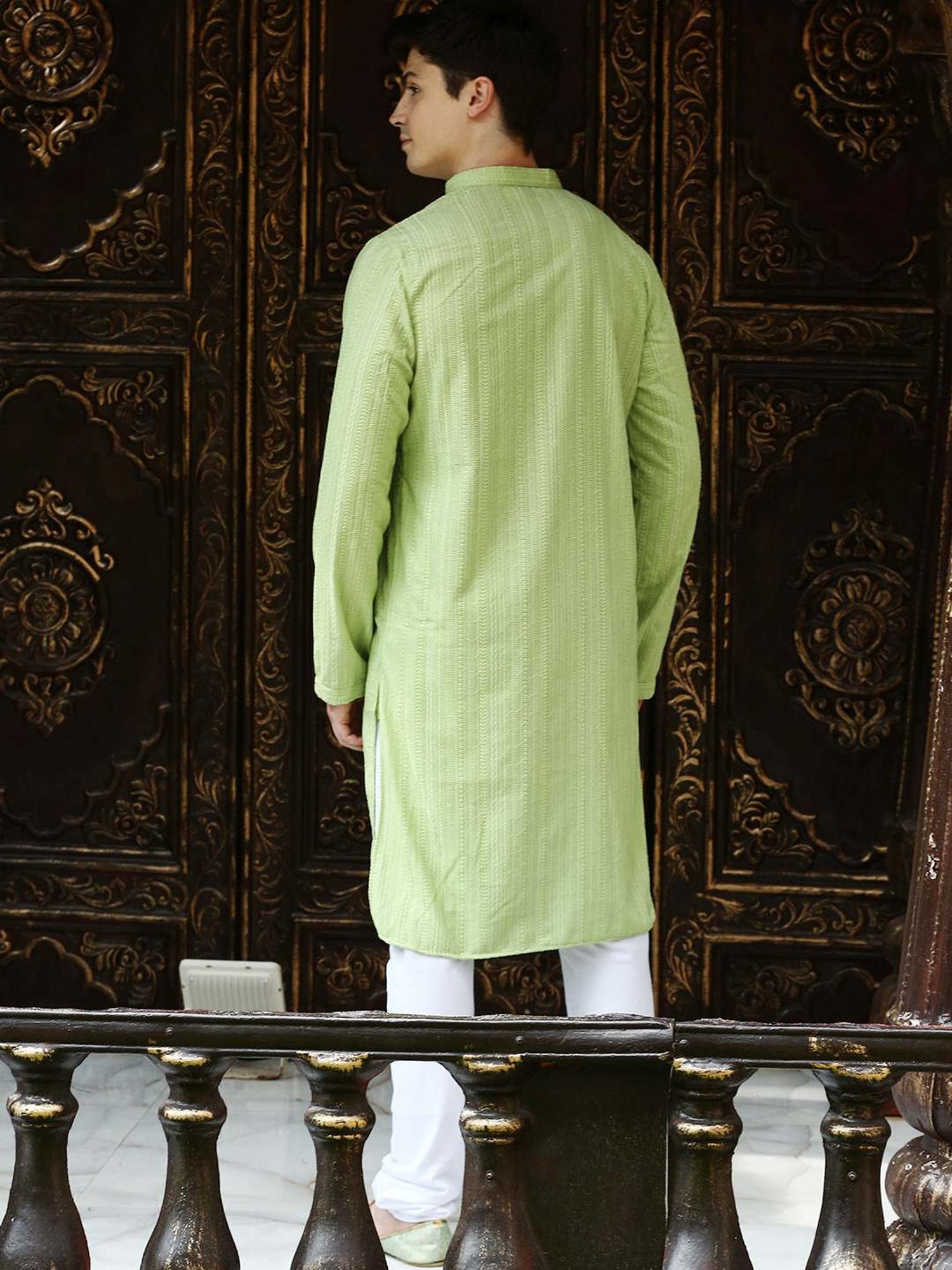 Achieve a magnetic look by wearing this light green regular fit kurta bottom set from Sanwara. Tailored to sartorial perfection from premium quality fabric, it assures a soft and soothing touch against the skin. The mandarin collar augments its design. Exuding full sleeves, it is sure to fetch you compliments from all.