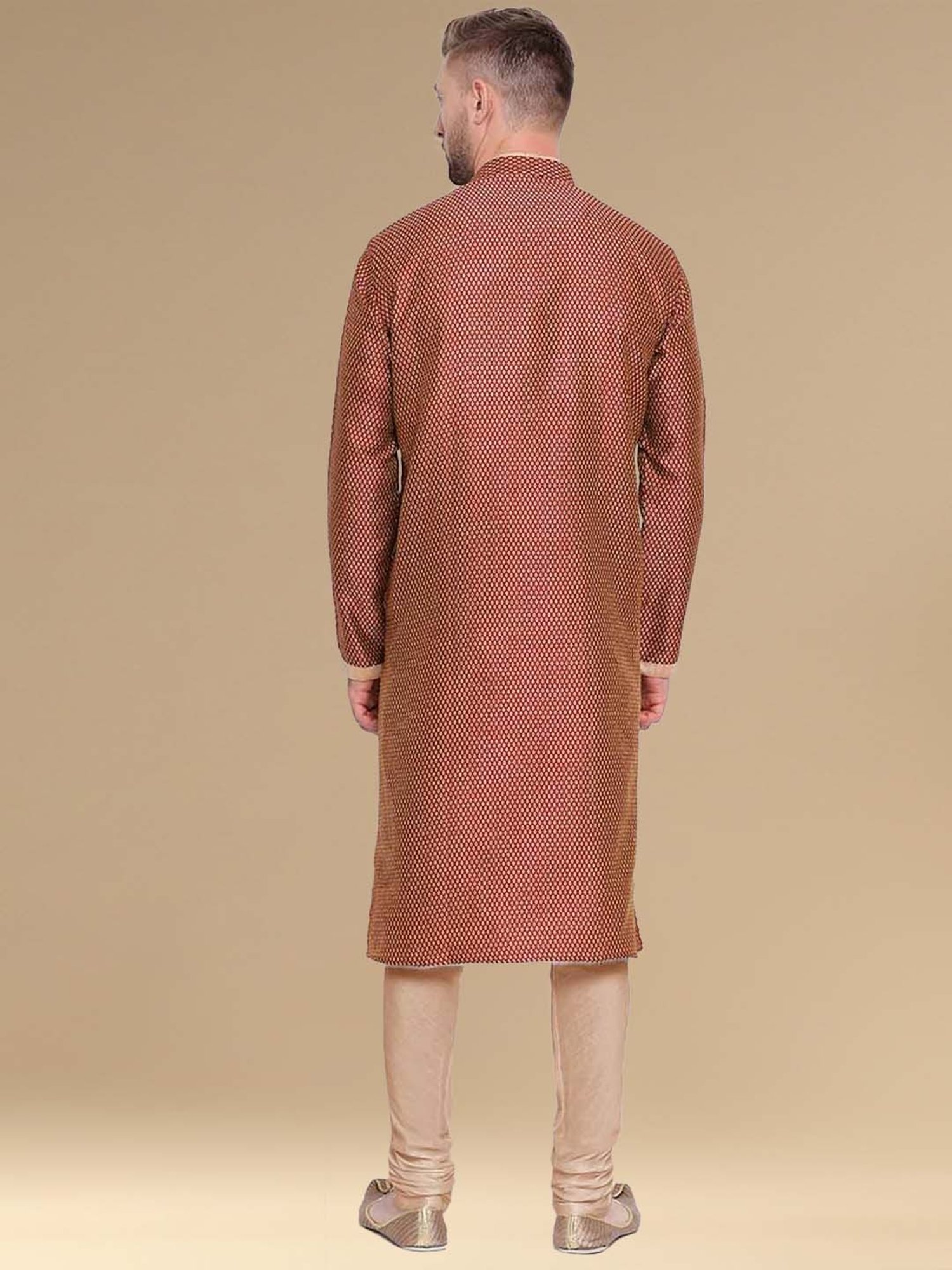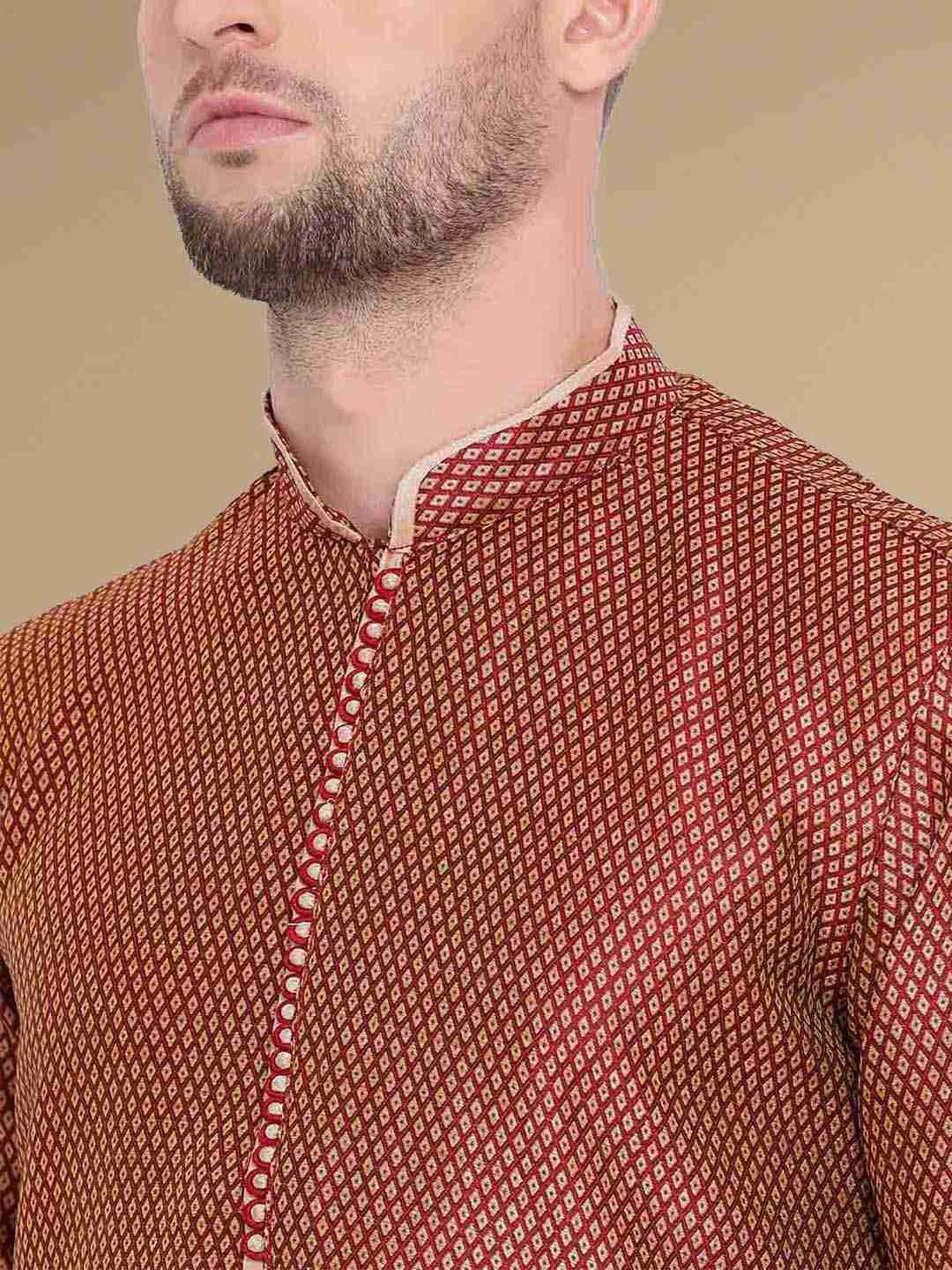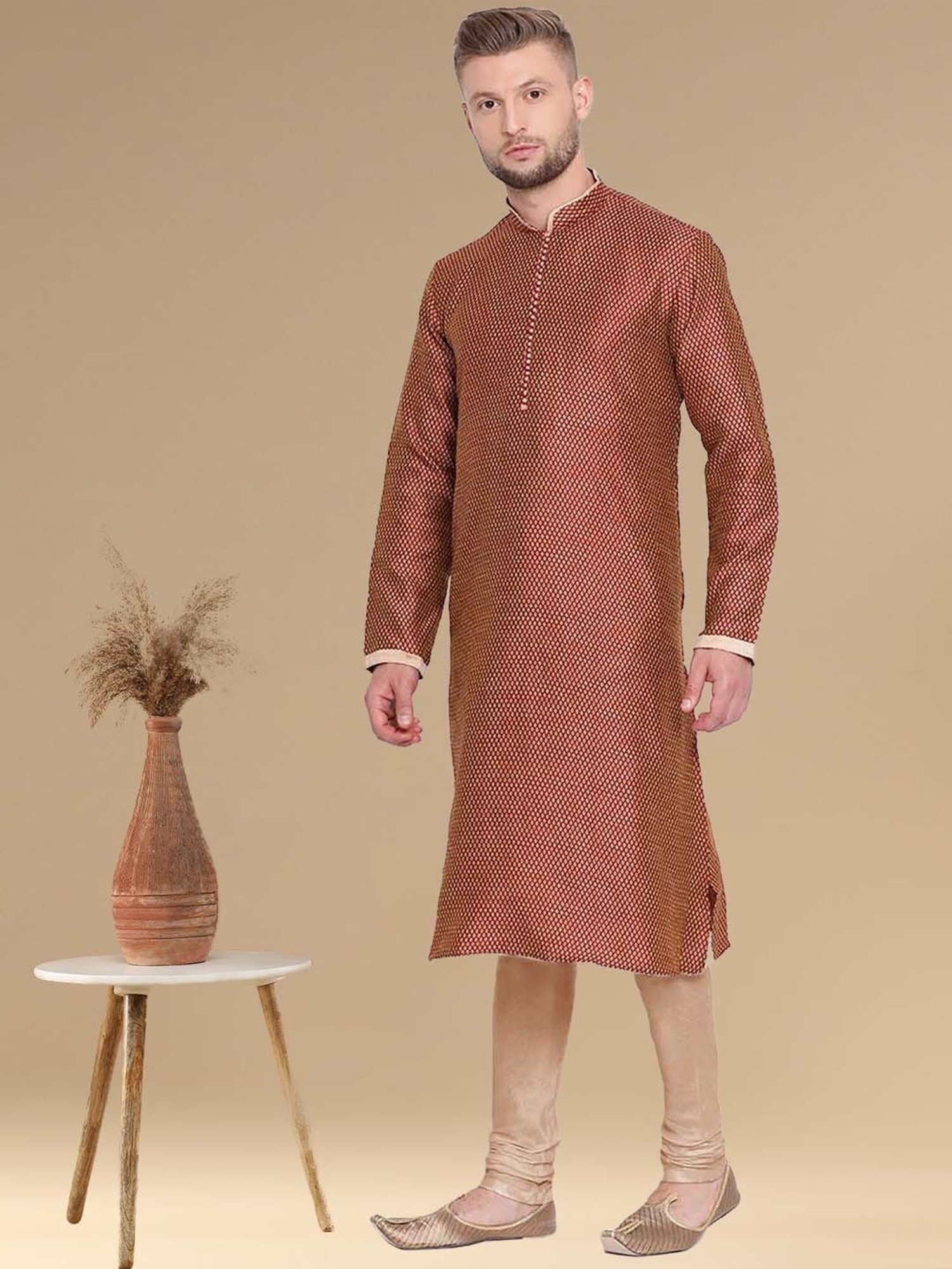 A must-have in your wardrobe collection, this maroon and begie regular fit kurta bottom sets from Sanwara exemplifies sheer craftsmanship. Tailored to sartorial perfection from premium quality fabric, it assures a soft and soothing touch against the skin. The mandarin collar augments its design. Exuding full sleeves, it is sure to fetch you compliments from all. The printed pattern makes it a captivating choice.