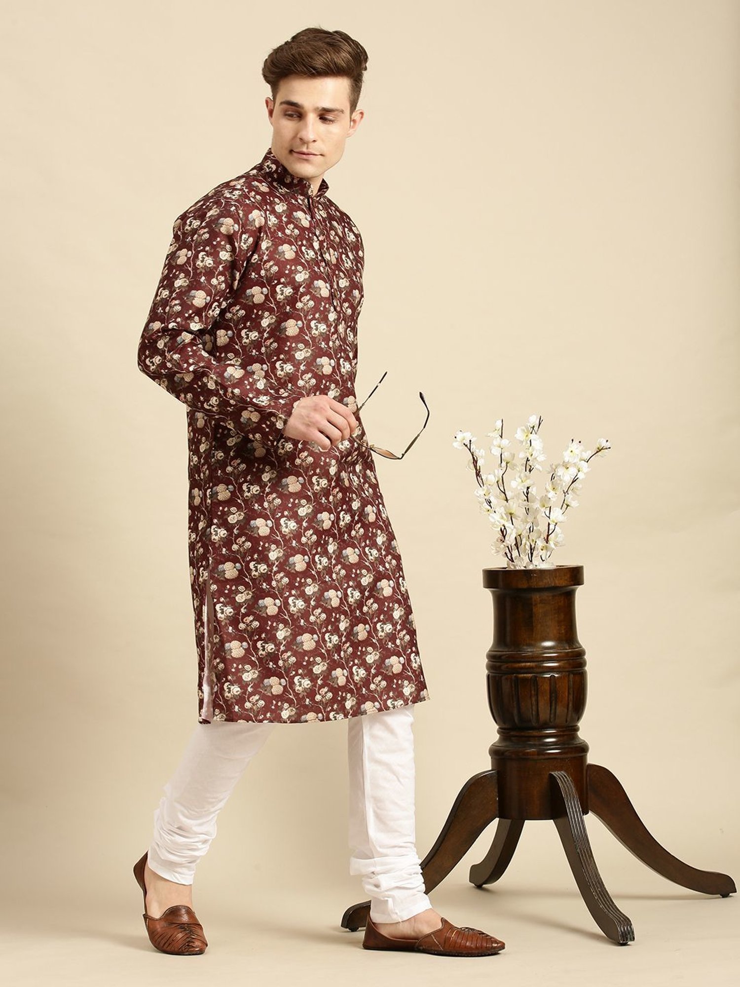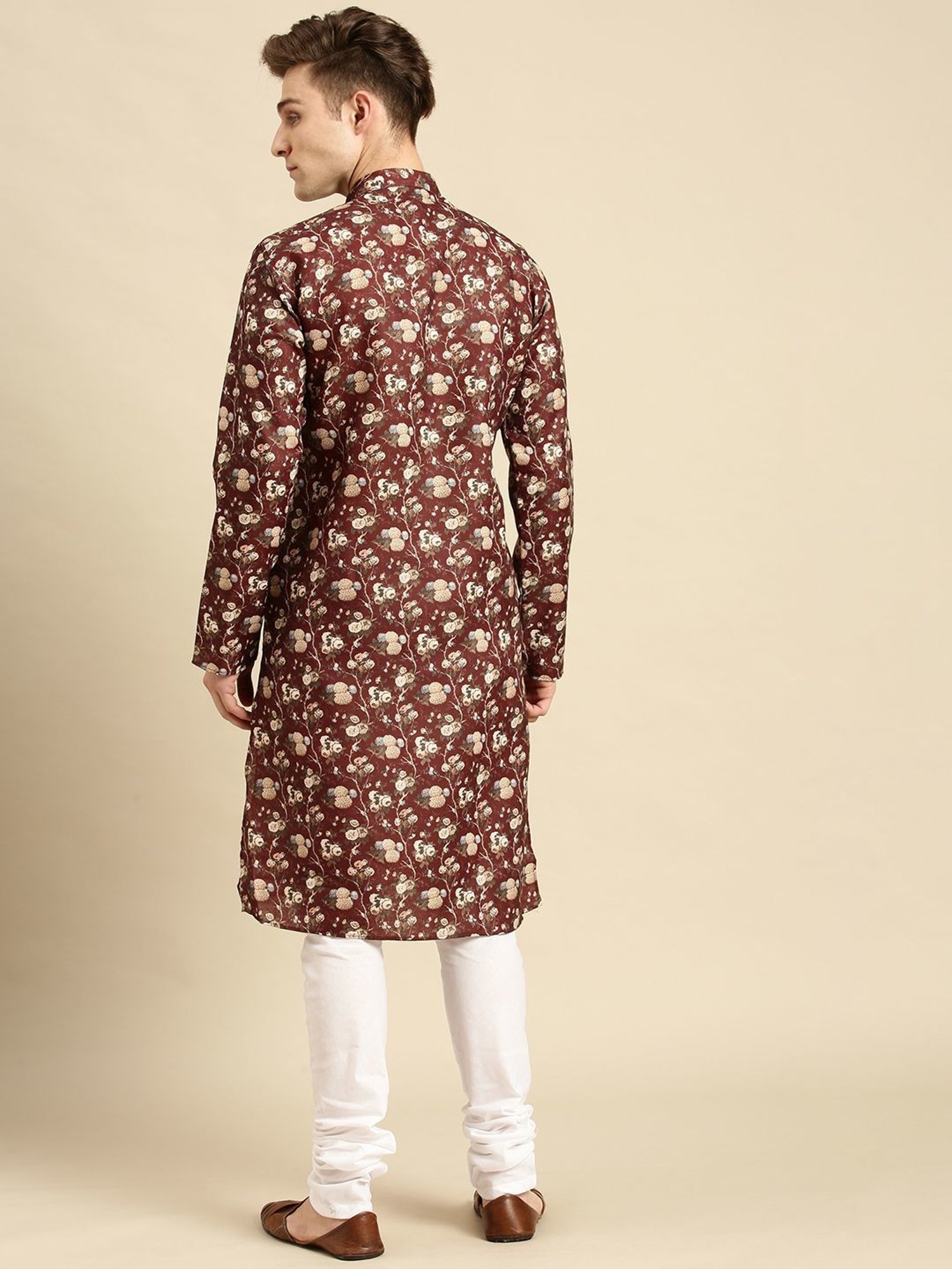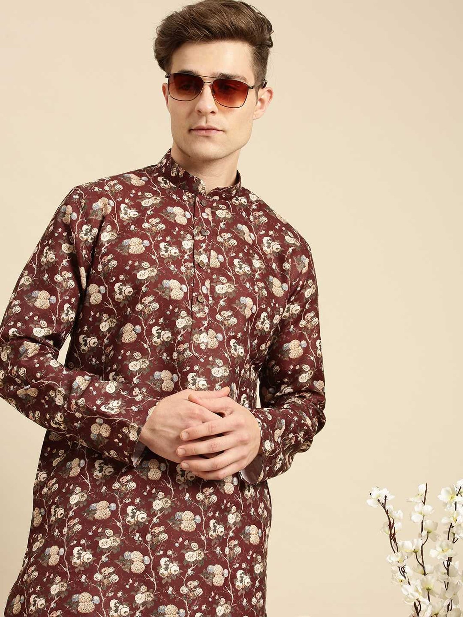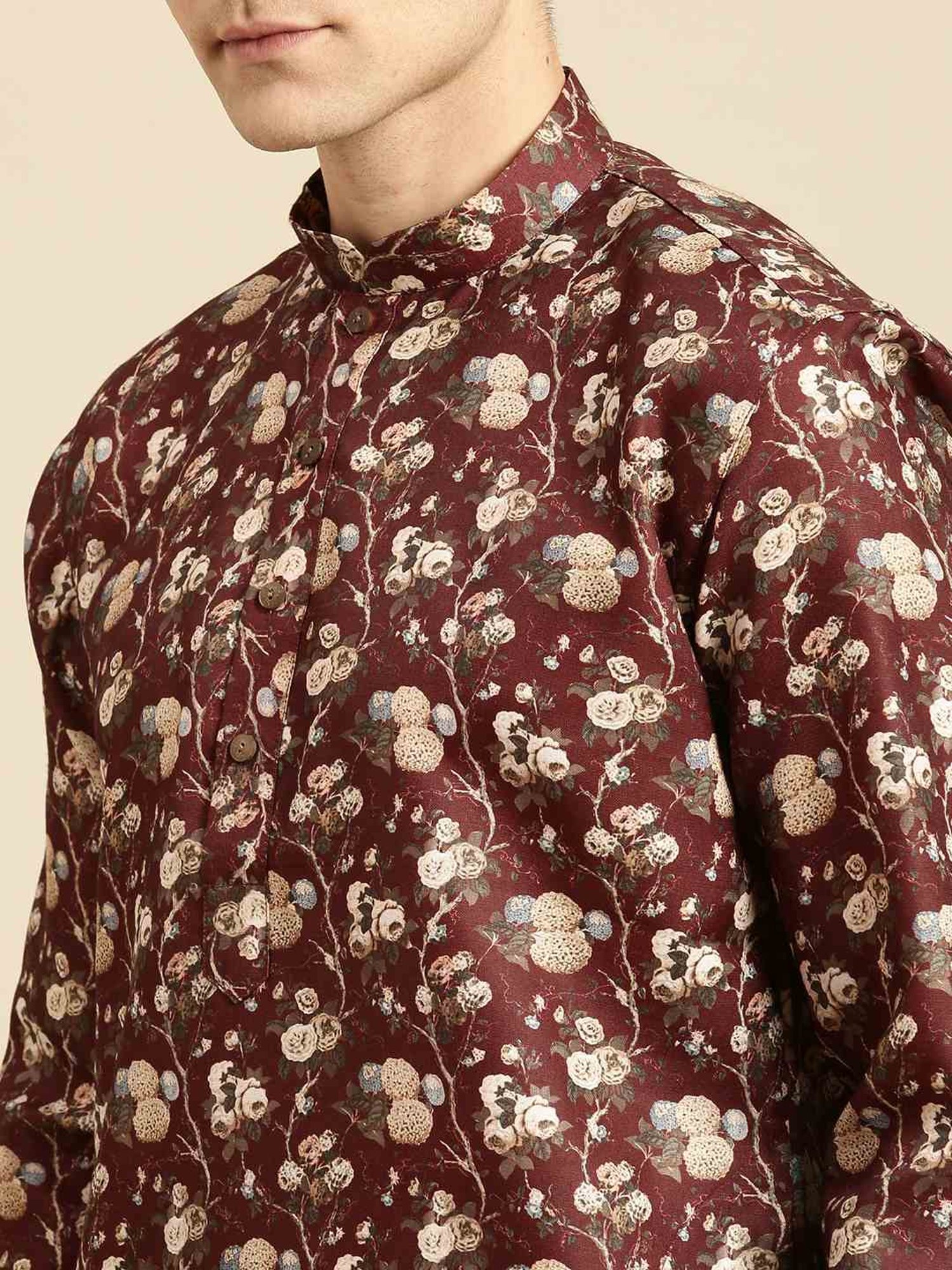 Score high on the fashion radar by wearing this red regular fit kurta bottom set from Sanwara. Tailored to sartorial perfection from premium quality fabric, it assures a soft and soothing touch against the skin. The mandarin collar augments its design. Exuding full sleeves, it is sure to fetch you compliments from all. The printed pattern makes it a captivating choice.