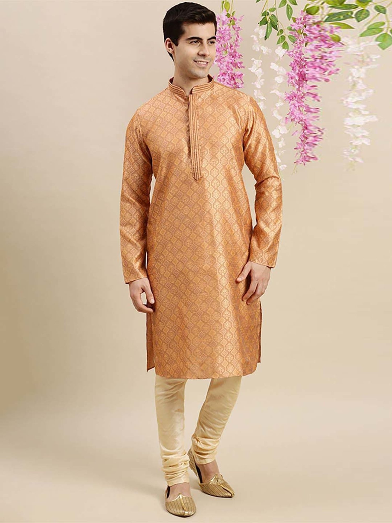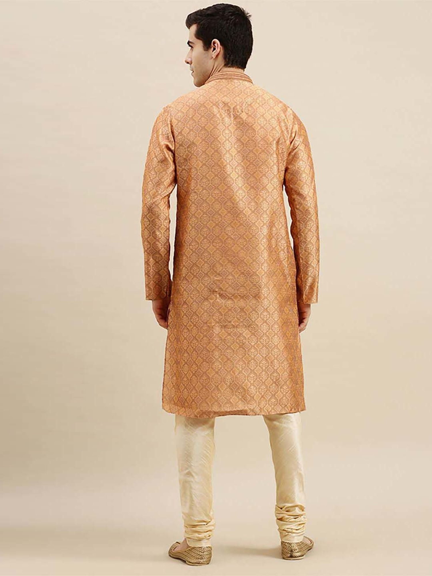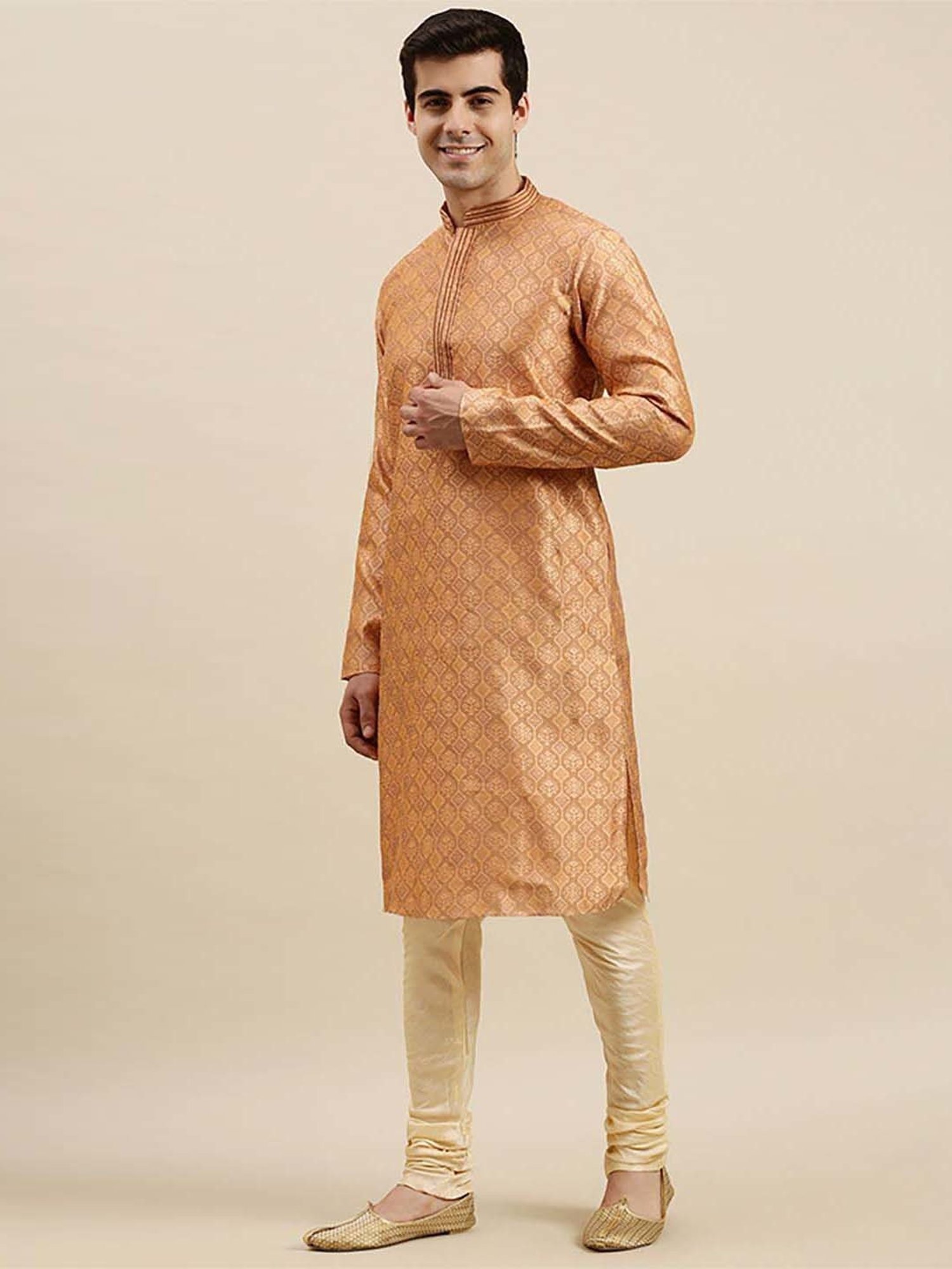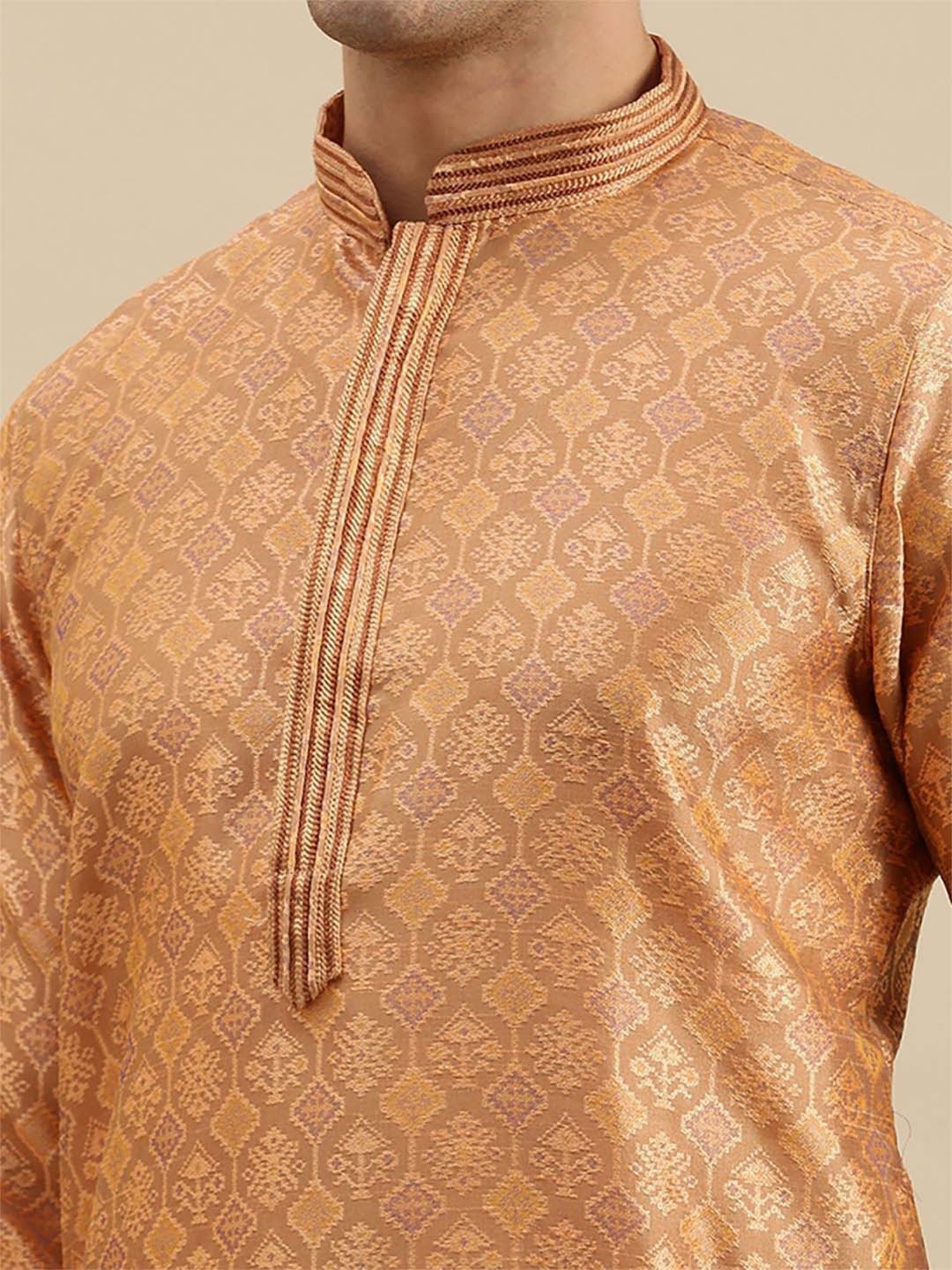 Add extra charm to your look wearing this rust orange and beige regular fit kurta bottom set from Sanwara. Tailored to sartorial perfection from premium quality fabric, it assures a soft and soothing touch against the skin. The mandarin collar augments its design. Exuding full sleeves, it is sure to fetch you compliments from all. The self pattern renders it fashionable.
