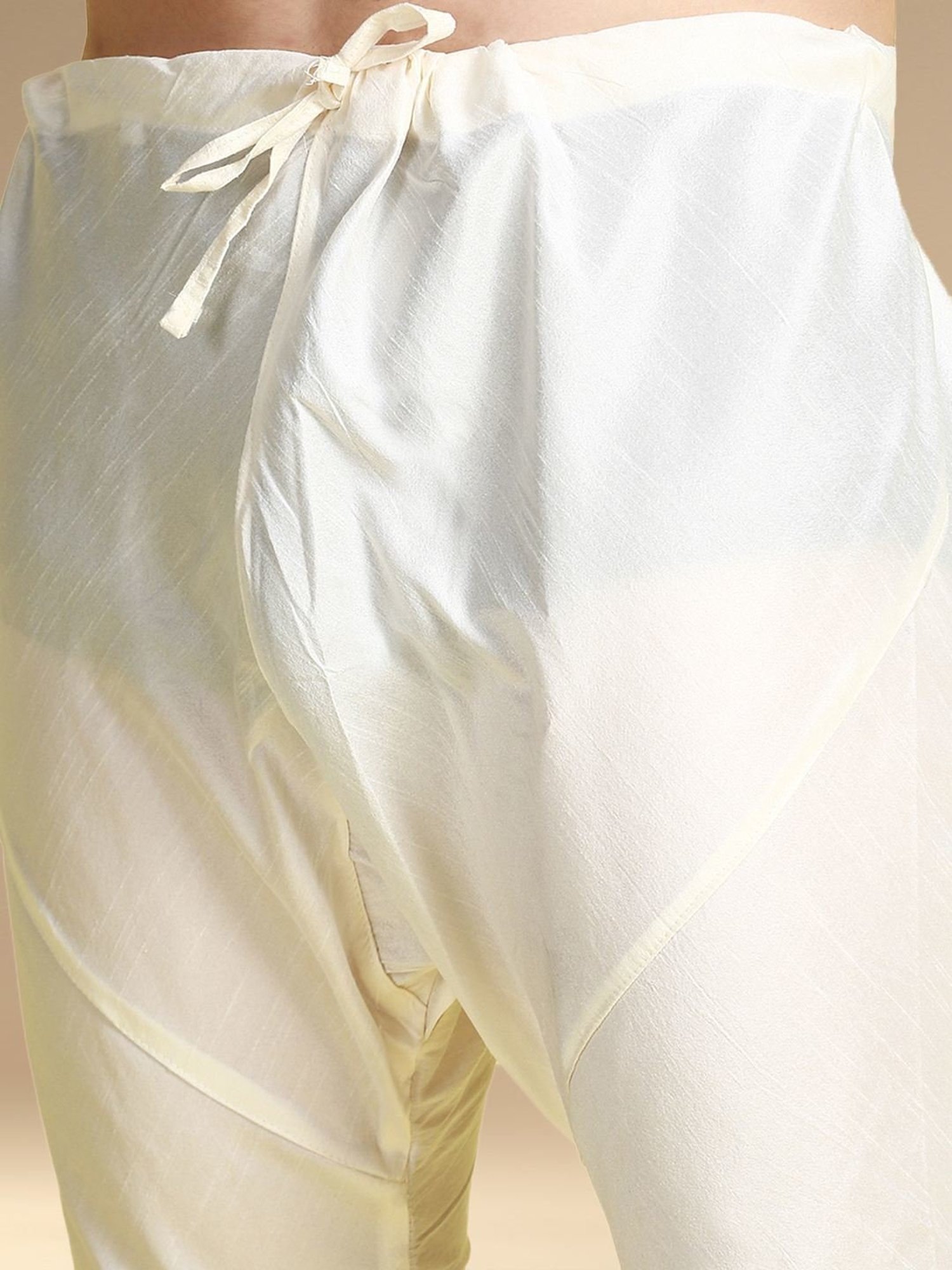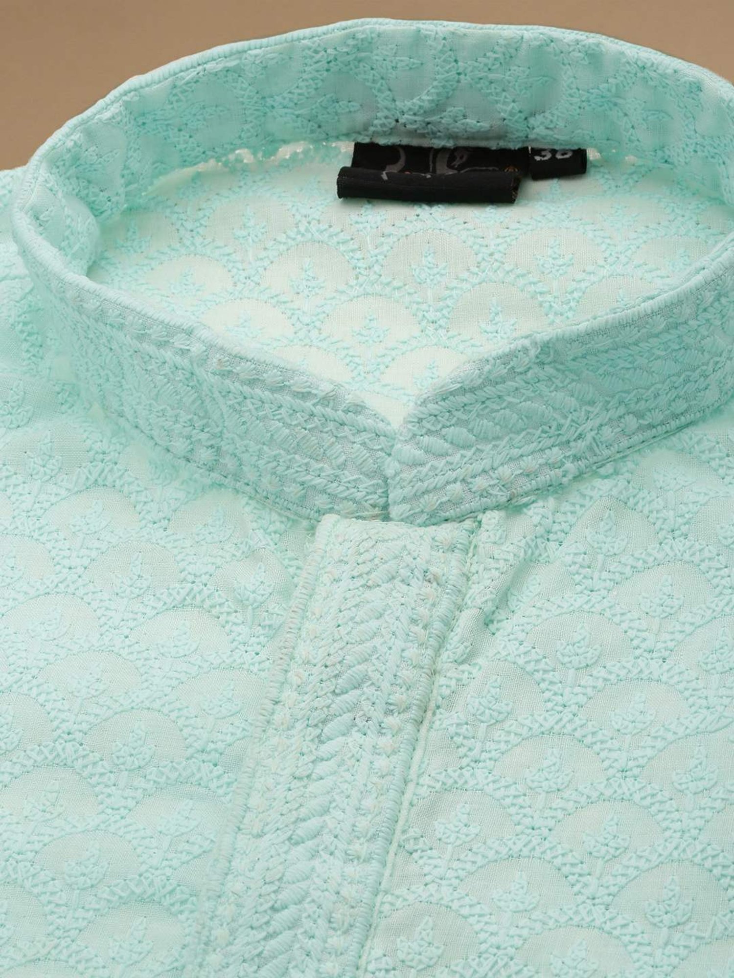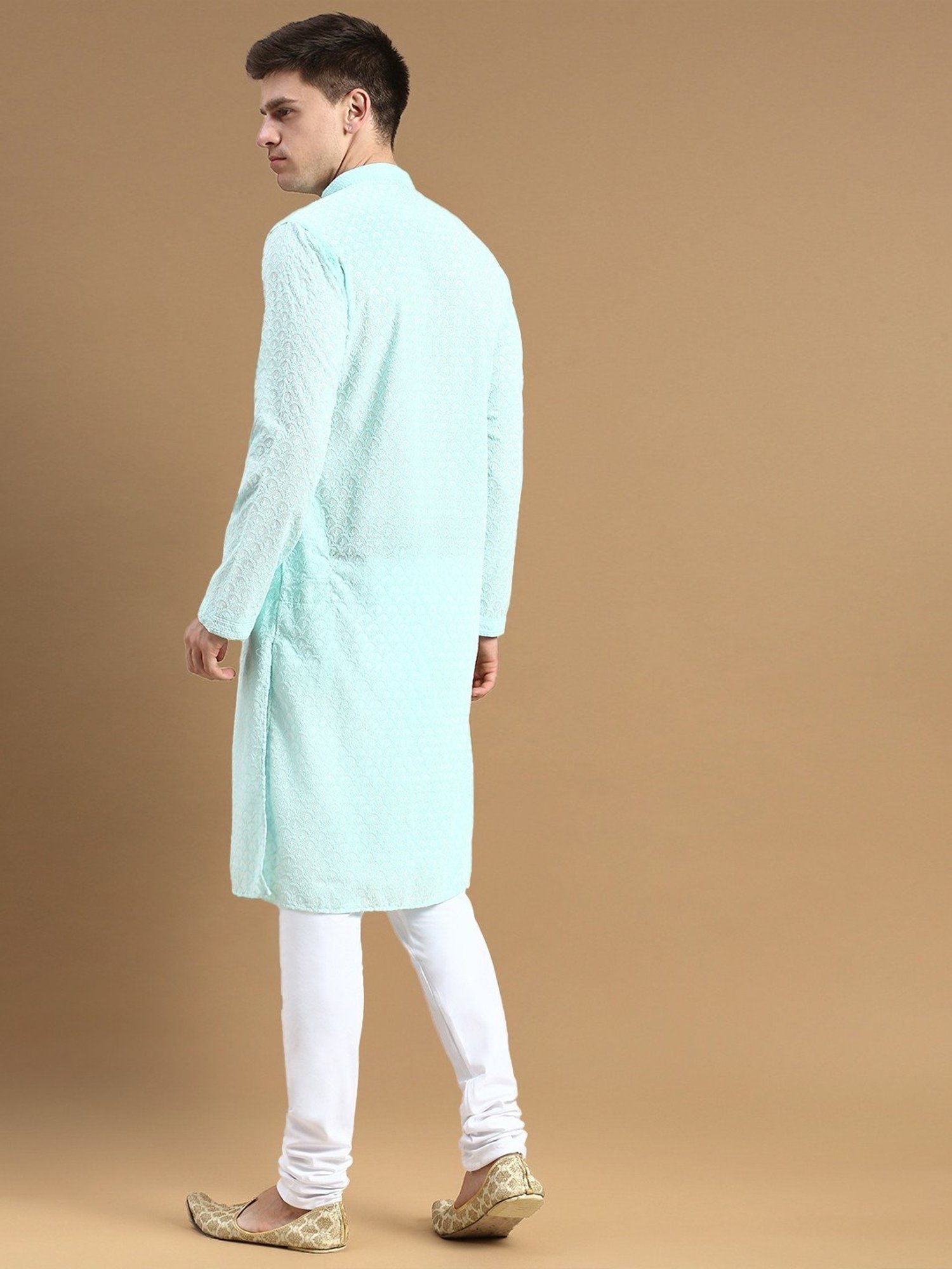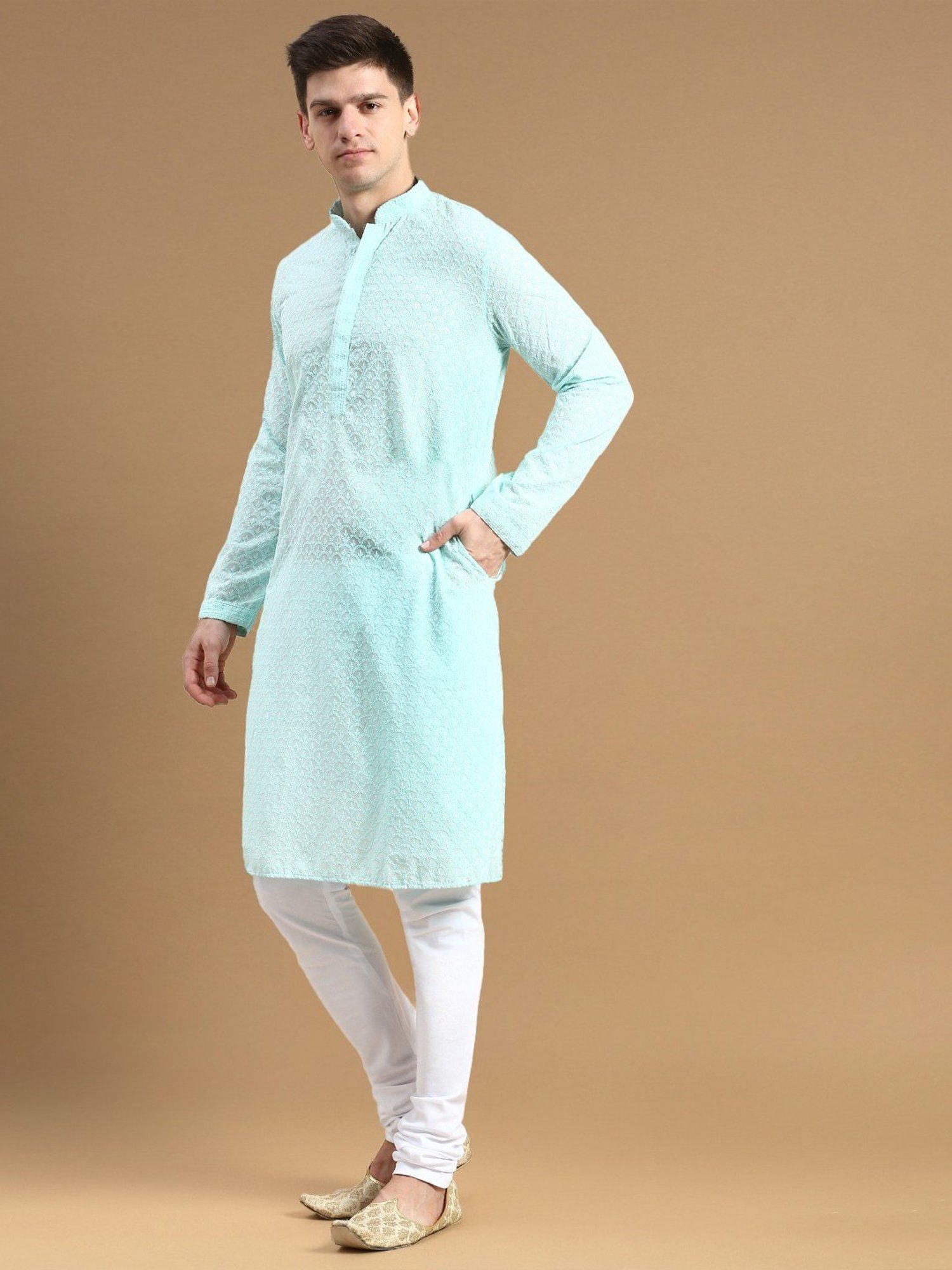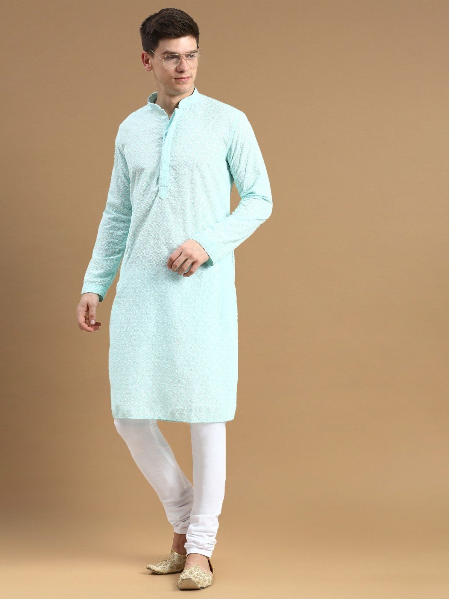 Get hold of an impeccable look by donning this sea green and white regular fit kurta bottom sets from Sanwara. Tailored to sartorial perfection from premium quality fabric, it assures a soft and soothing touch against the skin. The mandarin collar augments its design. Exuding full sleeves, it is sure to fetch you compliments from all.
