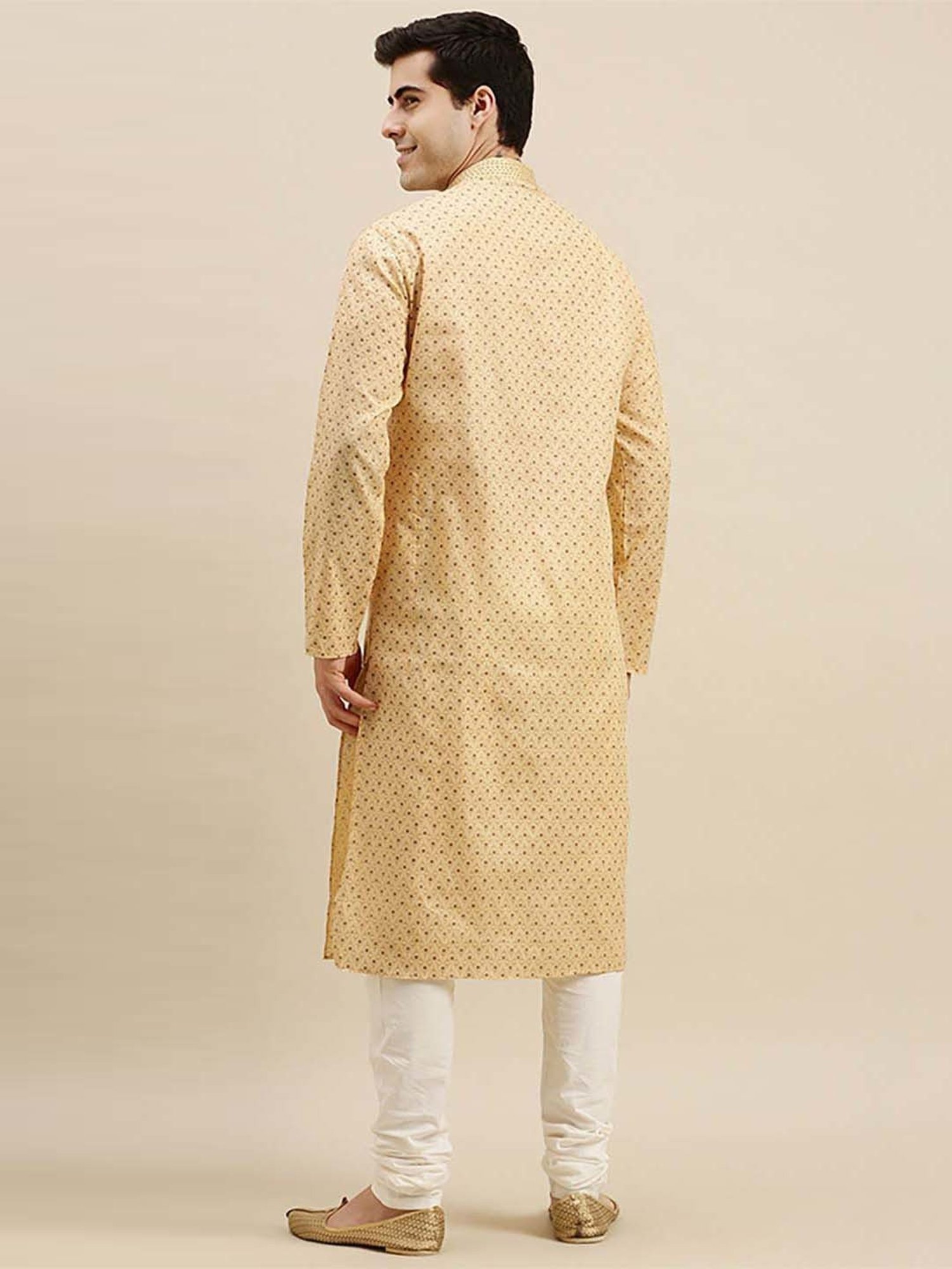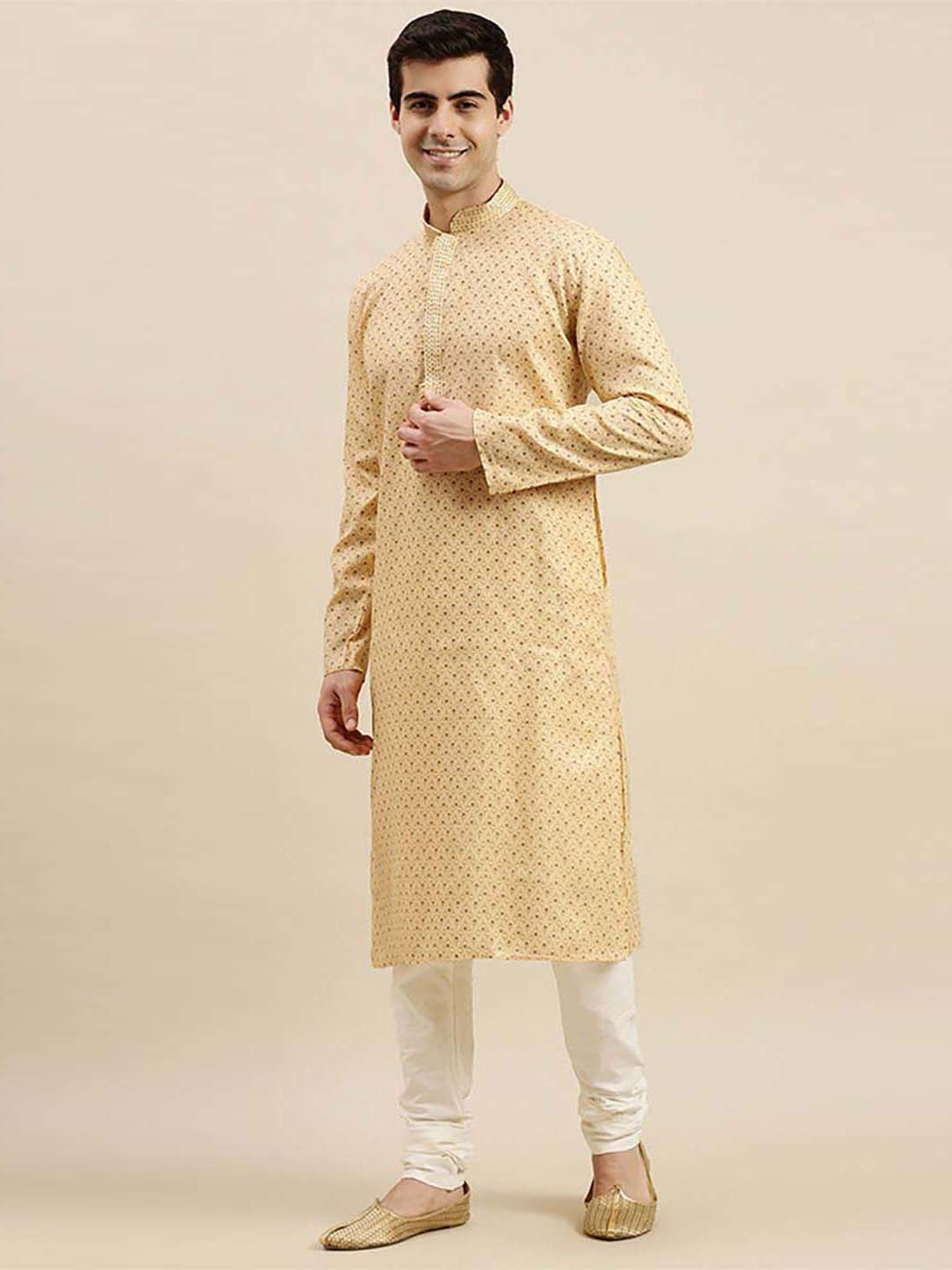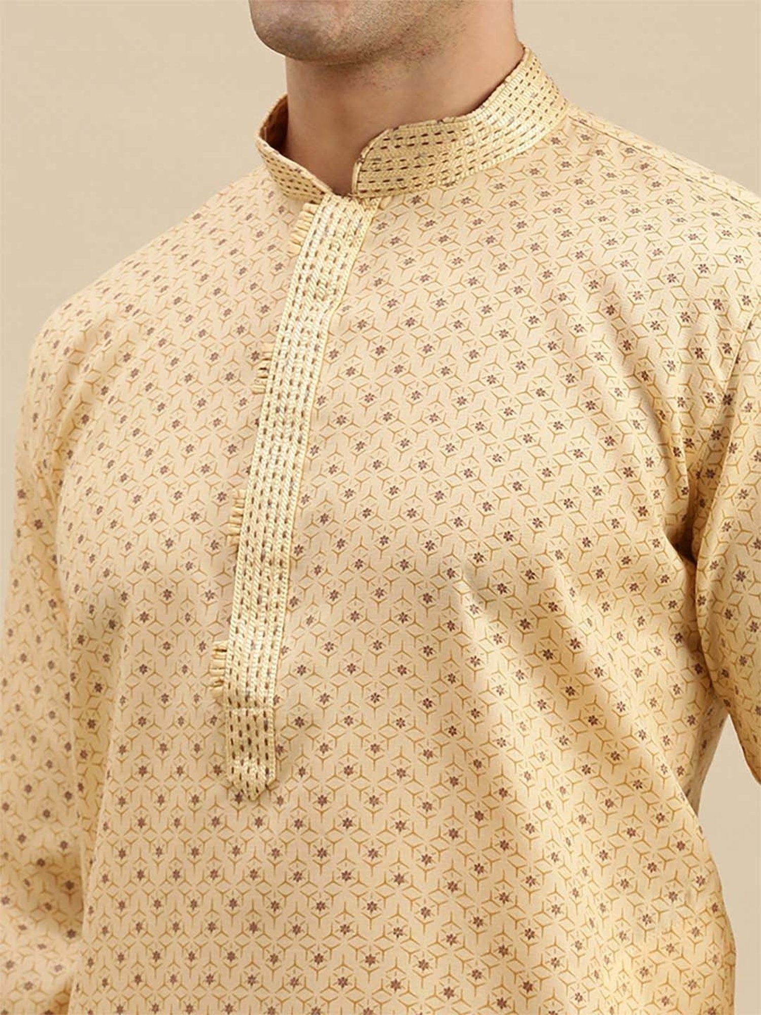 Astonish everyone with the rich look of this yellow and white regular fit kurta bottom set from Sanwara. Tailored to sartorial perfection from premium quality fabric, it assures a soft and soothing touch against the skin. The mandarin collar augments its design. Exuding full sleeves, it is sure to fetch you compliments from all. The printed pattern makes it a captivating choice.