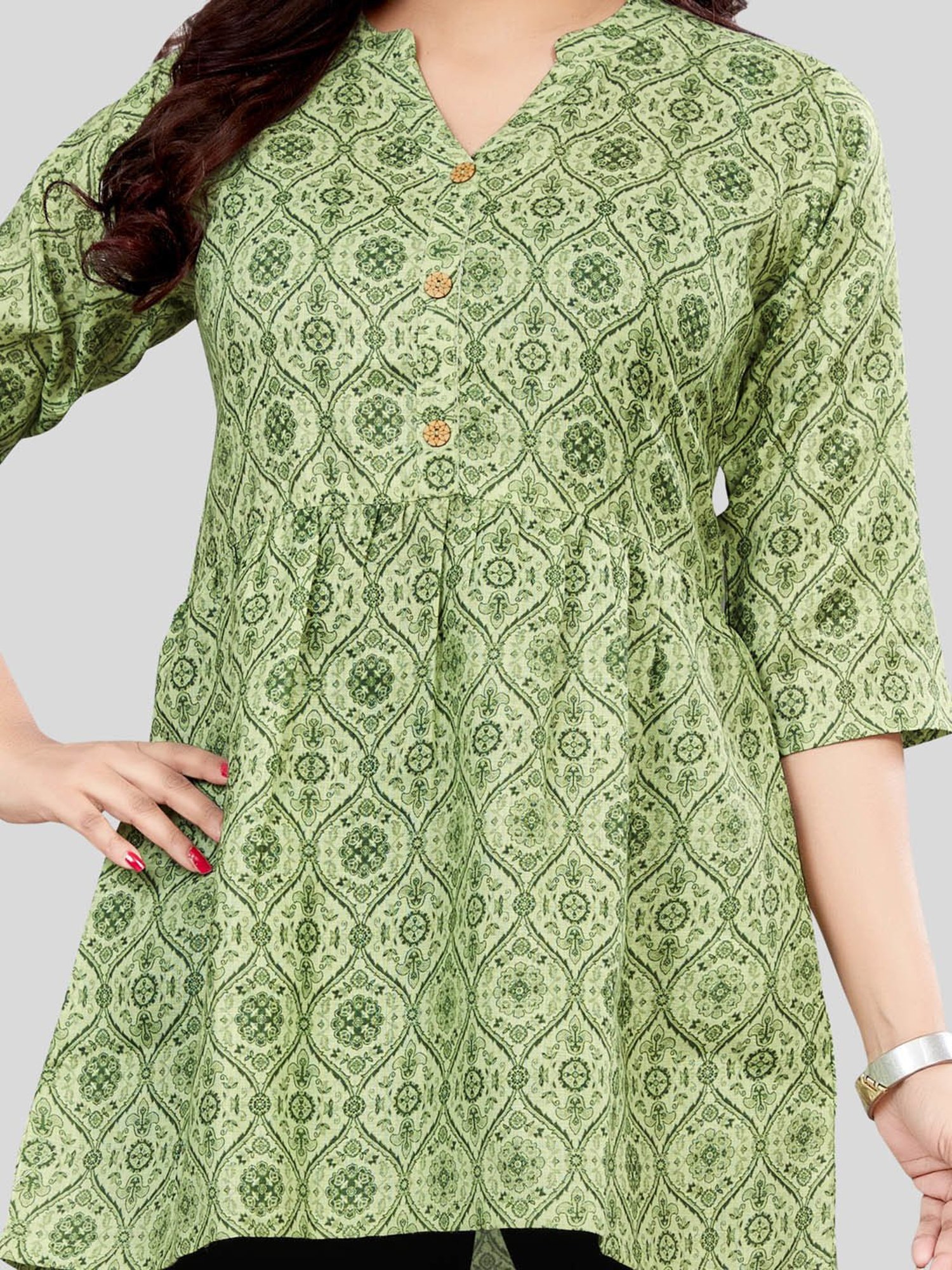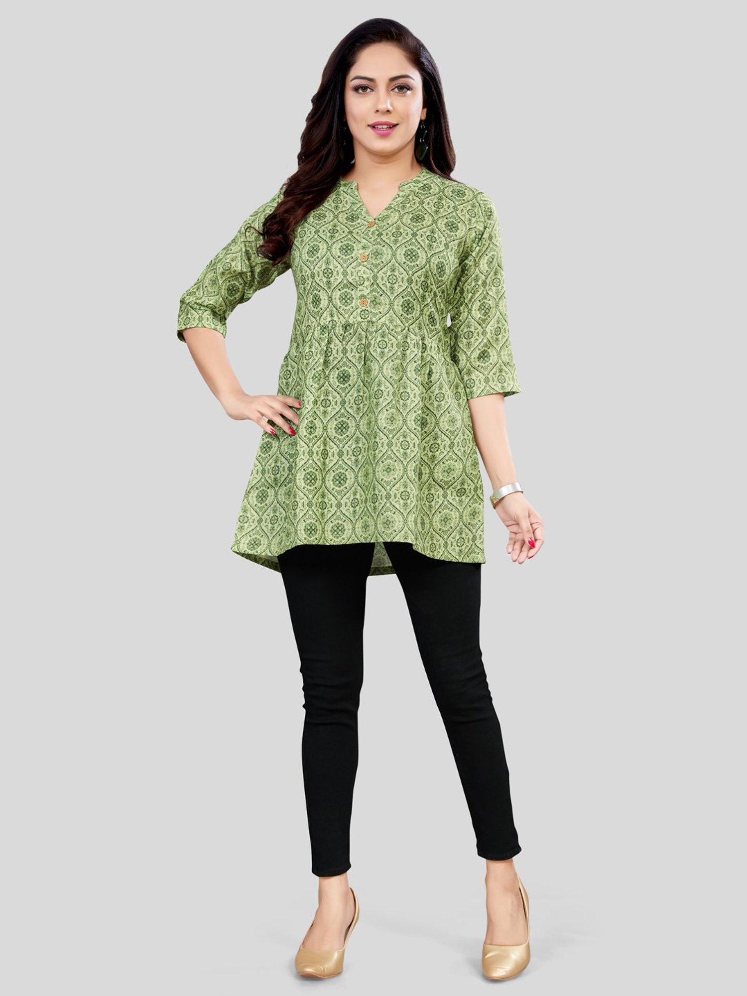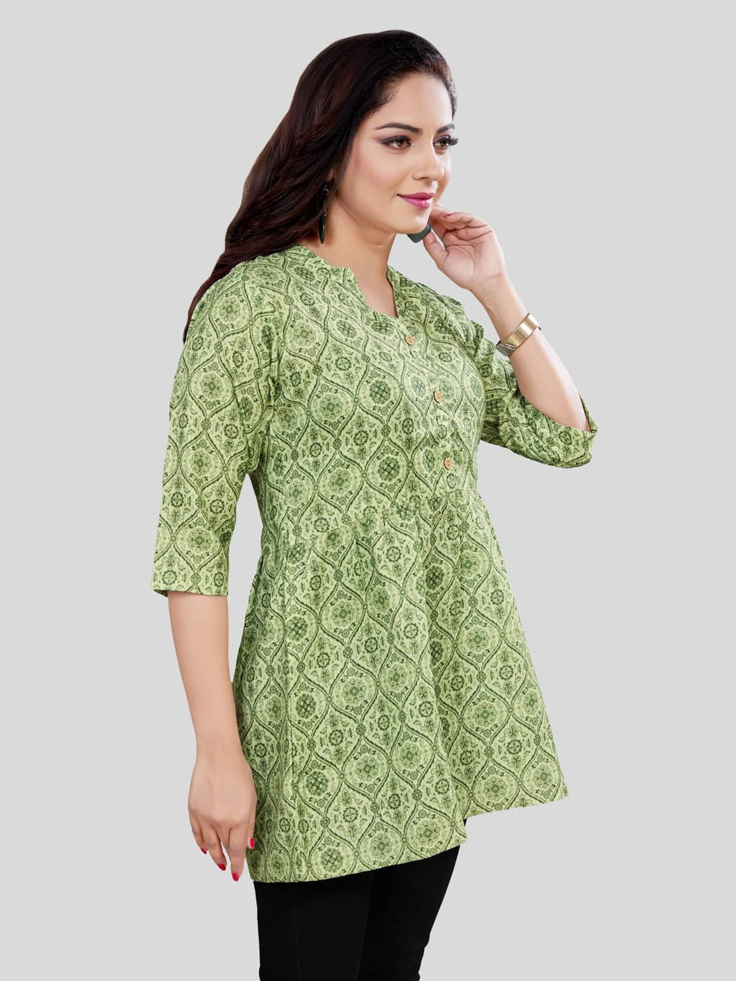 Stand apart from the crowd with this stunning green printed kurti from Saree Swarg. Masterfully crafted in fine cotton blend for the softest feel and unmatched drape, it is designed with a regular fit for some trendy fashion. Pair it with contrast bottoms and minimalist jewelry to look stellar.