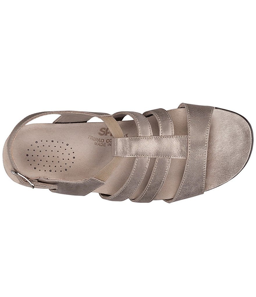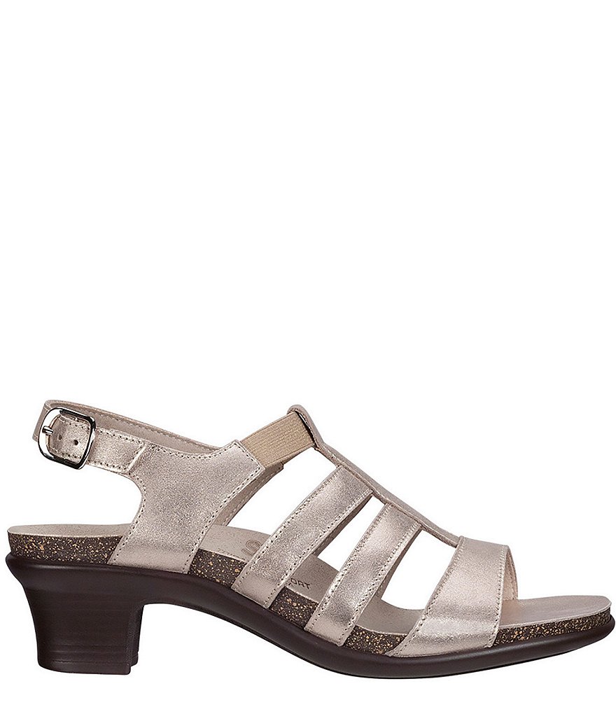 - Adjustable buckle with hidden stretch goring at the ankle for a secure custom fit Block heel for stability SAS Elegant, Contoured Comfort Foot Bed: An elegant contoured footbed with a soft Super Suedeâ„¢ cover is molded so the natural arches and curves of your foot are cradled in the sandal