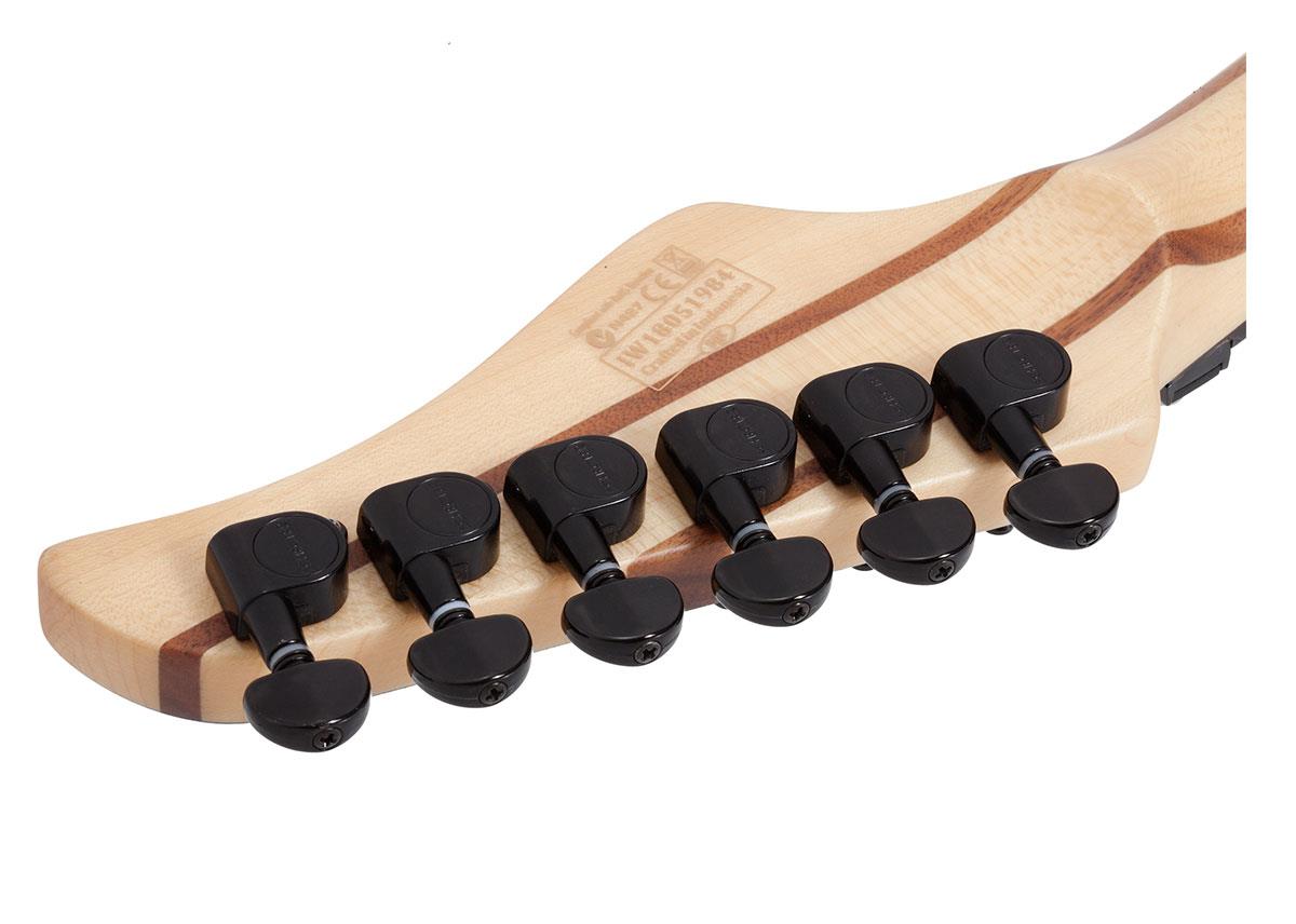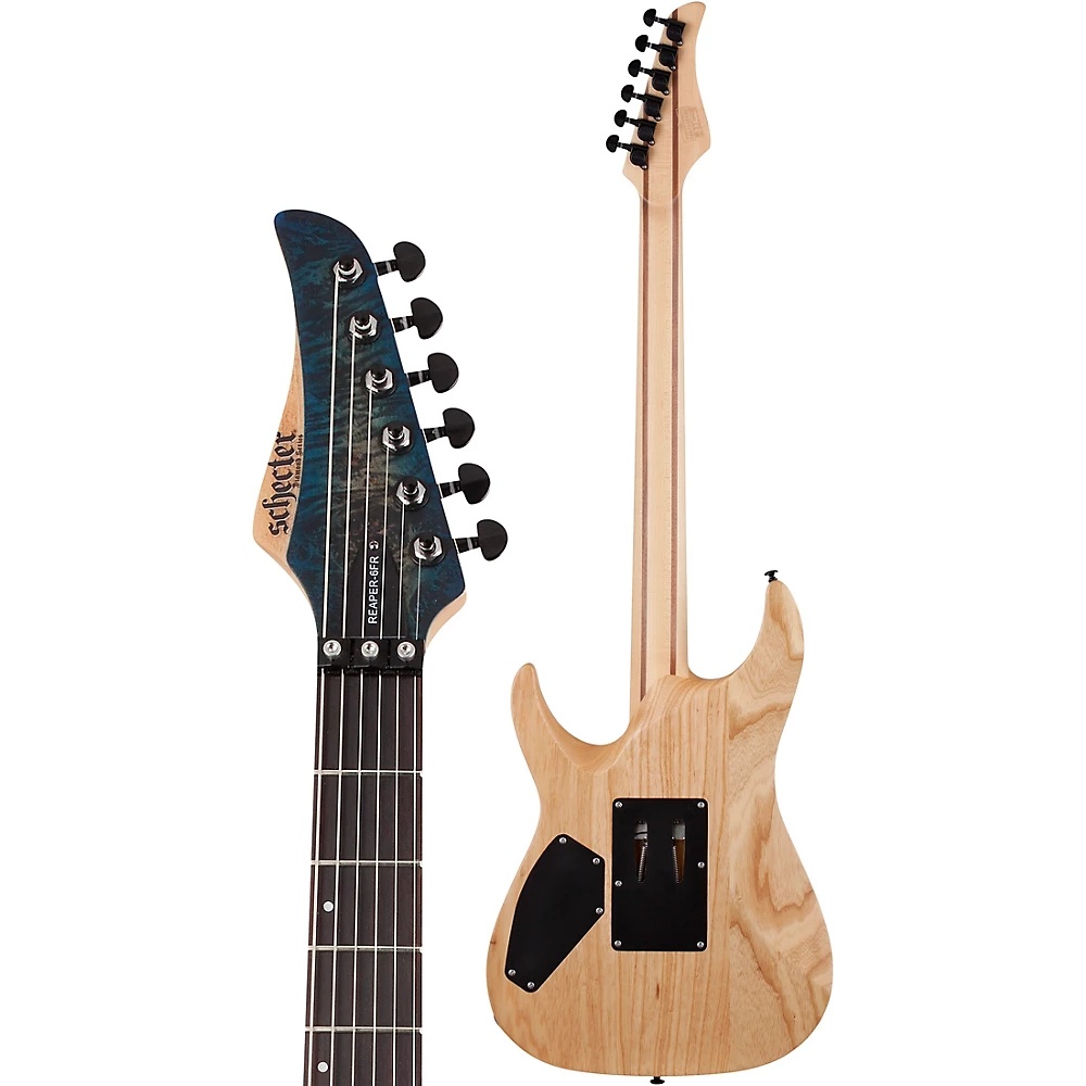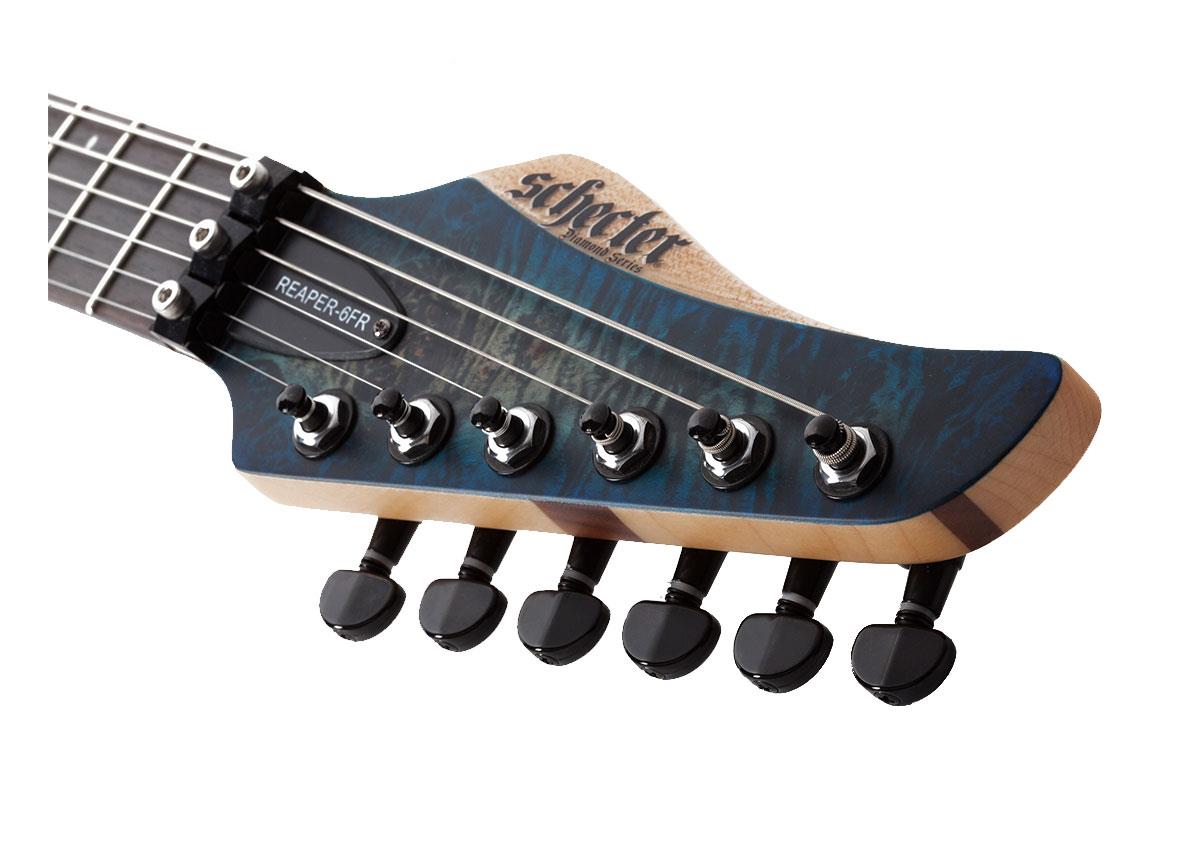 Sleek, sharp, and assertive, the new Reaper-6 from Schecter Guitars stands poised to be a killer at your next performance! A swamp ash body is mated to a poplar burl top, delivering resonant tonality and custom shop-level looks, and then paired to a deep-set and reinforced 25.5 ” scale, 5-ply maple/walnut ultra-thin "C" neck with ebony fretboard. Once you strap this beast on, you’ll notice how the extensive body contouring and Ultra-Access neck carve ensure ergonomic comfort and effortless riffing through the most-demanding sets. Upon plugging it into your rig, everyone in your neighborhood will appreciate how the face-meltingly high-output Schecter Diamond Decimator pickups still cut through the mix like a scythe, yet remain versatile enough to be at home in nearly any sonic territory.