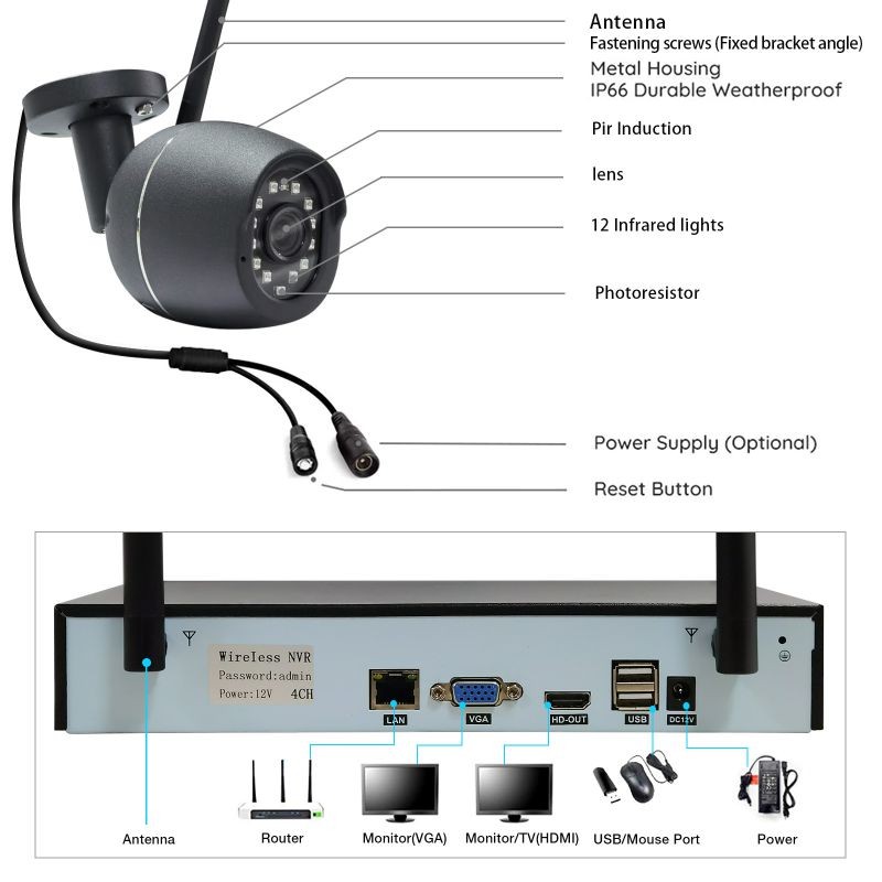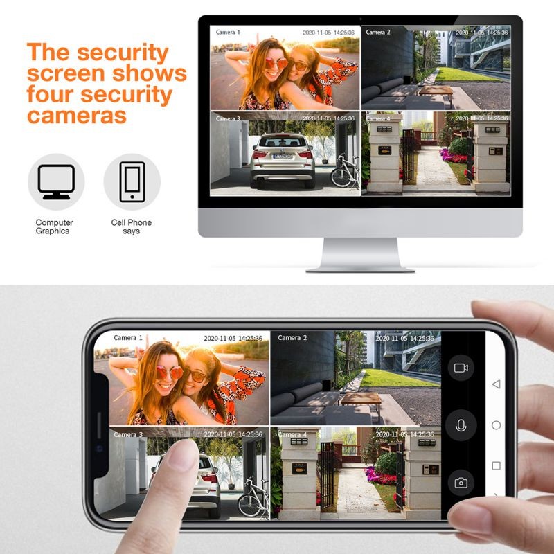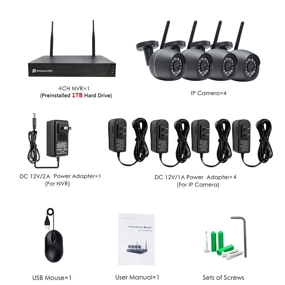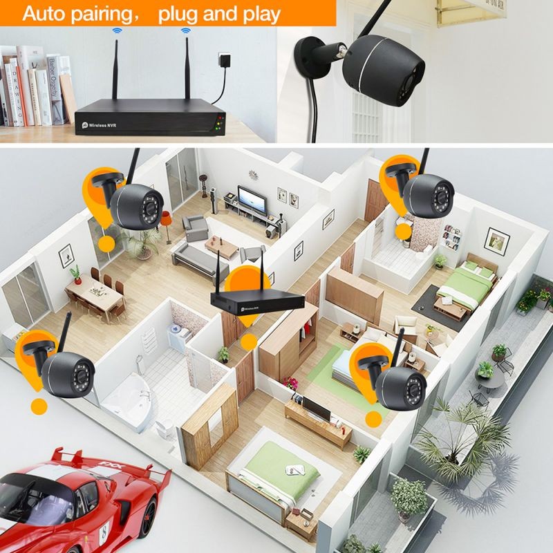 1). Plug & Play Easy Setup: This wireless security camera system are paired with the NVR system at manufacturing site, it is plug to play, just follow the instruction to connect NVR, monitor and security camera, then you can see live video (One screen can watch four cameras at the same time, The same goes for mobile phones), no complicated process of connecting wifi and configuring wifi, 100% connection success rate.
