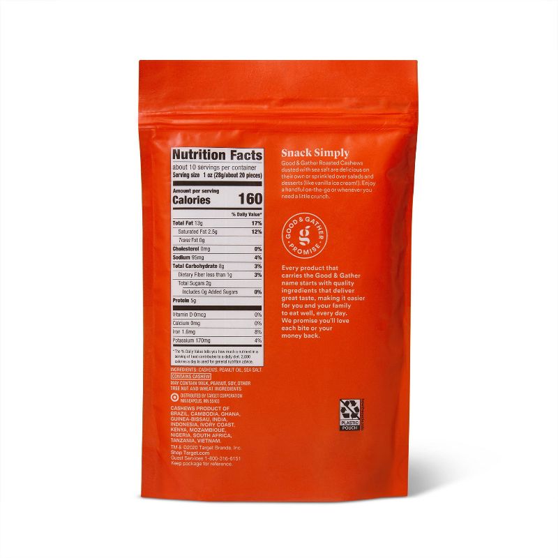 This pouch of Sea Salt Roasted Whole Cashews from Good & Gatherâ„¢ makes it easy for you to keep your favorite snack on hand at home, at work or on the go. These kosher whole cashews are roasted with a touch of sea salt to create the perfect tasty treat for keeping at your desk or putting out for a gathering of friends or family. Whether you're looking to create a selection of mixed nuts or simply enjoy your favorite snack, these roasted sea salt cashews make the perfect pick with their reclosable pouch for lasting freshness.