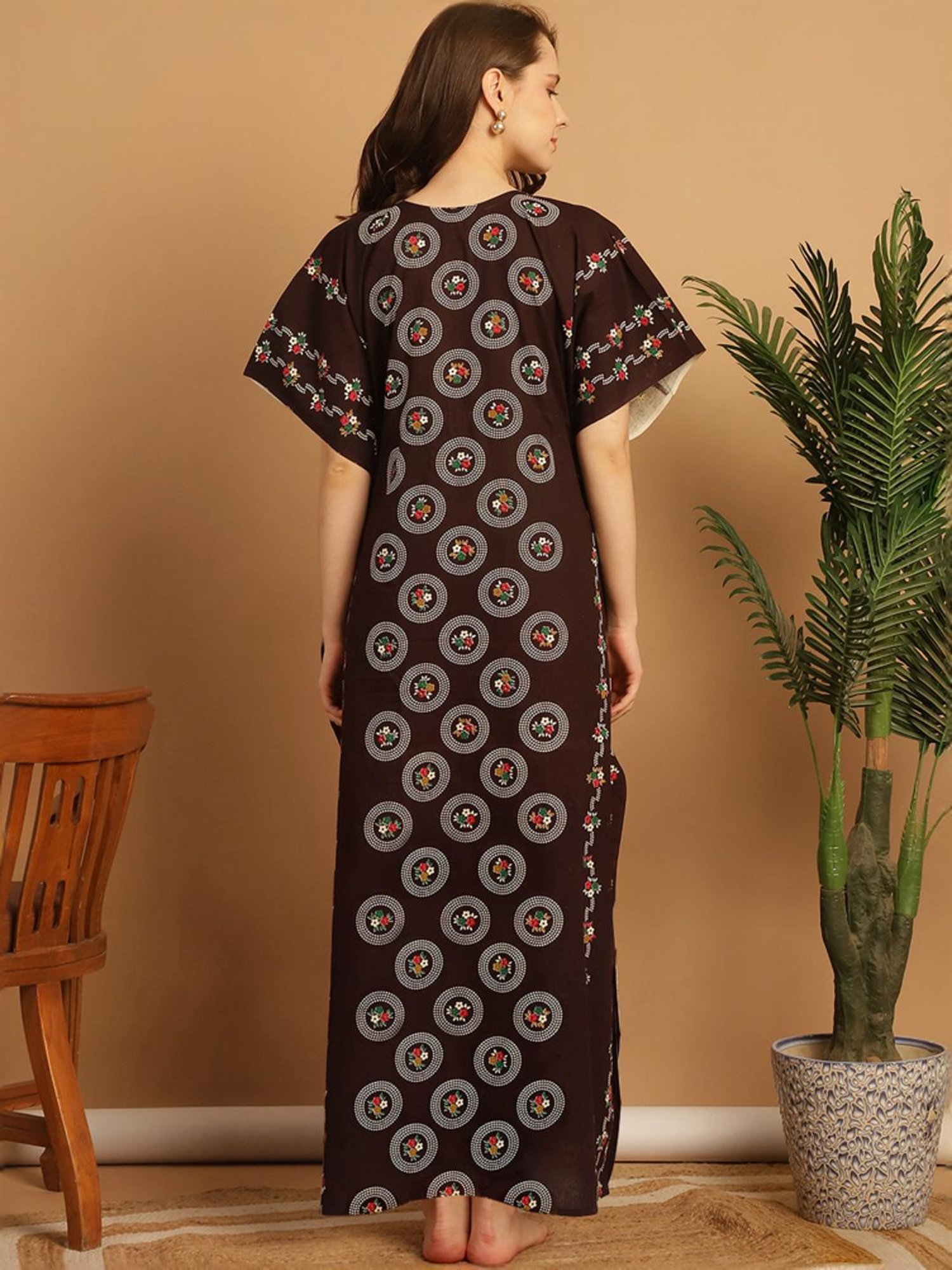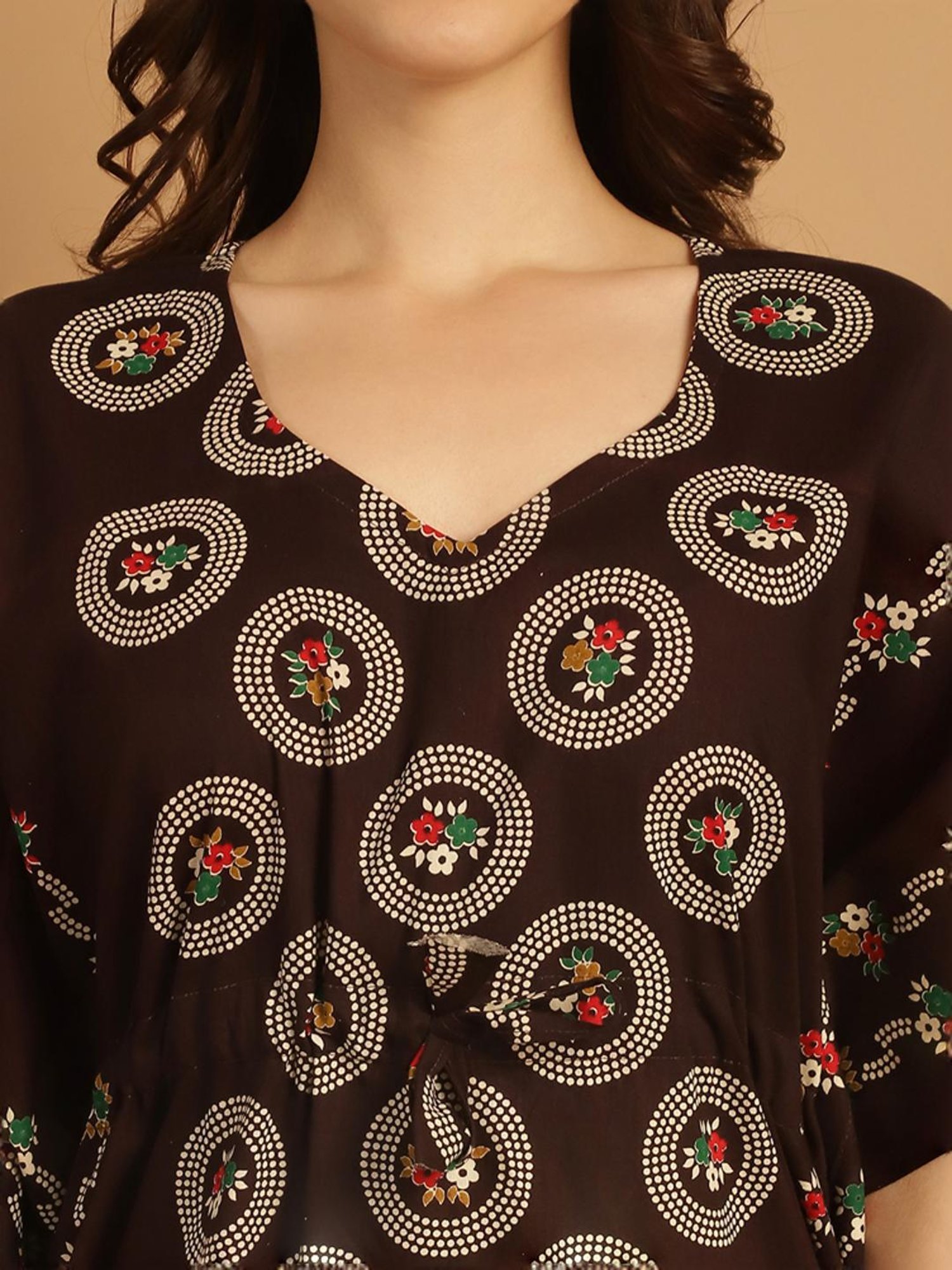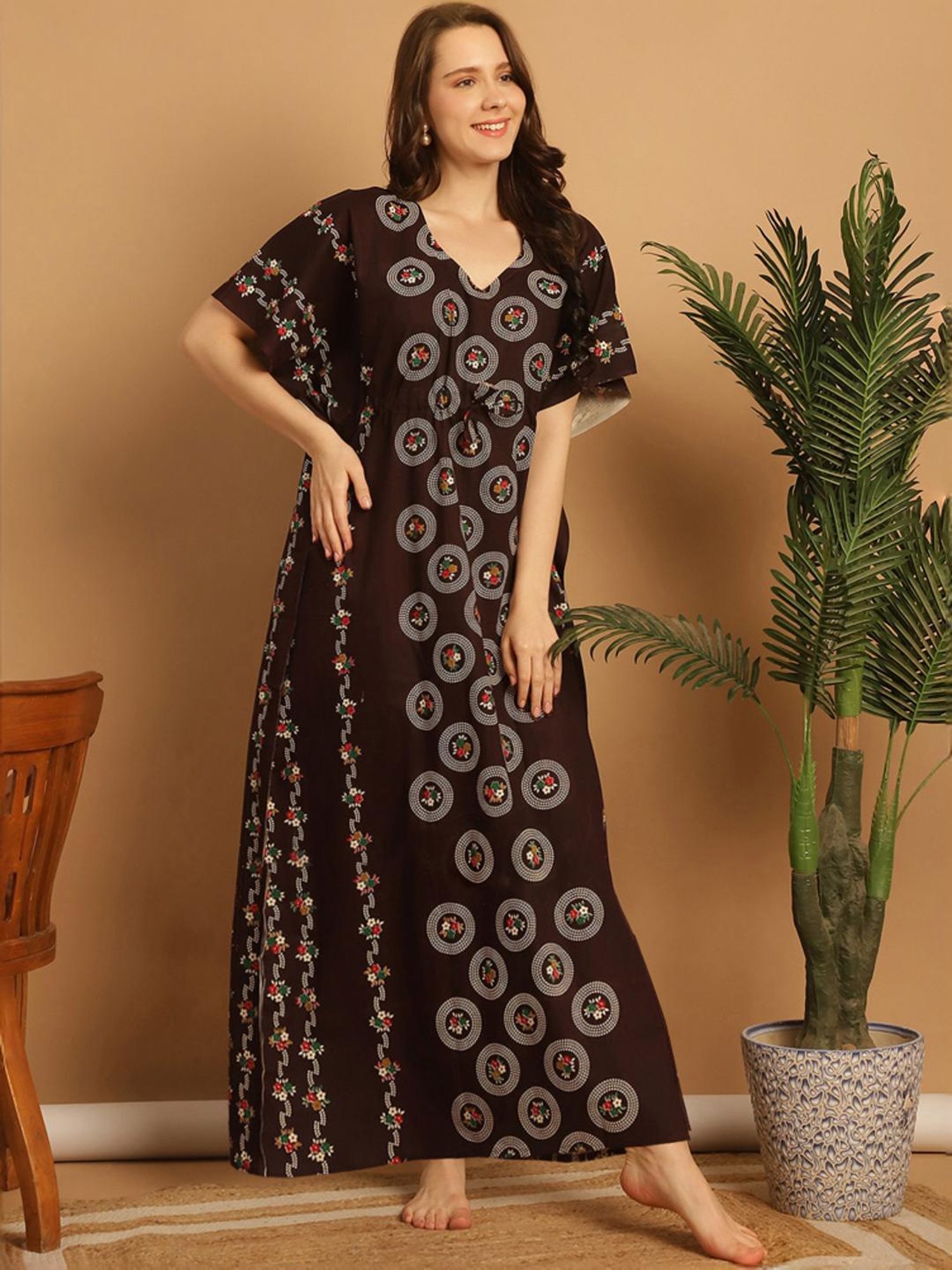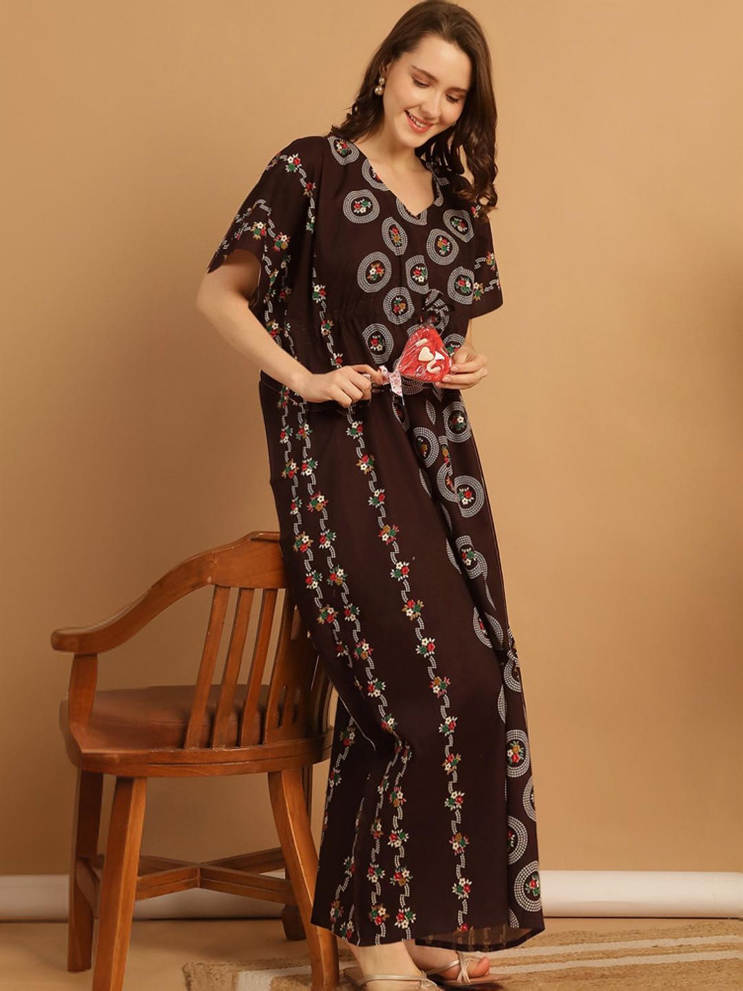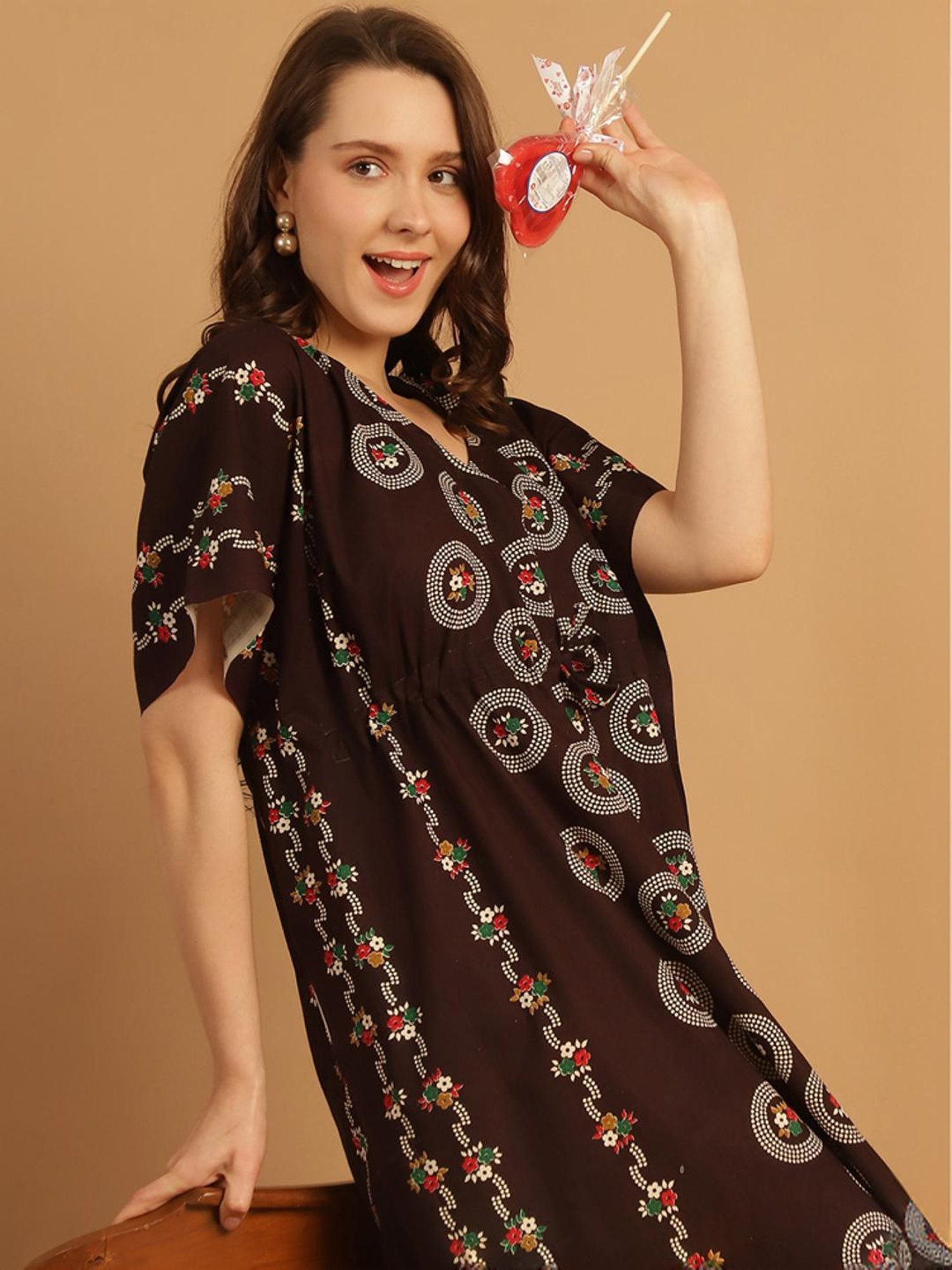 Elevate your sleepwear wardrobe with this brown kaftan from Secret Wish. Tailored to sartorial perfection from premium quality fabric, it assures a soft and soothing touch against the skin. The V-neckline adds to its appeal. The floral print makes it a bewitching choice.