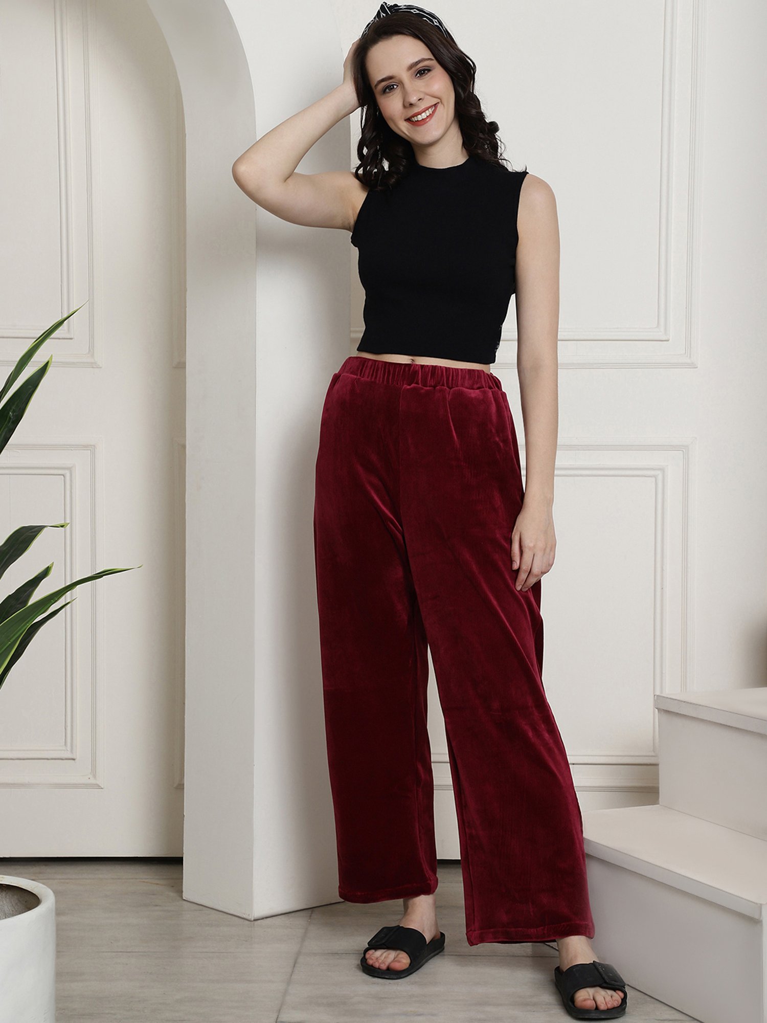 Consider your recharge hours sacred and make them as comfortable and relaxing as possible with these cool maroon lounge pants from the latest range of Secret Wish. Beautifully tailored in prime quality velvet for a stellar combination of a soft and lightweight feel, good absorption and fine ease of wear, their well designed silhouette offers apt room for movement while the pleasing color-block pattern gives them a fun edge. Prepare for some cool hours and deep sleep!