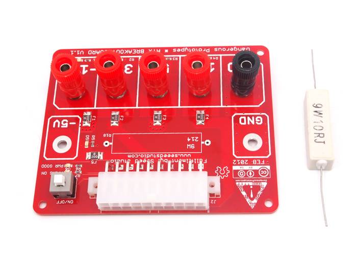 Description Recycle an ATX computer power supply into a beefy bench tool that powers your projects. The ATX breakout board routes the -12, 3.3, 5 and 12 volt ATX outputs to screw terminals, each protected by a 1.25 amp resettable polyfuse. These four voltages cover many common electronics needs, there's even a negative voltage (-12 volts) for op amps and audio projects. An on/off button and a control circuit are included on-board, no modifications to the ATX supply are needed. Features -12, 3.3, 5, 12 volt supplies @ 1.25 amp 1.25 amp polyfuses with reset on each power rail Indicator LEDs show that each rail is working Power good and enabled indicator LEDs On-Off button and control circuit Optional load resistor included but NOT soldered Open source (CC