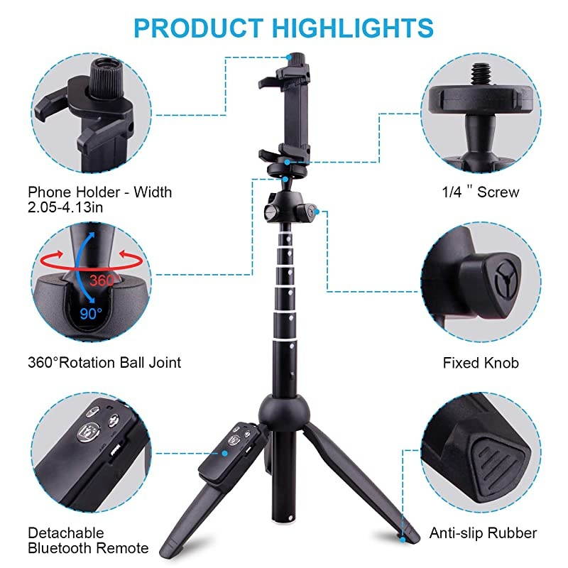 Package Included: 1 x Phone Tripod with 1/4 Screw Ball Joint 1 x Cell Phone Holder 1 x Remote Controller 1 x Micro