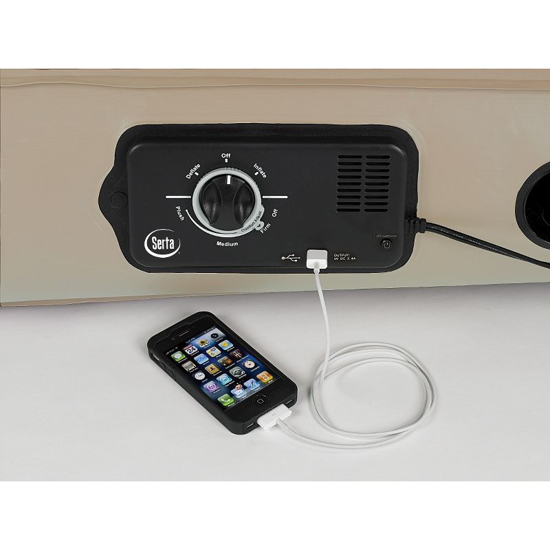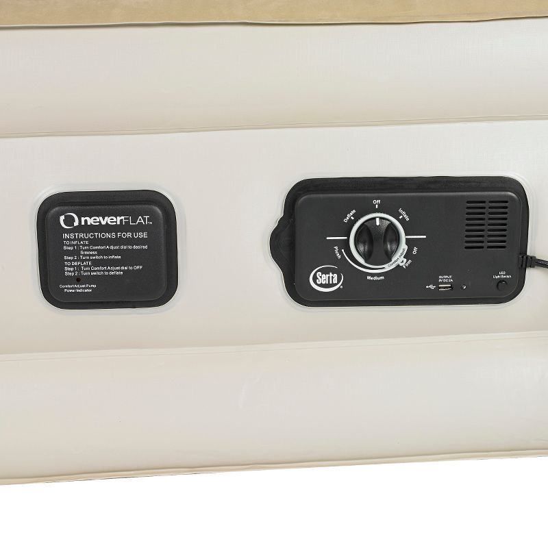 The Serta Raised Air Mattress with Never Flat technology makes getting into and out of bed easier and is your solution for a bed on the go. Able to maintain its pressure throughout the night, Never Flat eliminates sagging and loss of air pressure that is so common in airbeds. Never Flat technology is an auto-engaging, whisper quiet pump that maintains constant air pressure throughout the night for an undisturbed, continuous night's rest that is never flat. Choose your desired comfort level--Plush, Medium, or Firm--and let the powerful Primary Pump inflate the bed. Once inflated, the Secondary Pump continuously monitors and senses when it needs to silently engage in order to maintain the chosen comfort level throughout the night. The powerful, integrated primary pump enables effortless inflation and deflation of the air bed and the automatic shut-off feature turns the Primary Pump once the bed is fully inflated or deflated, allowing you to turn on the pump and walk away without worrying about the pump getting burned out. Integrated nightlight offers visibility at night, and built-in USB port conveniently charges your phone or tablet while keeping it at your side overnight. Store the air bed in the convenient carry bag for your next overnight guest.