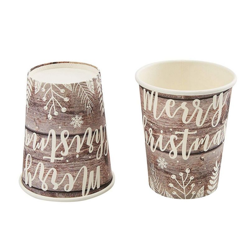 • Christmas Party Supplies: The rustic paper plates, napkins, and paper cups feature a wood plank design with text that states merry Christmas; ideal for creating a celebratory atmosphere for your upcoming holiday party