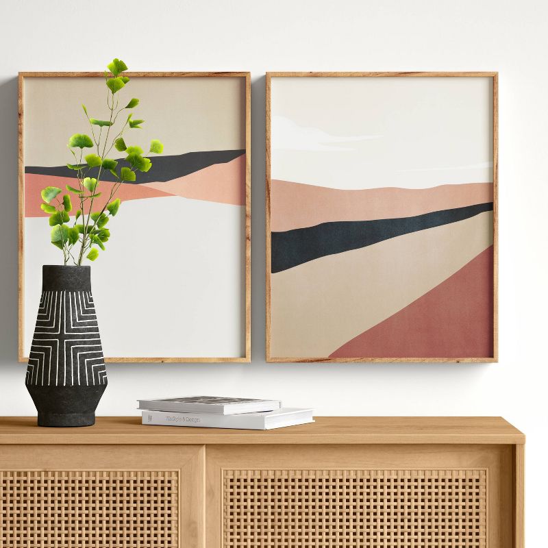 Liven up your living spaces with the (Set of 2) 16" x 20" Desert Road Abstract Framed Wall Art from Project 62. This simple wood-framed work can add an artsy touch to your surroundings. They show desert road patterns painted in a watercolor-style that'll fit right into your living space. Put this up on an empty patch of wall or prop it up on your mantelpiece or desk.