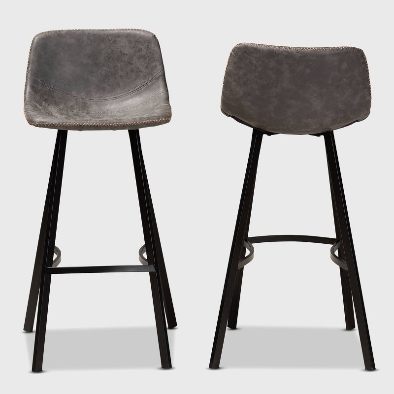 Add timeless style to your space with the Tani bar stool. Upholstered in a distressed gray and brown faux leather, the Tani features a wide, curved seat for the utmost comfort. Contrast stitching and whip stitching spruce up the rugged faux leather. Black metal legs provide solid support and give the Tani a cool industrial vibe. The Tani bar stool is made in China and requires assembly. Dimensions: 37.4" High x 19.29" Wide x 19.88" Deep; Seating Dimensions: 16.14" Wide x 12.99" Deep x 28.35" High (from Floor); Back: 9.06" High; Legs: 28.35" High;