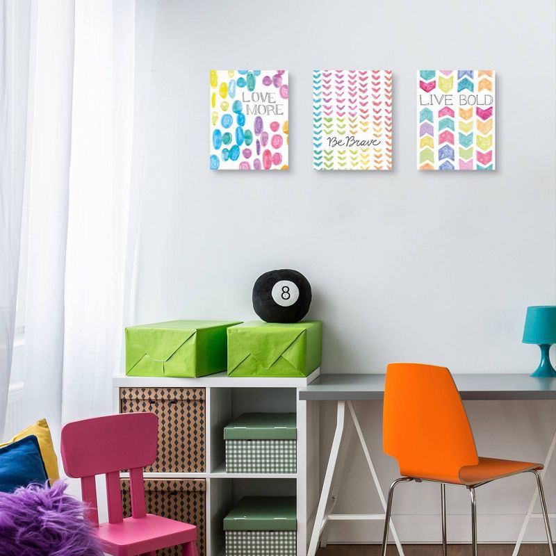 Dozens of rainbow-colored hearts, polka dots and arrows line up in neat rows on this set of darling canvas prints by artist Lottie Fontaine. While one canvas urges you to "be brave" and "love more", the other reminds you to "live boldy"—both serving as a welcome reminder when the going gets tough.