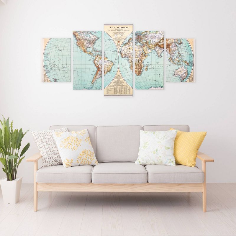 •Ready to hang world map canvas set includes five individual stretched canvas pieces