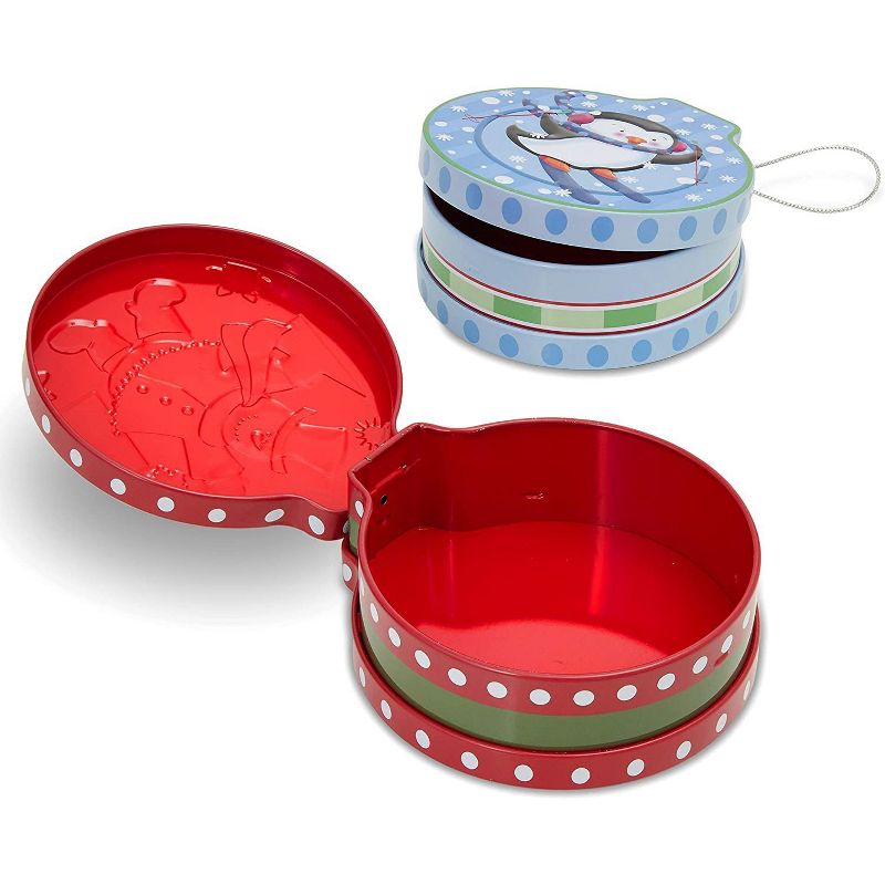 • HOLIDAY PRINTS AND PATTERNS: Get 6 assorted ornament-shaped tin containers with hanging loops and animated prints of Santa Claus, a snowman, a penguin, a big Christmas tree, deer and an ornament